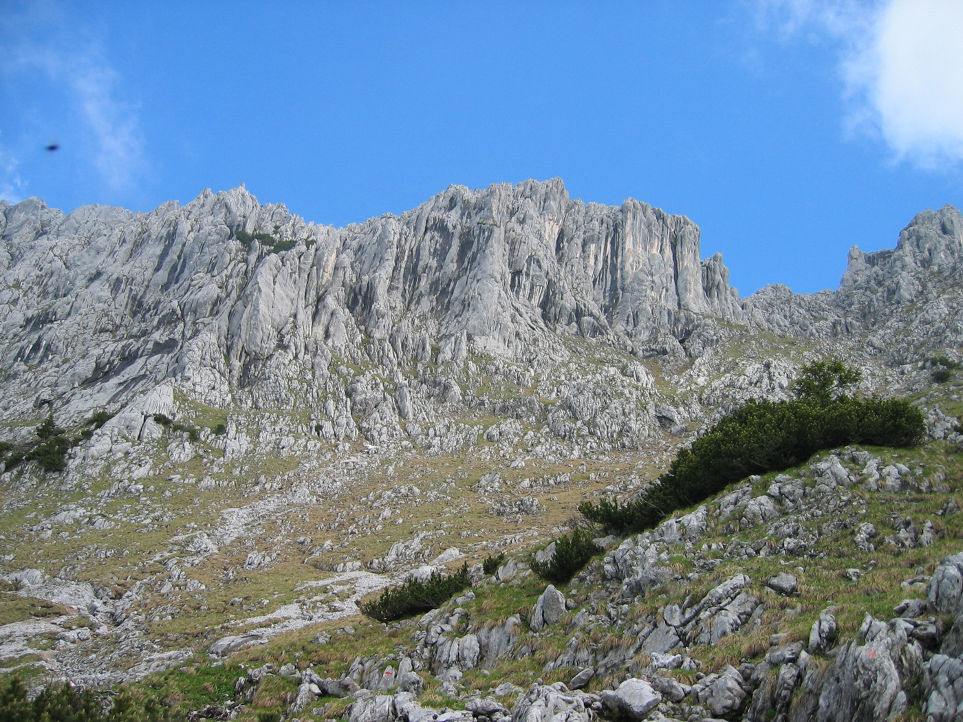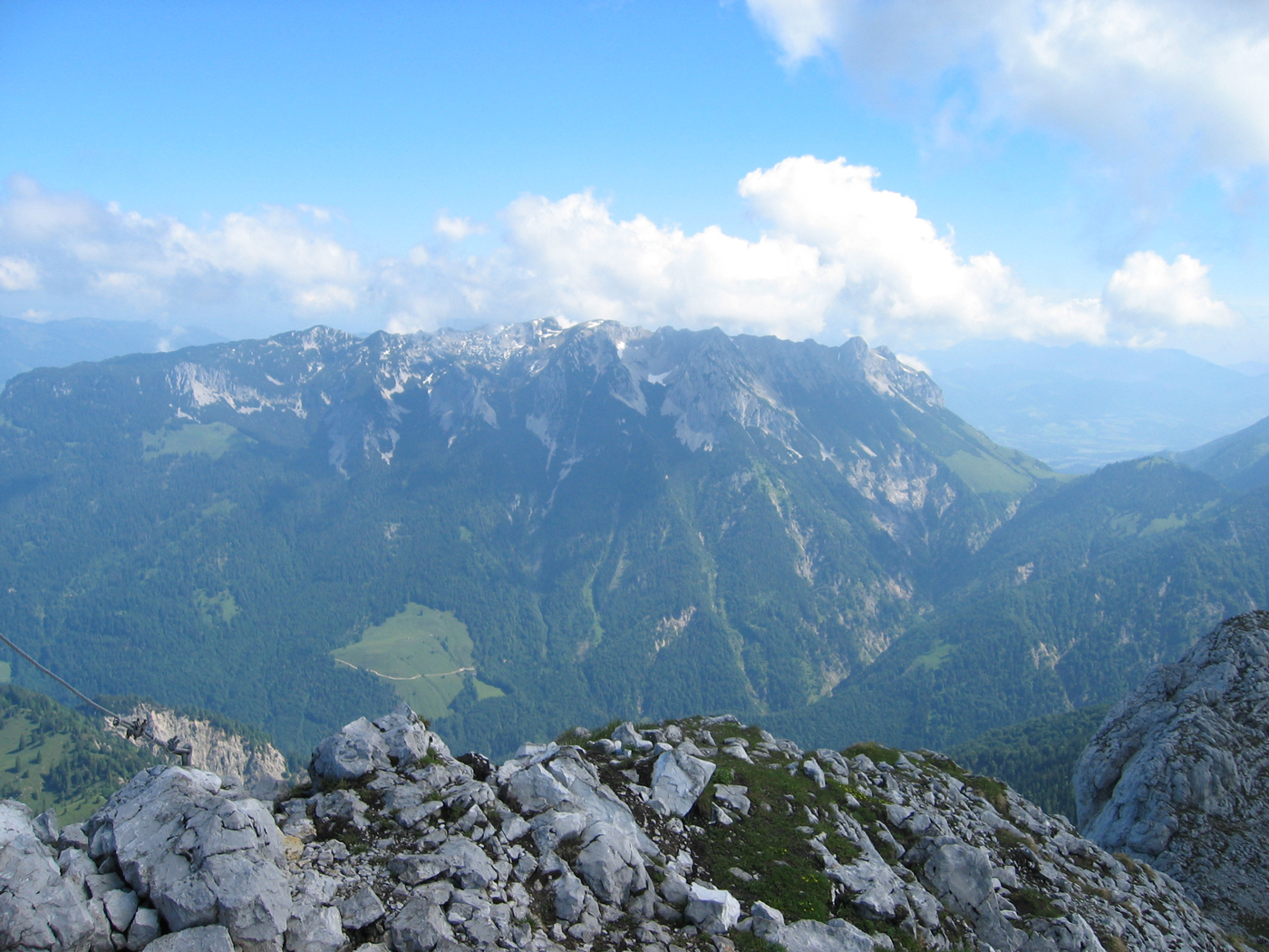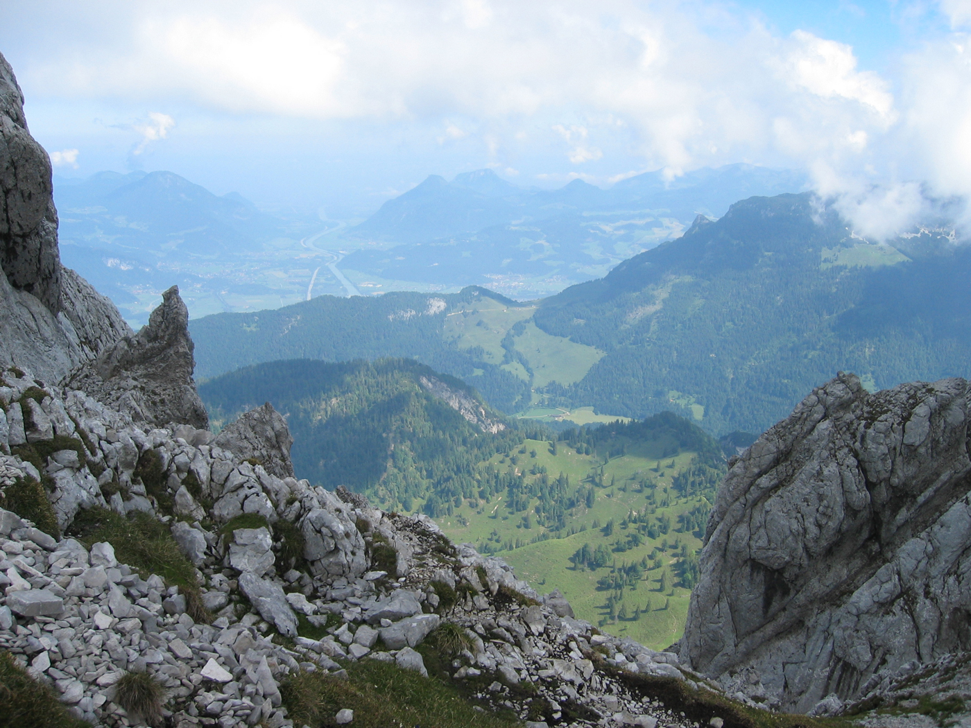 Eine sonntägliche Tagestour soll meine Durchquerung des Wilden Kaisers abschließen, die ich im letzten Jahr nicht mehr ganz geschafft habe. Früh am Morgen fahre ich über die Inntalautobahn nach Scheffau, um mein Auto dort abzustellen. Auf einfachen Almwegen steige ich auf zur Kaiser-Hochalm, dem Anschlusspunkt der letztjährigen Tour. Den Gipfelaufstieg zum Scheffauer kenne ich schon von einer früheren Unternehmung, 25 Jahre ist es her! Die Aussicht allerdings war damals im September 1980 eindeutig besser, heute ist die Luft etwas diesig.