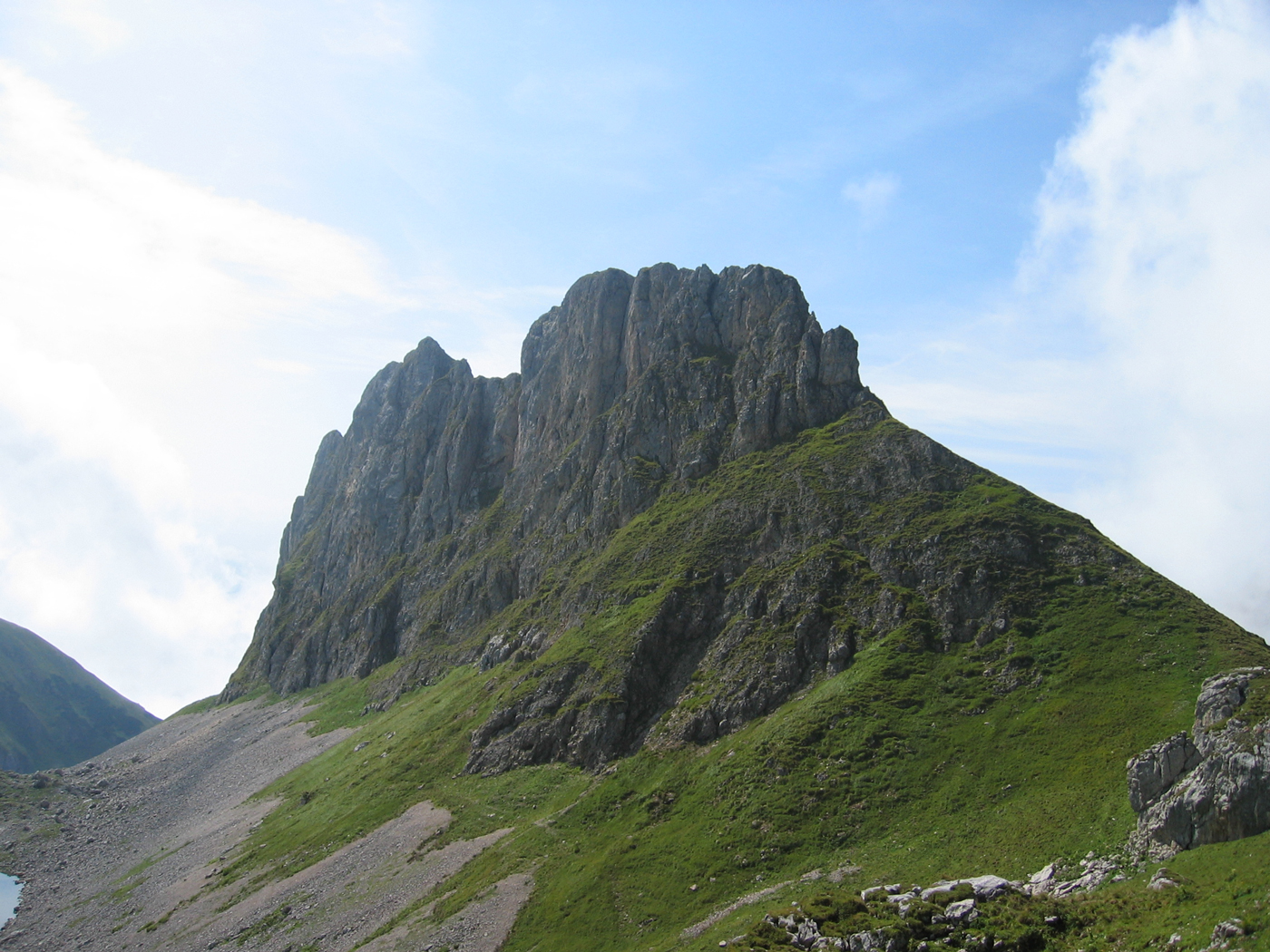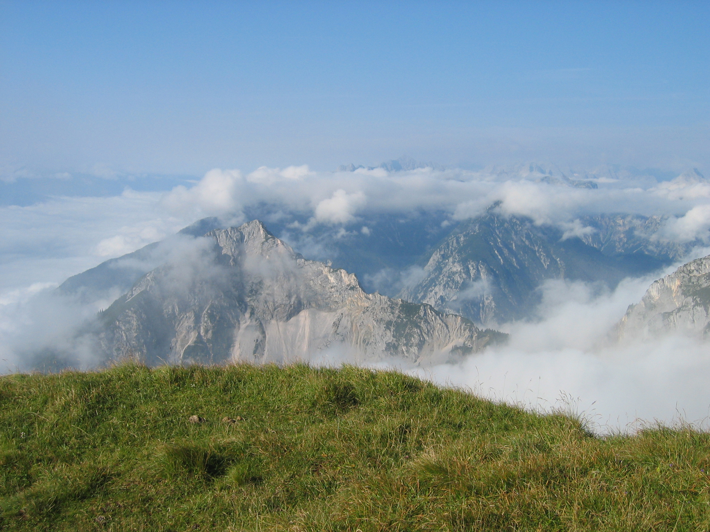 Wie angekündigt, ein Tag mit wunderbarem Wetter! Der Weg von der Bayreuther Hütte zum ersten Gipfel, dem Vorderen Sonnwendjoch, ist fast ein gemütlicher Spaziergang. Ohne großen Höhenverlust geht es weiter auf dem Steig zum Sagzahn, einem beeindruckenden Felsgipfel. Im Abstieg nehme ich den "Klettersteig", der sich als recht problemlos erweist. Man könnte die Schwierigkeiten aber auch auf einem einfacheren Weg umgehen. Der nördliche Nachbargipfel, die Rofanspitze, ist mit seinem Grasplateau wie geschaffen für eine längere Rast.