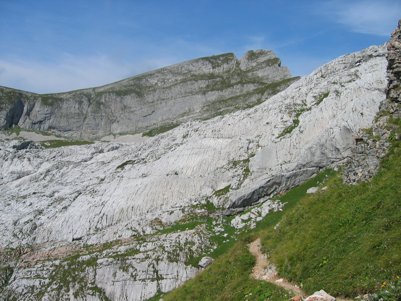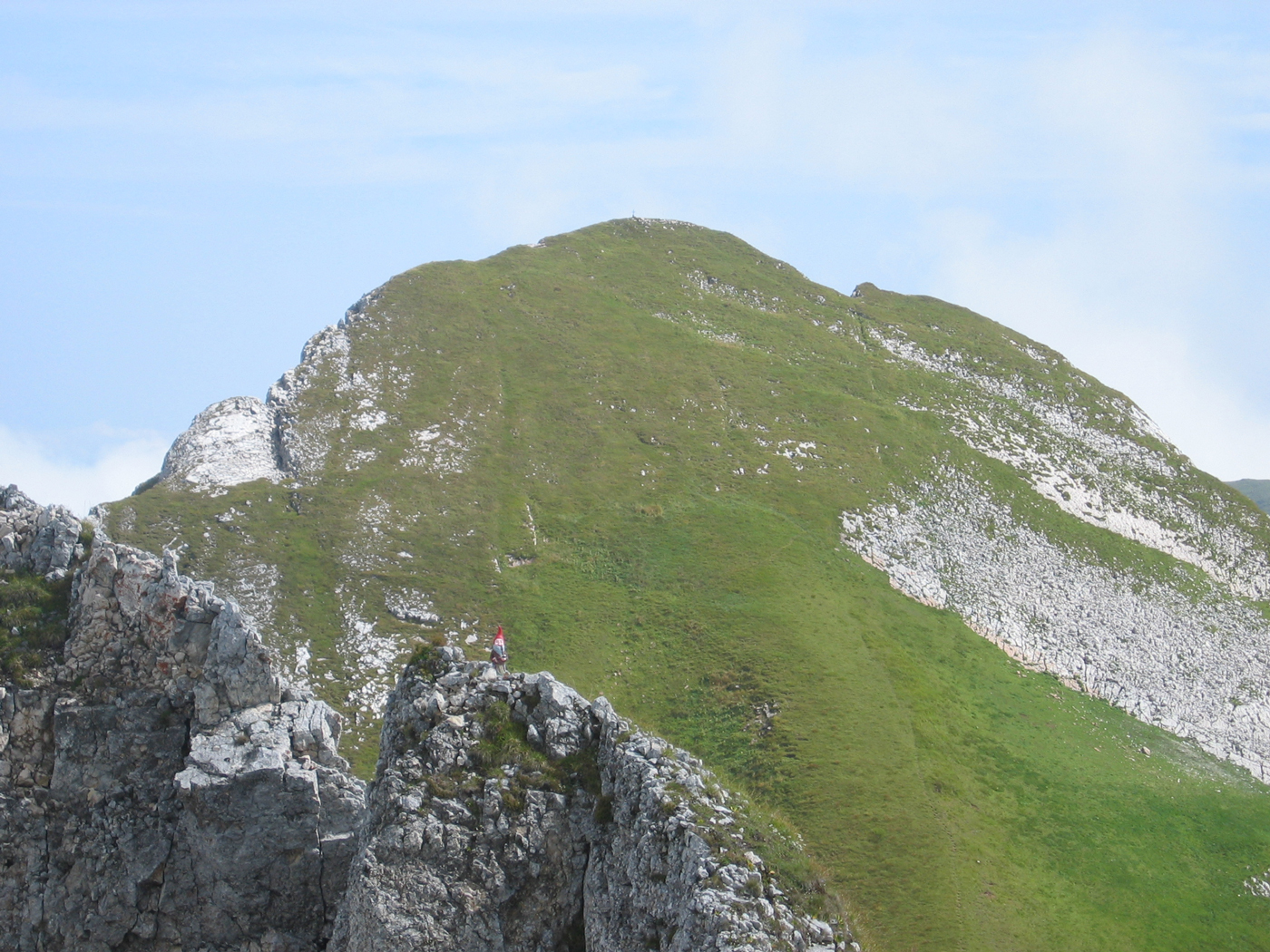 Auch auf dem Weiterweg zu den beiden letzten Gipfeln gibt es viel Aussicht bei mäßiger Anstrengung. Ein kleines Highlight bietet ein spektakulärer Felszacken, von dem ein Gartenzwerg auf die vorbeikommenden Wanderer herunterschaut. Bald ist der höchste Rofangipfel erreicht, der Hochiss. Besonders eindrucksvoll ist hier der Tiefblick in die Nordwand.