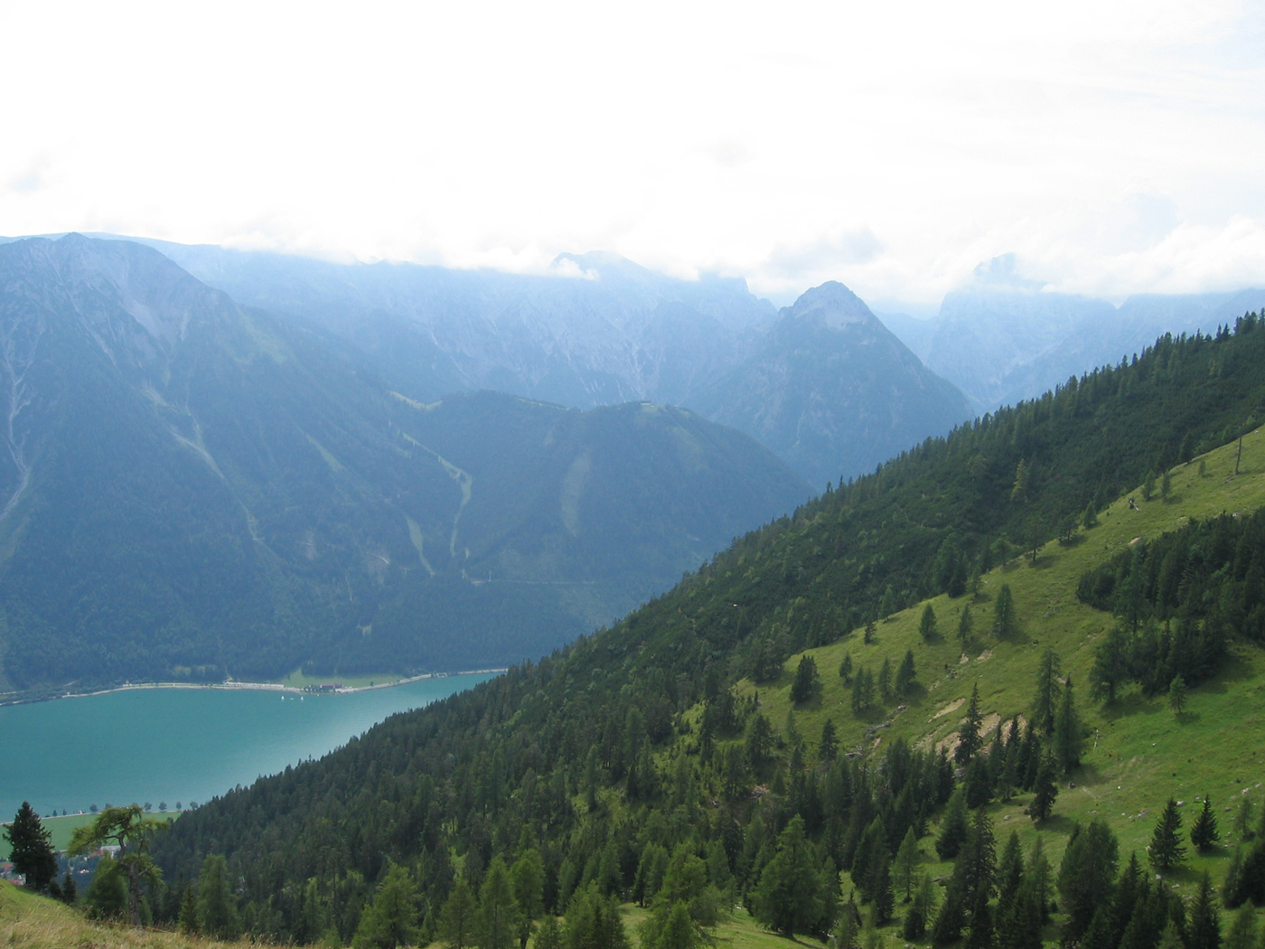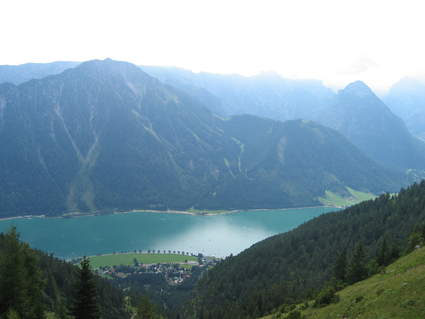 Einen langen Abstieg über Dalfazalm und Durraalm muss ich noch schaffen, dann habe ich Maurach am Achensee erreicht. Die Berge auf der gegenüberliegenden Seite dieses "Tiroler Fjords" gehören schon zum Karwendel.