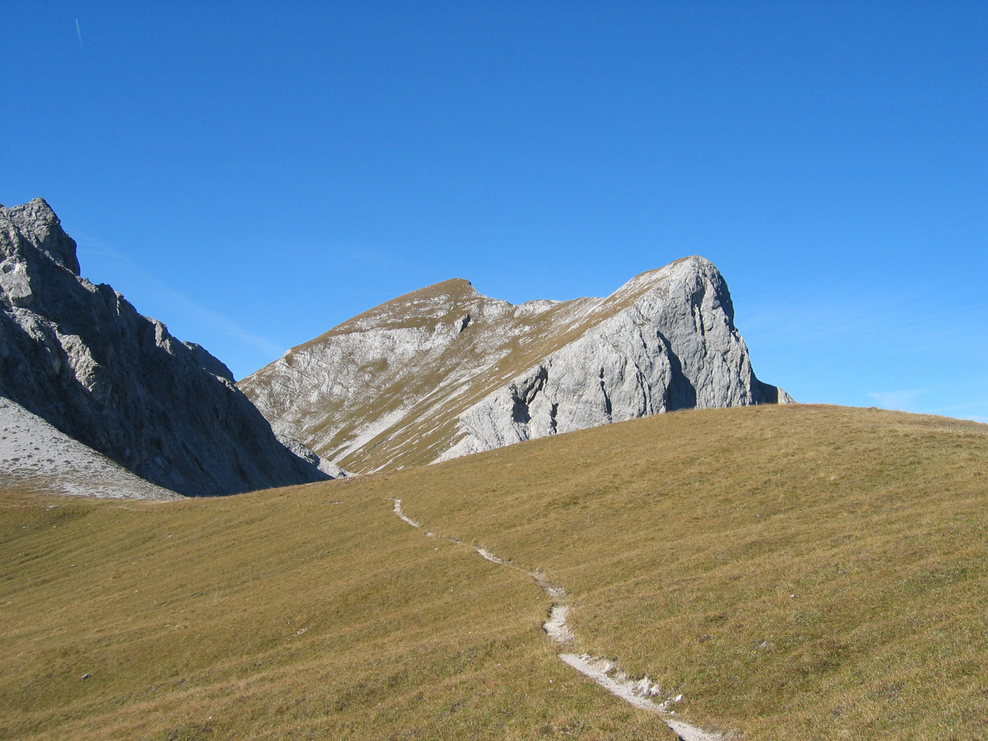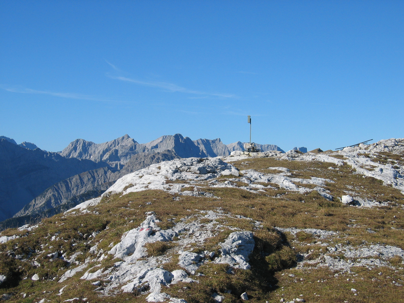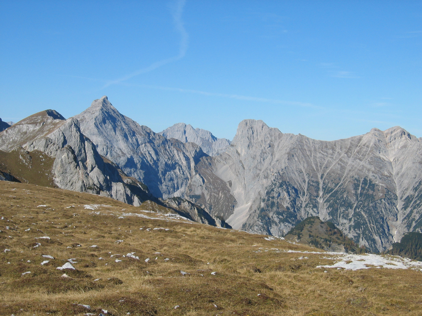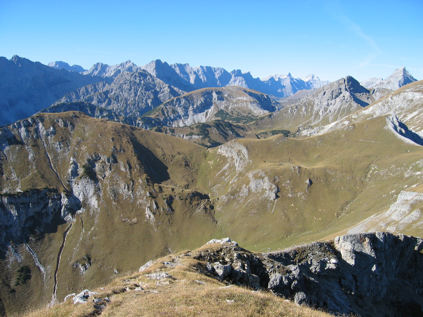 Ich hatte nicht damit gerechnet, so spät im Jahr meine Ost-West-Durchquerung noch fortsetzen zu können, aber die stabile Schönwetterphase Mitte Oktober muss einfach ausgenützt werden. Von Maurach am Achensee steige ich über die Heiterlahn-Alm auf das Stanser Joch. Im Gegensatz zum bisherigen, nicht besonders attraktiven Aufstiegsweg, beginnt hier eine wunderbare, bequeme Wanderung über den Stanser Kamm: Seierjoch (Ochsenkopf), Gamskarspitze, Schlössl und Kaserjochspitze heißen die Gipfel(chen), die sich ohne nennenswerte Anstrengung erreichen lassen. (Als Alternative zur Gratüberschreitung könnte man natürlich auch den Wanderweg 234 nehmen, der südlich des Kamms verläuft und ebenfalls zum Kaserjoch führt. Nach meiner Ansicht wäre das aber weniger reizvoll.) Die Überschreitung ist meist problemlos; nur im Bereich Schlössl sind auch anspruchsvollere Stellen zu bewältigen. Nach einem Zwischenabstieg zum Kaserjoch nehme ich noch als höchsten Gipfel des Tages die Rappenspitze mit.