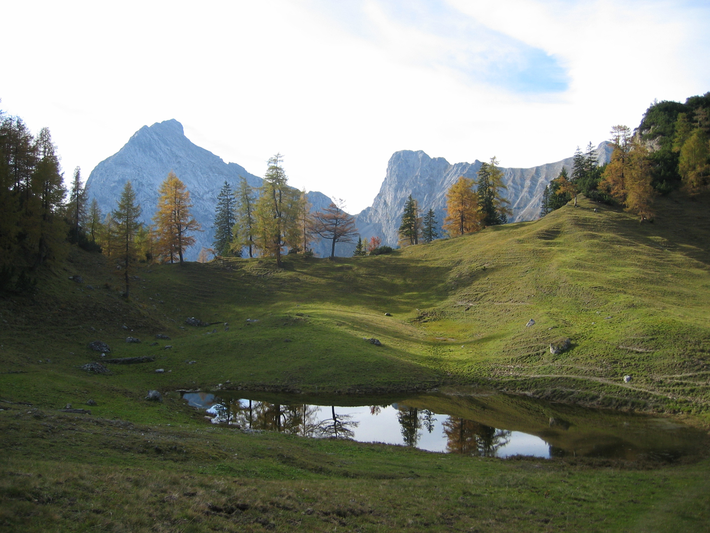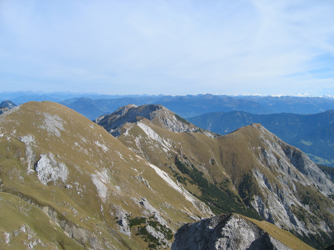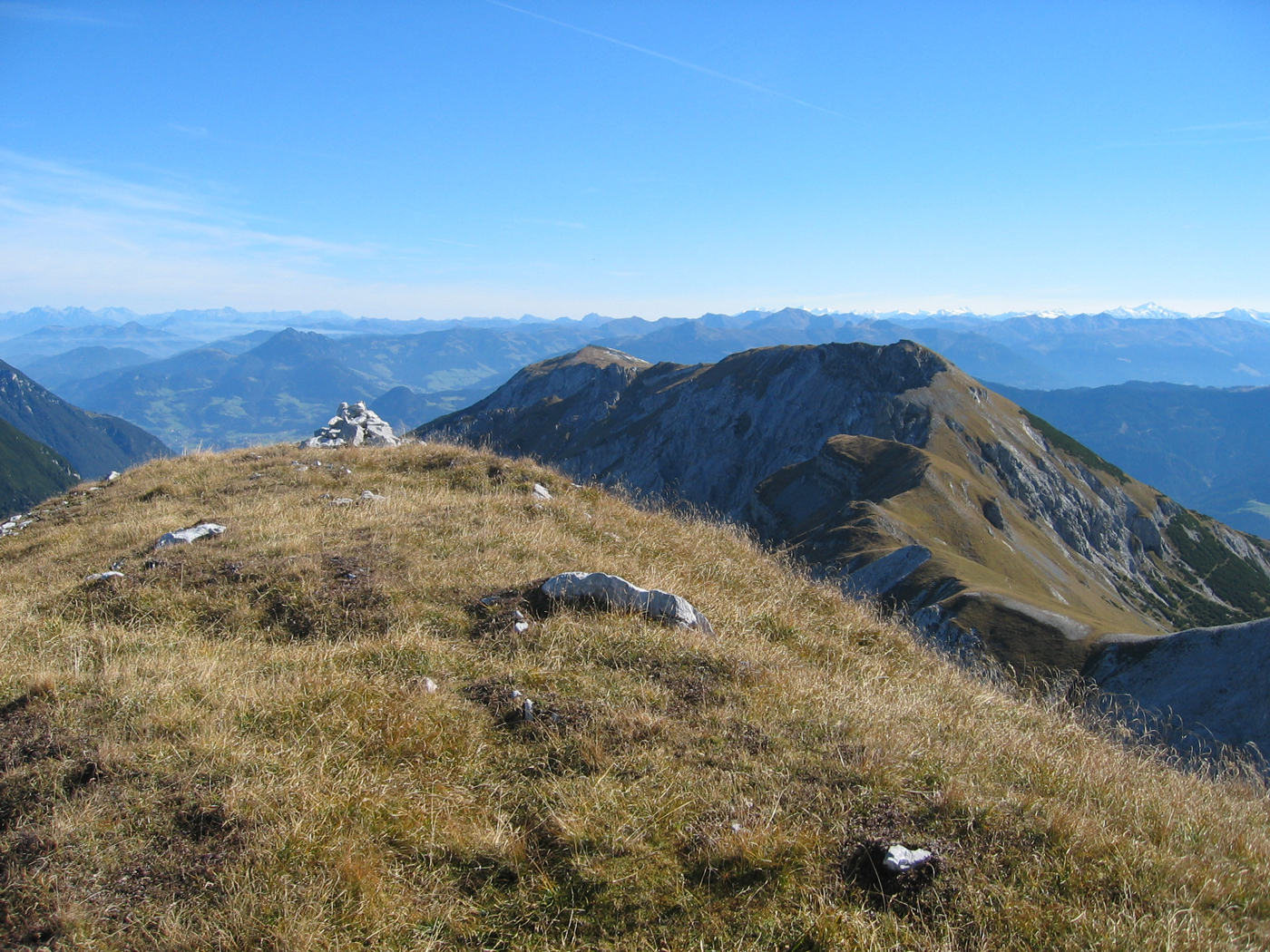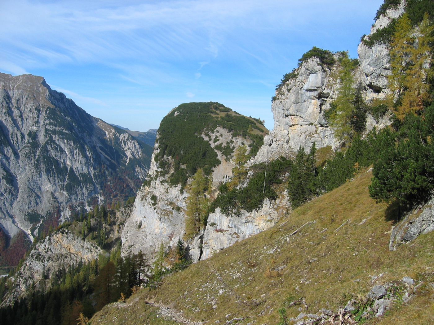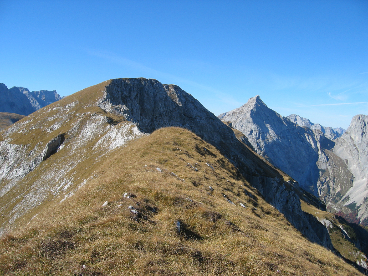 Ich hatte nicht damit gerechnet, so spät im Jahr meine Ost-West-Durchquerung noch fortsetzen zu können, aber die stabile Schönwetterphase Mitte Oktober muss einfach ausgenützt werden. Von Maurach am Achensee steige ich über die Heiterlahn-Alm auf das Stanser Joch. Im Gegensatz zum bisherigen, nicht besonders attraktiven Aufstiegsweg, beginnt hier eine wunderbare, bequeme Wanderung über den Stanser Kamm: Seierjoch (Ochsenkopf), Gamskarspitze, Schlössl und Kaserjochspitze heißen die Gipfel(chen), die sich ohne nennenswerte Anstrengung erreichen lassen. (Als Alternative zur Gratüberschreitung könnte man natürlich auch den Wanderweg 234 nehmen, der südlich des Kamms verläuft und ebenfalls zum Kaserjoch führt. Nach meiner Ansicht wäre das aber weniger reizvoll.) Die Überschreitung ist meist problemlos; nur im Bereich Schlössl sind auch anspruchsvollere Stellen zu bewältigen. Nach einem Zwischenabstieg zum Kaserjoch nehme ich noch als höchsten Gipfel des Tages die Rappenspitze mit.