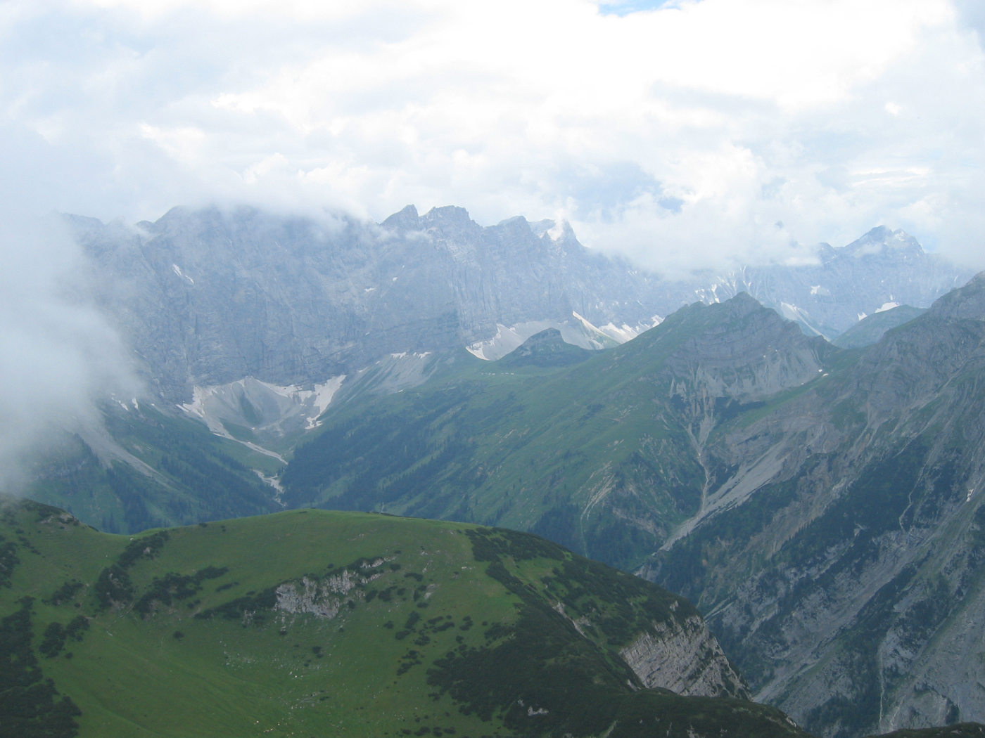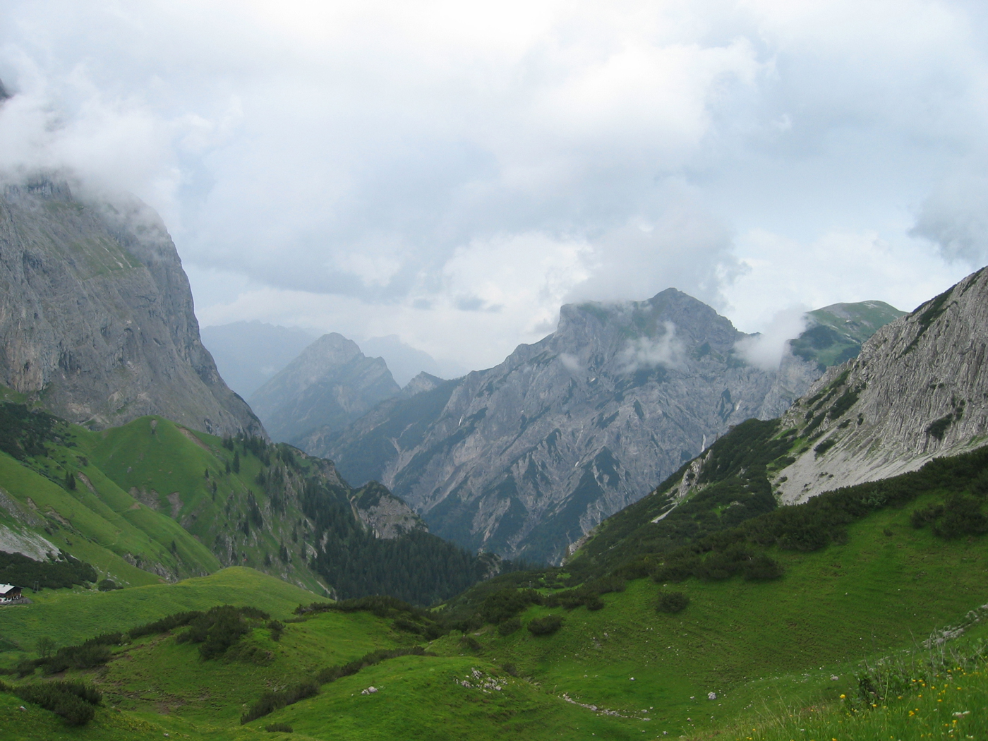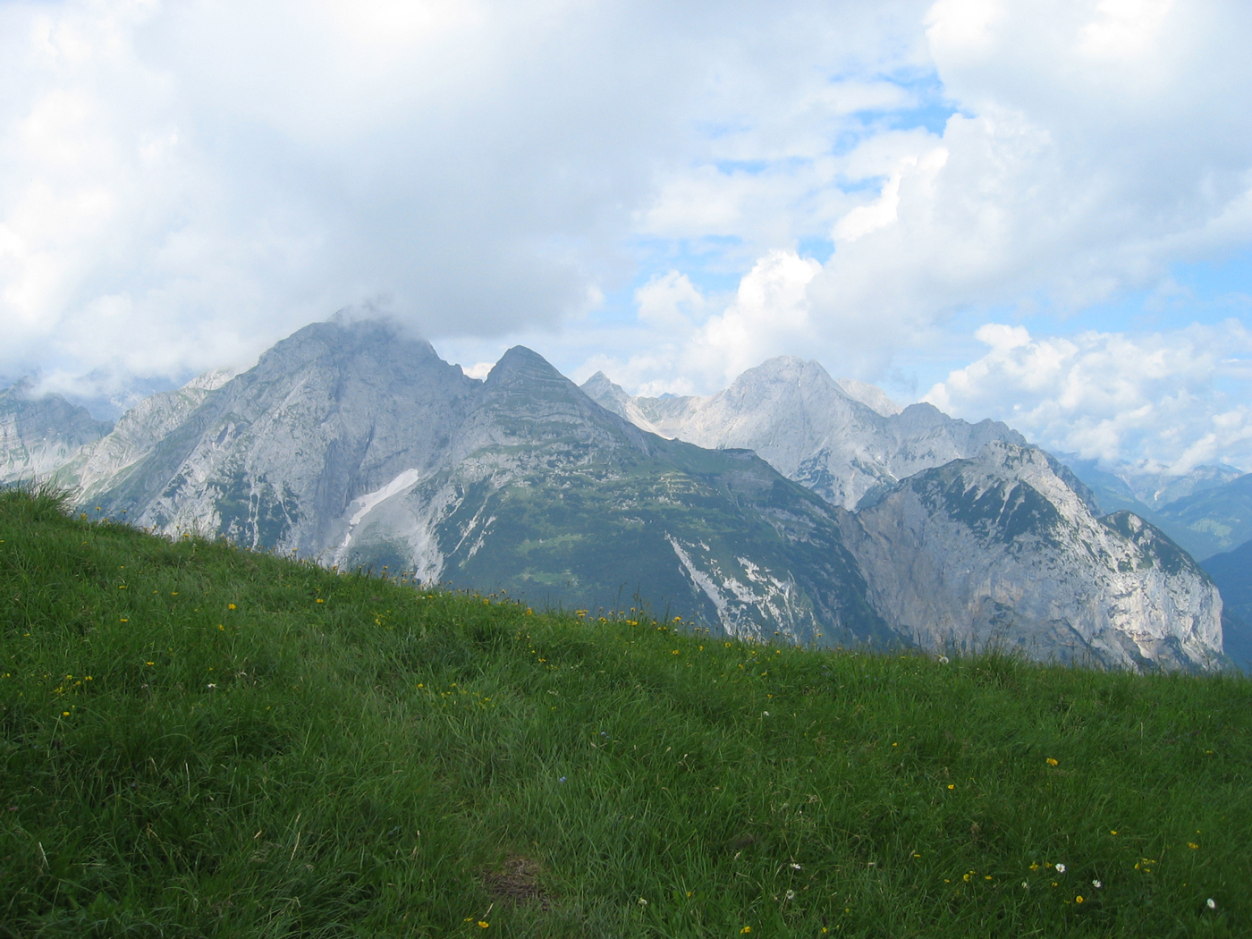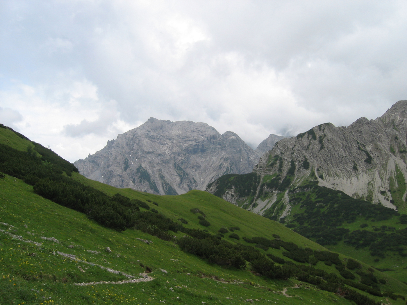 Auf meiner Ost-West-Durchquerung bin ich inzwischen in halbwegs vertrauten Regionen angekommen. Auch das Ziel der heutigen Tour, das Sonnjoch im schönen Karwendel, kenne ich schon von früher. Der für heute geplante Nordaufstieg ist für mich allerdings noch Neuland. Von der Falzthurn-Alm, wo ich mein Auto abgestellt habe, geht es zunächst fast eben im breiten Falzthurntal westwärts, bis nach rechts der einsame Wanderweg zum Bärenlahnersattel abzweigt. Am Anfang gibt es leichte Orientierungsprobleme, dann steige ich durch wunderbare Bergwiesen zum Sattel auf, der Sonnjoch und Schaufelspitze voneinander trennt. Der Gipfelaufstieg erfordert ein wenig Trittsicherheit, ist aber nicht zu anspruchsvoll. Bis zum Gipfel ist weit und breit kein anderer Bergwanderer zu sehen.