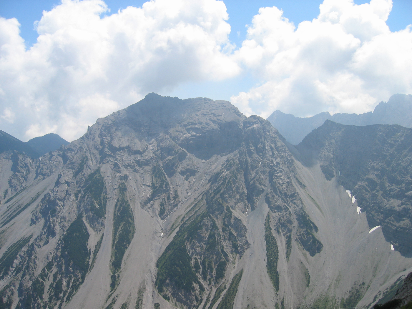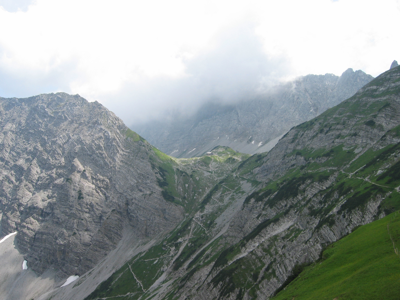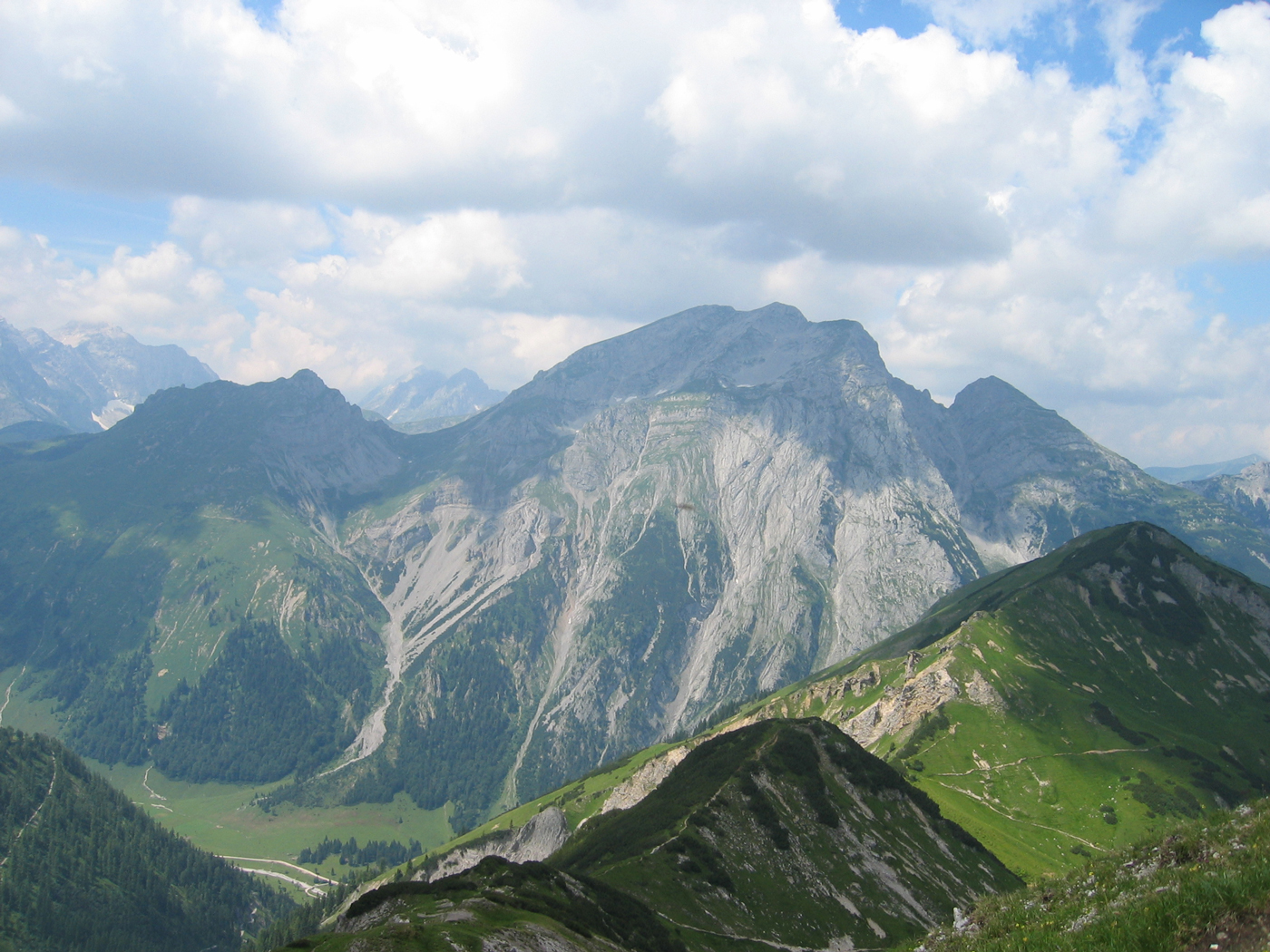 Das Karwendel ist nicht allzu weit entfernt von meinem Wohnort; daher ist es mir möglich, noch vor den Großen Ferien die Ost-West-Tour fortzusetzen. Dabei ist das Programm für heute überschaubar. Auf bequemen Wegen steige ich vom Wirtshaus Eng (Großer Ahornboden) zur Binsalm und weiter zum Binssattel, womit der Anschlusspunkt zur Sonnjoch-Besteigung vor einer Woche wieder erreicht ist. Nur noch eine halbe Stunde, dann bin ich auf dem Gipfel des Hahnkampl; hier liege ich ziemlich lange in der Sonne und genieße den schönen Tag. Ein gemütlicher Abstieg zur Lamsenjoch-Hütte schließt die Tour ab.