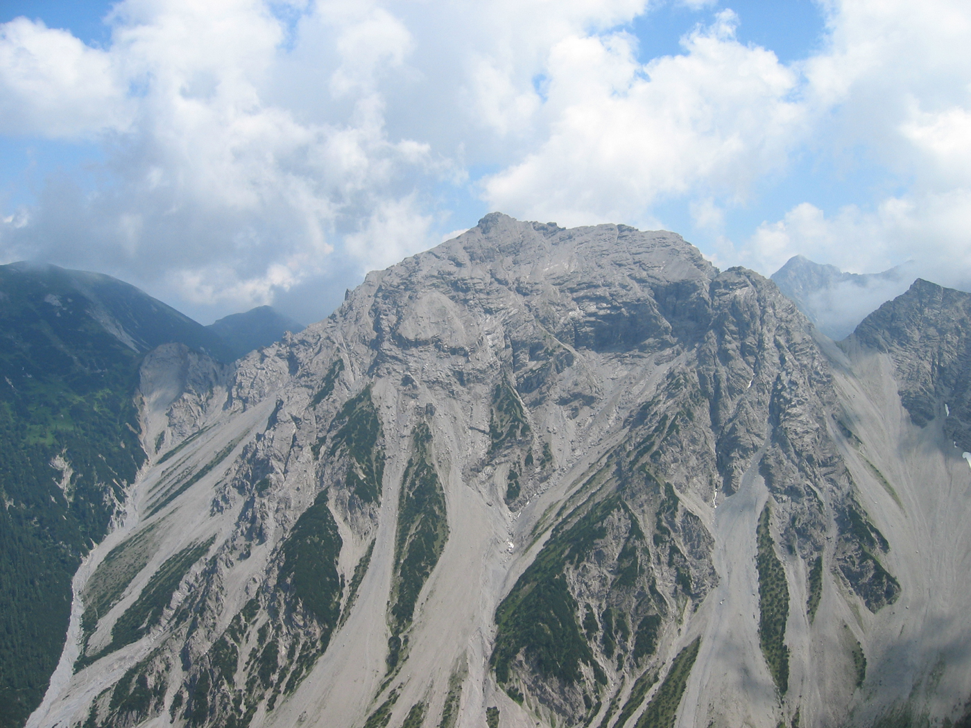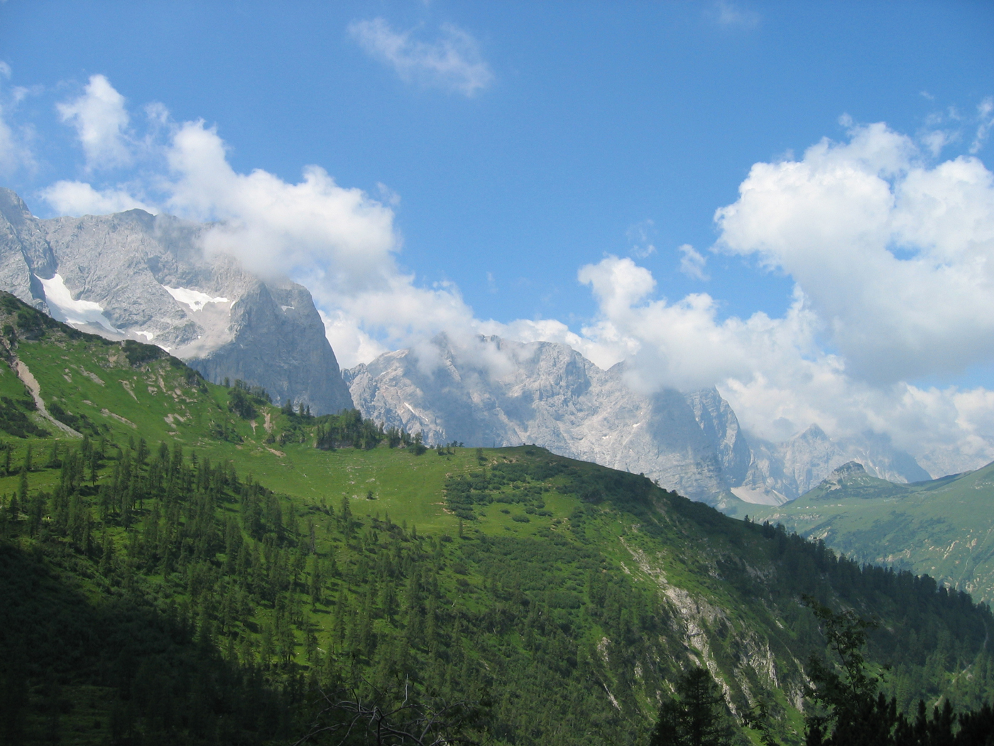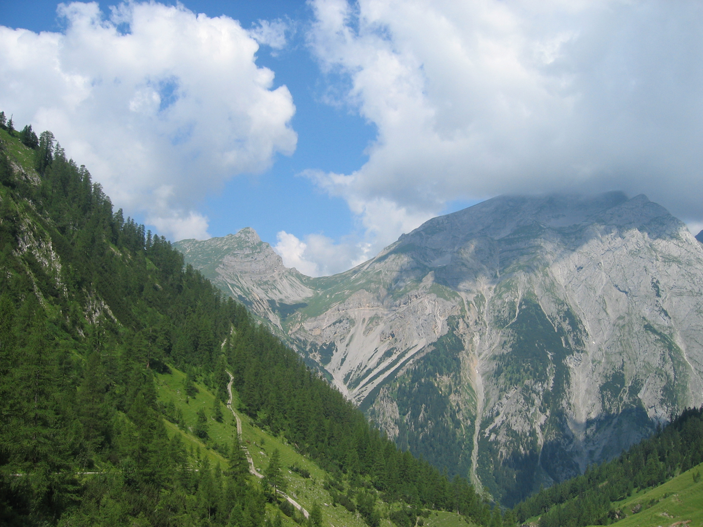 Das Karwendel ist nicht allzu weit entfernt von meinem Wohnort; daher ist es mir möglich, noch vor den Großen Ferien die Ost-West-Tour fortzusetzen. Dabei ist das Programm für heute überschaubar. Auf bequemen Wegen steige ich vom Wirtshaus Eng (Großer Ahornboden) zur Binsalm und weiter zum Binssattel, womit der Anschlusspunkt zur Sonnjoch-Besteigung vor einer Woche wieder erreicht ist. Nur noch eine halbe Stunde, dann bin ich auf dem Gipfel des Hahnkampl; hier liege ich ziemlich lange in der Sonne und genieße den schönen Tag. Ein gemütlicher Abstieg zur Lamsenjoch-Hütte schließt die Tour ab.
