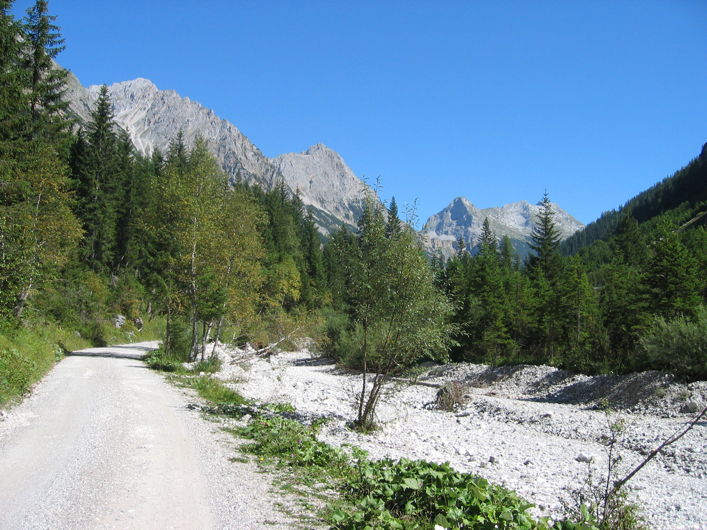 Auf der letzten Tour meiner Weitwanderung in Etappen bin ich bis zum Hochalmsattel gekommen, der knapp oberhalb des Karwendelhauses liegt. Eineinhalb Monate später breche ich bei schönstem Wetter erneut ins Karwendel auf, um in einer Viertagestour den westlichen Teil dieser reizvollen Gebirgsgruppe zu durchwandern. Von Scharnitz marschiere ich durch das Karwendeltal, immer wieder überholt von Mountainbikefahrern. Anscheinend bin ich heute der einzige, der zu Fuß den langen Weg zum Karwendelhaus zurücklegt. Trotzdem: Es ist eine wunderbare Wanderung, und es gibt viel zu sehen.