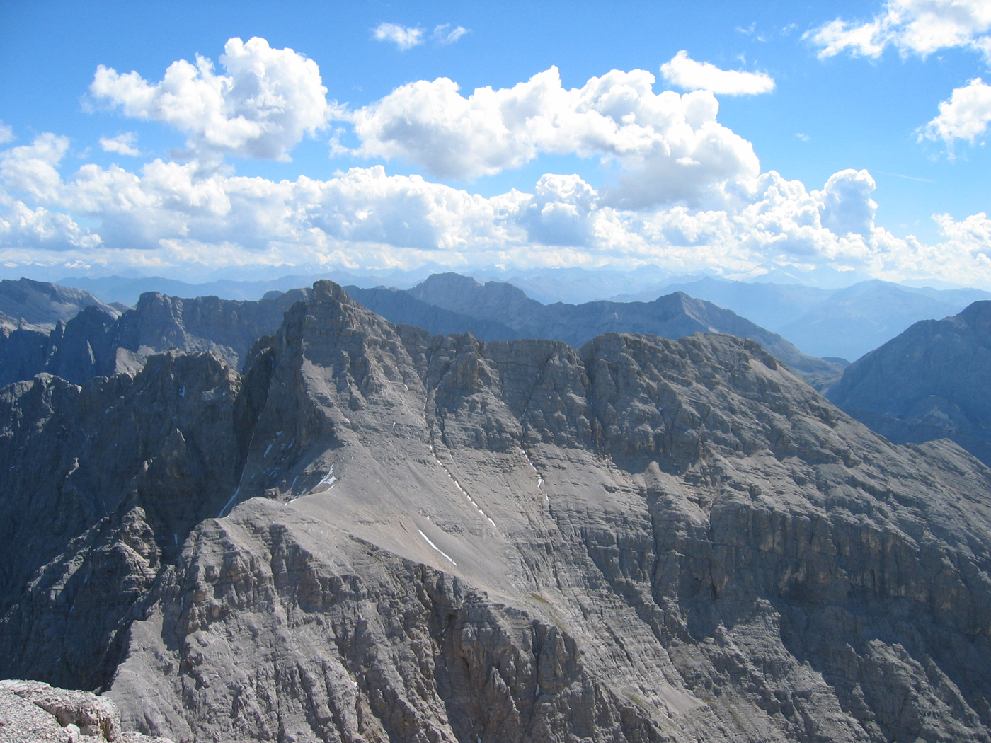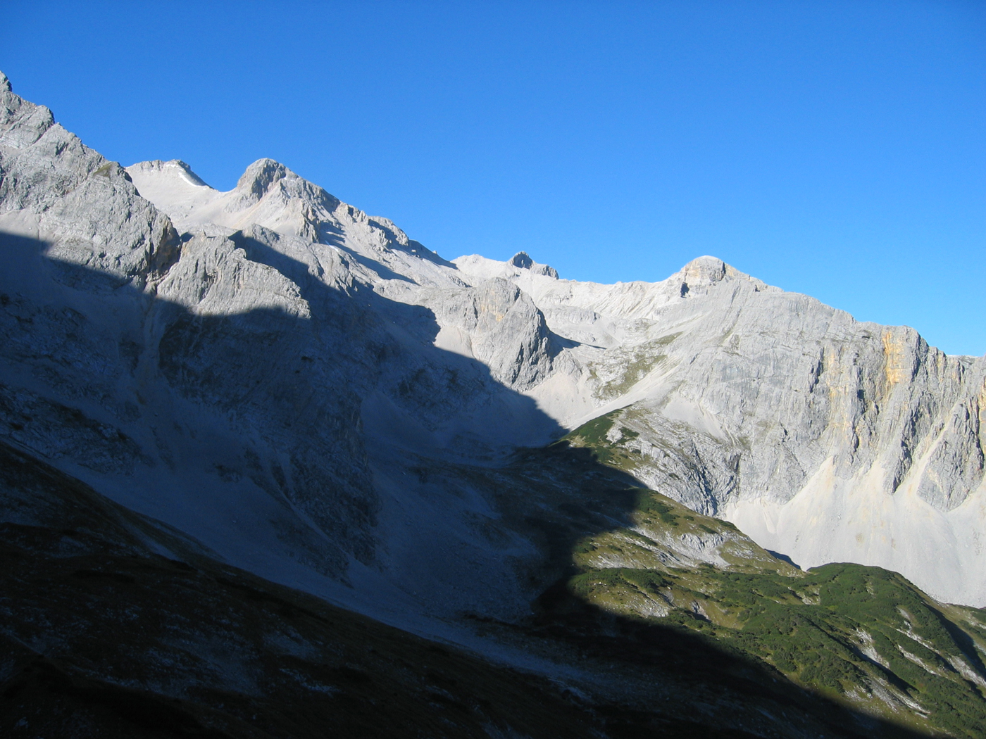 Der Schlauchkarsattel ist Ausgangspunkt für die Besteigung des höchsten Karwendelgipfels, der Birkkarspitze. Erfreulicherweise ist der übliche Hochbetrieb auf dem bröseligen Aufstiegsweg schon vorbei; den Gipfel habe ich ganz für mich allein. Nach ausgiebiger Pause kehre ich zum Schlauchkarsattel zurück. Über die weiten Geröllfelder des Schlauchkars, das seinen Namen bekanntlicherweise nicht ganz zu Unrecht trägt, komme ich wieder zur Abzweigung von heute morgen, und bald darauf zum Karwendelhaus.