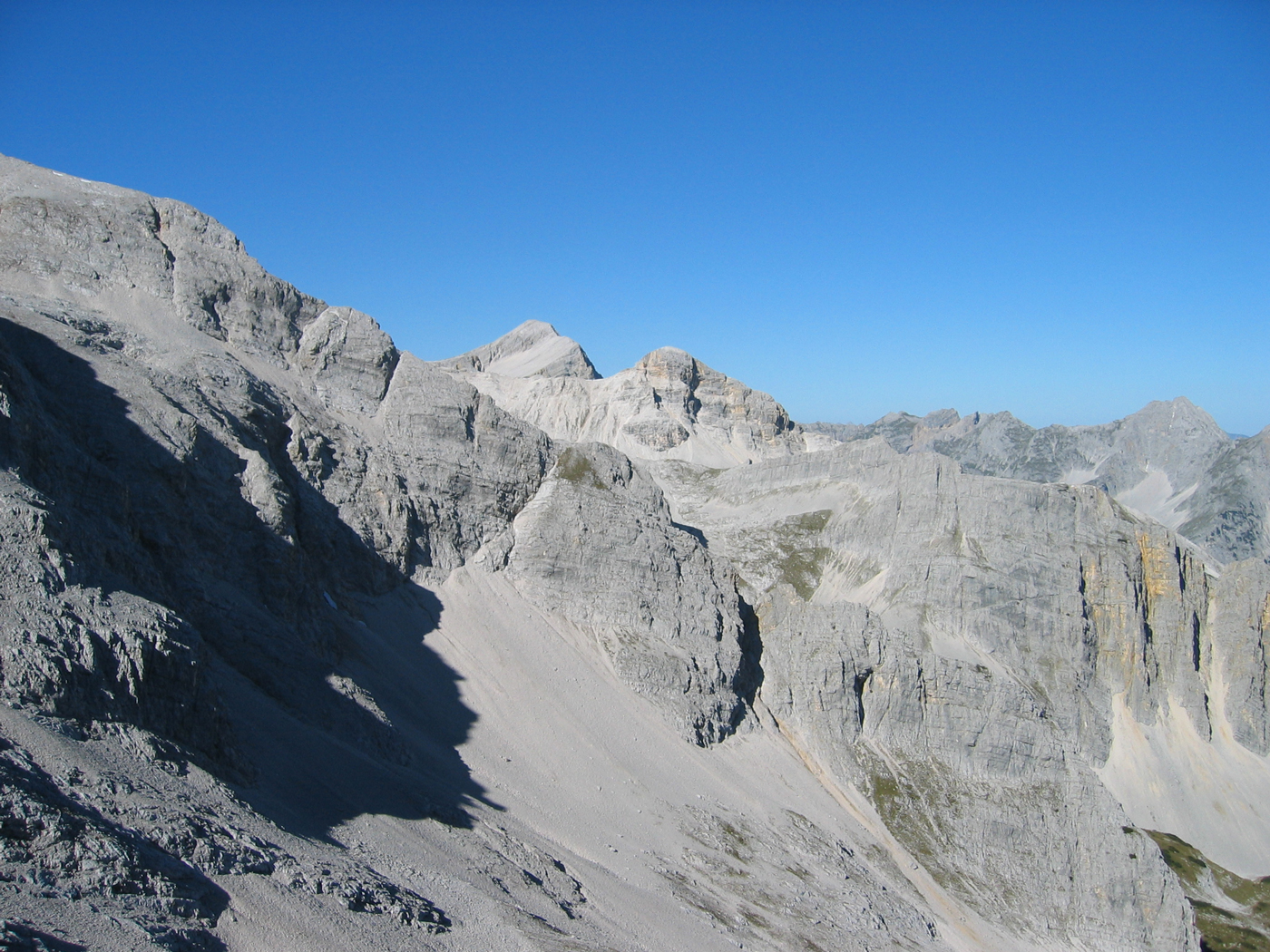 Beim weiteren Aufstieg geht es zunächst durch Latschengelände, später über weite Geröllfelder, die aber recht angenehm zu gehen sind. Gut drei Stunden nach meinem Aufbruch bin ich auf dem ersten Gipfel, der Westlichen Ödkarspitze. Bald darauf habe ich die Mittlere Ödkarspitze erreicht, wo die erste größere Pause fällig ist. Das Panorama ist überwältigend. Es folgt ein weiterer, ziemlich steiler Ab- und Aufstieg mit ein wenig Kraxelei, dann ist auch die Östliche Ödkarspitze geschafft. Über drahtseilgesicherte Felspassagen steige ich ab zum Schlauchkarsattel mit seiner winzigen Biwakhütte.