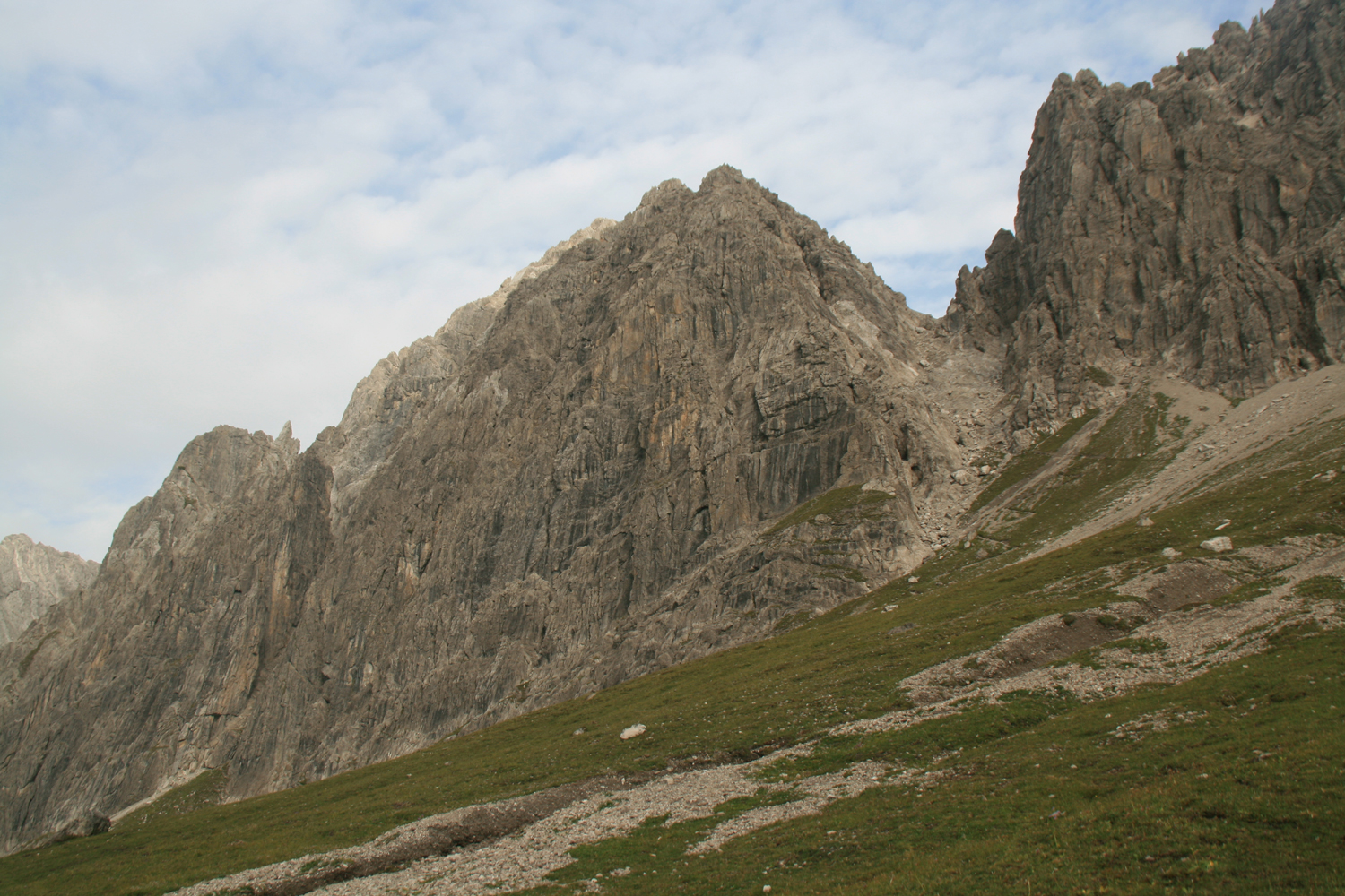 Da ich mich noch nicht ausgelastet fühle, breche ich bald wieder auf, mit leichtem Gepäck, um auf die Steinkarspitze zu steigen. Ein nicht allzu schwieriger Klettersteig (B bis C in der fünfteiligen Skala) führt durch die Ostflanke des Berges. Die Kraxelei (mit Klettersteig-Set) macht großen Spaß. Knapp unterhalb des Gipfels endet der Klettersteig, die letzten Meter (ein wenig ausgesetzt) sind ohne Sicherung zurückzulegen.