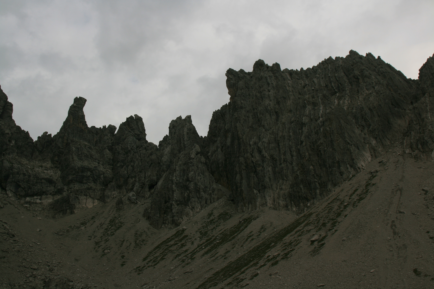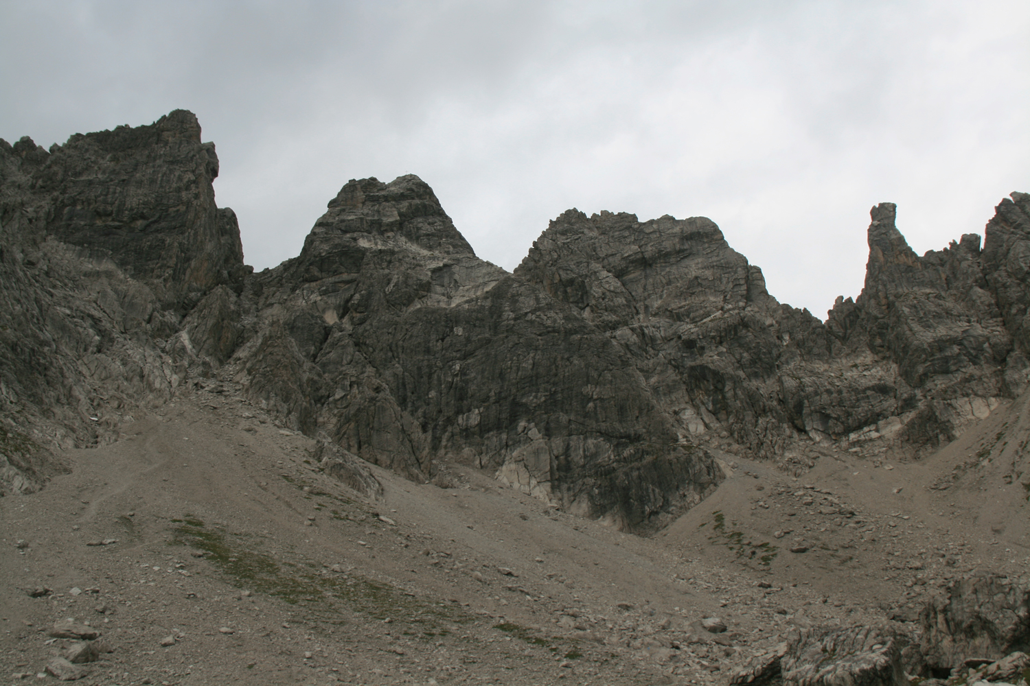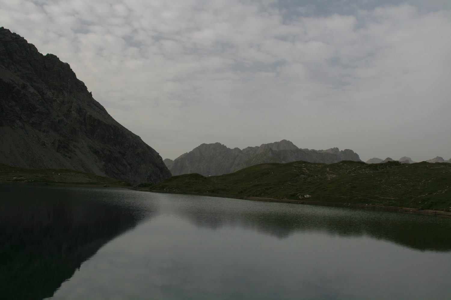 Auch am zweiten Tag meiner dreitägigen Wanderung durch die Lechtaler Alpen ist das Wetter im Prinzip recht freundlich. Allerdings gibt es einen Wolkenschleier, den die Sonnenstrahlen kaum durchdringen. Ich breche von der Hanauer Hütte auf, um über die Vordere (Westliche) Dremelscharte auf die andere Seite des Lechtaler Hauptkamms zu gelangen. Zuerst geht es durch Gras- und Latschengelände, später immer mehr durch Geröll, das aber nicht besonders mühsam zu begehen ist. Nach eineinhalb Stunden ist die Scharte erreicht, wo ein steiler Abstieg in Richtung Steinsee beginnt. Das lose Geröll erfordert vorsichtiges Gehen, an einigen Stellen helfen Drahtseil-Sicherungen. Allmählich wird der Steig flacher, die Wegverzweigung am Steinsee ist nicht mehr weit. Der See leuchtet nicht so blau, wie ich ihn kenne, sondern zeigt sich heute eher in Grau. Daher fällt der Verzicht auf das mögliche Badevergnügen (bei vielleicht 10°C) nicht besonders schwer. Knapp drei Stunden nach dem Aufbruch komme ich an der wunderschön gelegenen Steinseehütte an.