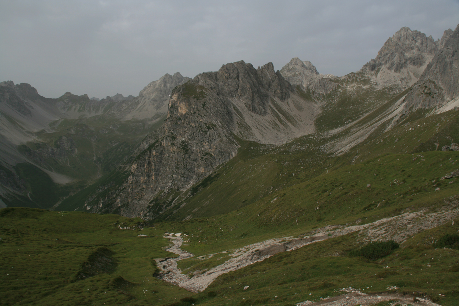 Der Abstieg erfolgt zunächst in nördlicher Richtung, in die Scharte vor den Parzinntürmen. Von hier geht es durch eine steile, ziemlich steinschlaggefährdete Rinne hinunter ins Kar. Hier fühle ich mich nicht besonders wohl, da ich leichtsinnigerweise ohne Helm unterwegs bin. Zum Glück ist niemand sonst unterwegs, und bald ist die kritische Passage geschafft. Über den einfachen Wanderweg kehre ich zur Steinseehütte zurück.