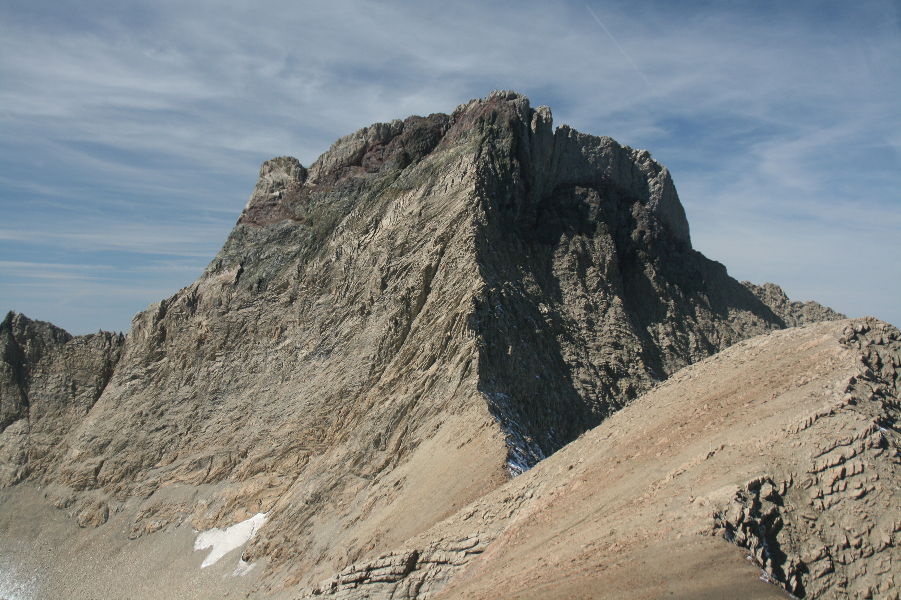 Kurz vor der Patrolscharte beginnt der eigentliche Gipfelaufstieg. So spät im Sommer ist es nicht nötig, den stark geschrumpften Grinner Ferner zu betreten. Über Geröll gelangen wir zum markierten Einstieg. Die Aufstiegsroute erreicht nur an wenigen Stellen knapp den II. Schwierigkeitsgrad, hat aber eine beträchtliche Durchschnittsneigung und erfordert immer große Aufmerksamkeit sowie Immunität gegen Tiefblicke. Schon die ersten Meter sind anspruchsvoll; die schwierigste Stelle befindet sich knapp oberhalb der Mitte. Mein Begleiter kehrt an dieser Stelle um, während ich die Passage umgehe (auch nicht ganz einfach) und zum Gipfel weitersteige.