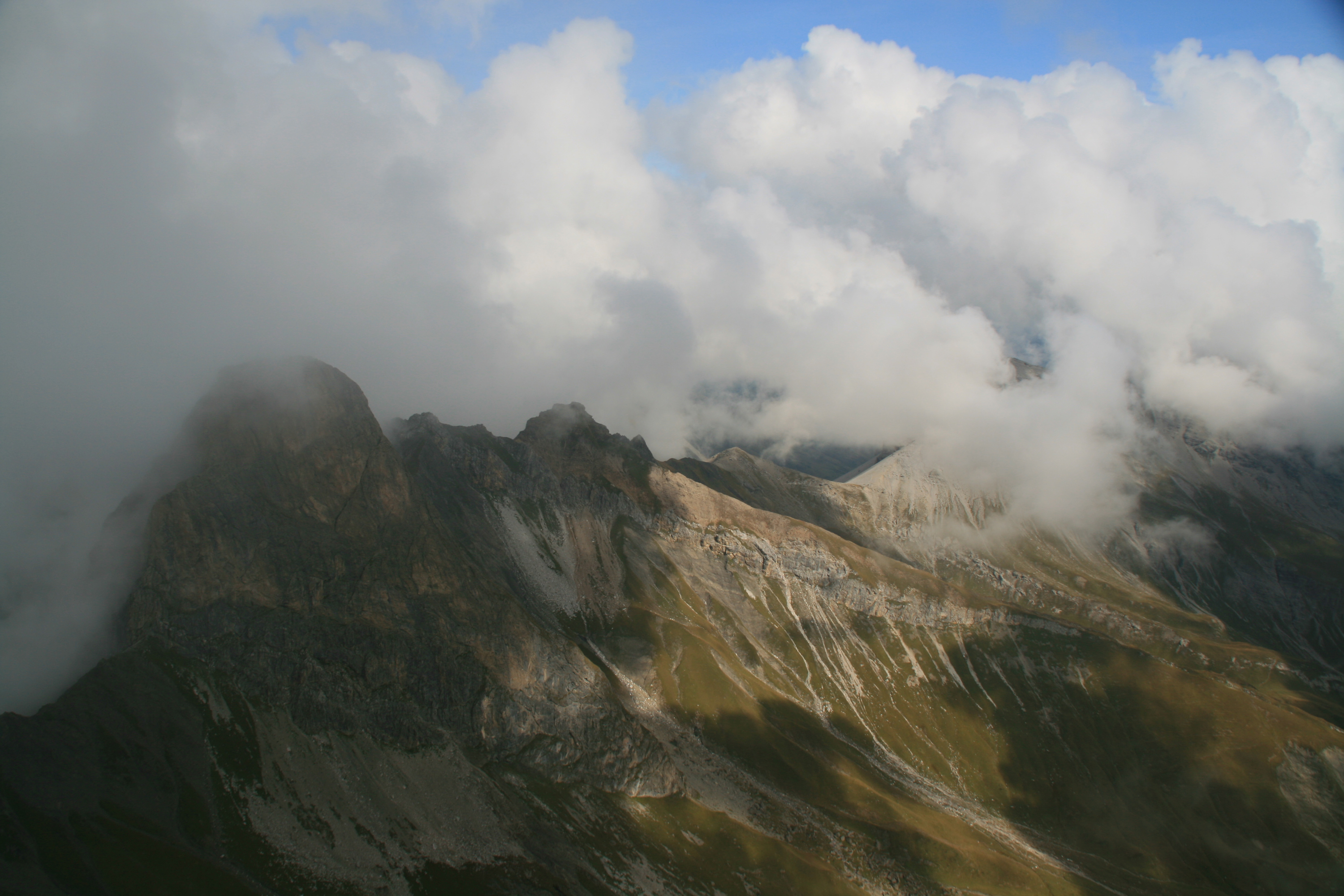 Letzter Tag der Lechtaler-Durchquerung: Wie gestern bin ich auf dem Höhenweg 601 bzw. E4 unterwegs. Das Wetter ist nicht so gut wie erhofft, aber ganz ordentlich. Von der Leutkircher Hütte spaziere ich zum nahe gelegenen Almajurjoch. Von hier führt der Höhenweg durch Geröll- und Schrofenhänge aufwärts; gelegentlich helfen Drahtseilsicherungen über schwierigere Stellen. Nach der Abzweigung in Richtung Kapallkopf geht es nochmal ein Stockwerk höher, dann folgt eine lange Querung auf ungefähr 2400 m Höhe unter den Wänden von Bacherspitze, Weißschrofenspitze und Lisunspitze hinüber zum Knoppenjoch (Matunjoch) und zum benachbarten Valfagehrjoch. Dass hier wesentlich mehr Betrieb ist als bisher, liegt wohl an der Nähe der Ulmer Hütte. Durch ein Geröllkar zwischen Valluga (rechts) und Jahnturm (links) erreiche ich die Mittelstation der Vallugabahn. Der restliche Gipfelaufstieg ist gekennzeichnet durch viel Geröll und einige Kraxelpassagen am Drahtseil. Bald bin ich am Gipfel der Valluga mit ihrem Aussichtsturm. Anscheinend wollte man durch diese Einrichtung den Rundblick um weitere 0,01 Prozent steigern. Aufgrund der stärker gewordenen Bewölkung ist das Panorama nicht so umfassend wie erhofft, dafür habe ich den Gipfel fast allein für mich.