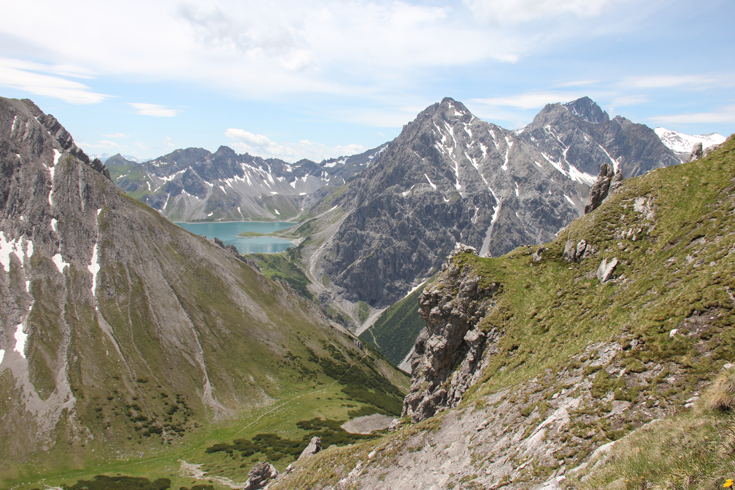 Auf dem Anstiegsweg kehre ich zum Saulajoch zurück. Das restliche Tagesprogramm ist nicht mehr allzu umfangreich. Der Weg quert absteigend die Westhänge des Nördlichen und des Südlichen Schafgafall. Das Tagesziel ist nicht zu übersehen, nämlich der türkisblaue Lünersee, an dem - hinter der langen Staumauer - die Douglass-Hütte liegt.