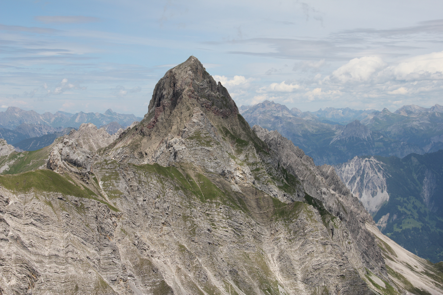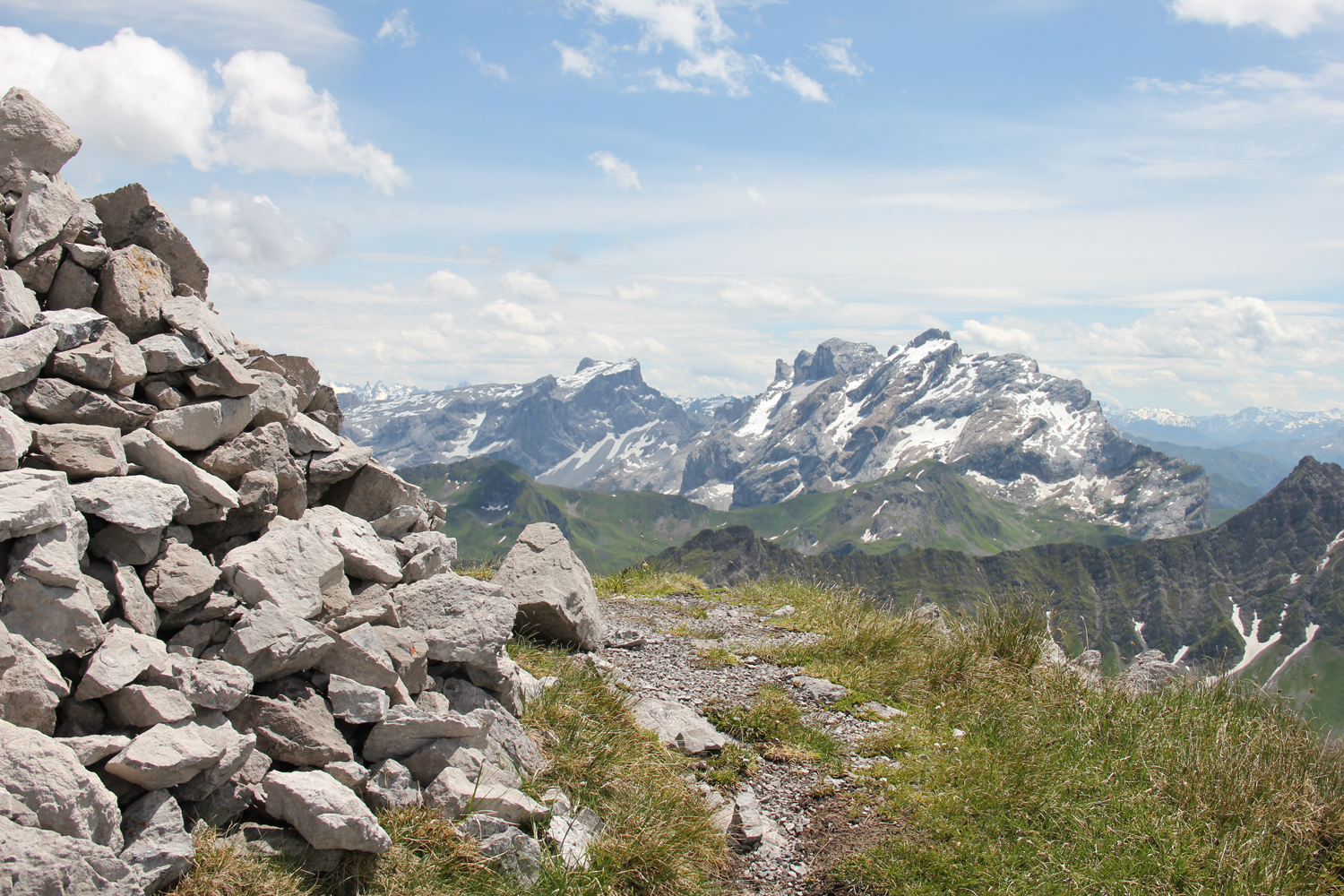 Am längsten Tag des Jahres breche ich zu einer Zweitagestour auf, die meine große Ost-West-Wanderung fortsetzen soll. Um an die letzte Etappe des vergangenen Jahres anzuschließen, muss ich als erstes die Heinrich-Hueter-Hütte erreichen. Die bequemste Möglichkeit dazu bietet die Golmerbahn. Ich starte also an der Bergstation Grüneck und steige zunächst ins Rellstal ab, wo ich auf den Hüttenweg der Heinrich-Hueter-Hütte treffe. Für eine Einkehr ist es noch zu früh, daher mache ich mich gleich an den Weiterweg, der über Gras- und Latschenhänge in westlicher Richtung zum Saulajoch führt. Kurz vor dem Joch zweigt rechts der Normalweg zum Saulakopf ab, auf dem ich über Gras, Geröll und Schrofen zum Gipfel steige. Einige schwierigere Stellen sind mit Drahtseilen gesichert, ein Minimum an Trittsicherheit und Kletterfertigkeit ist auf jeden Fall angebracht. Eigentlich habe ich mit einigem Betrieb gerechnet, aber ich bin ganz allein auf dem Gipfel und kann Brotzeit wie Panorama völlig ungestört genießen.