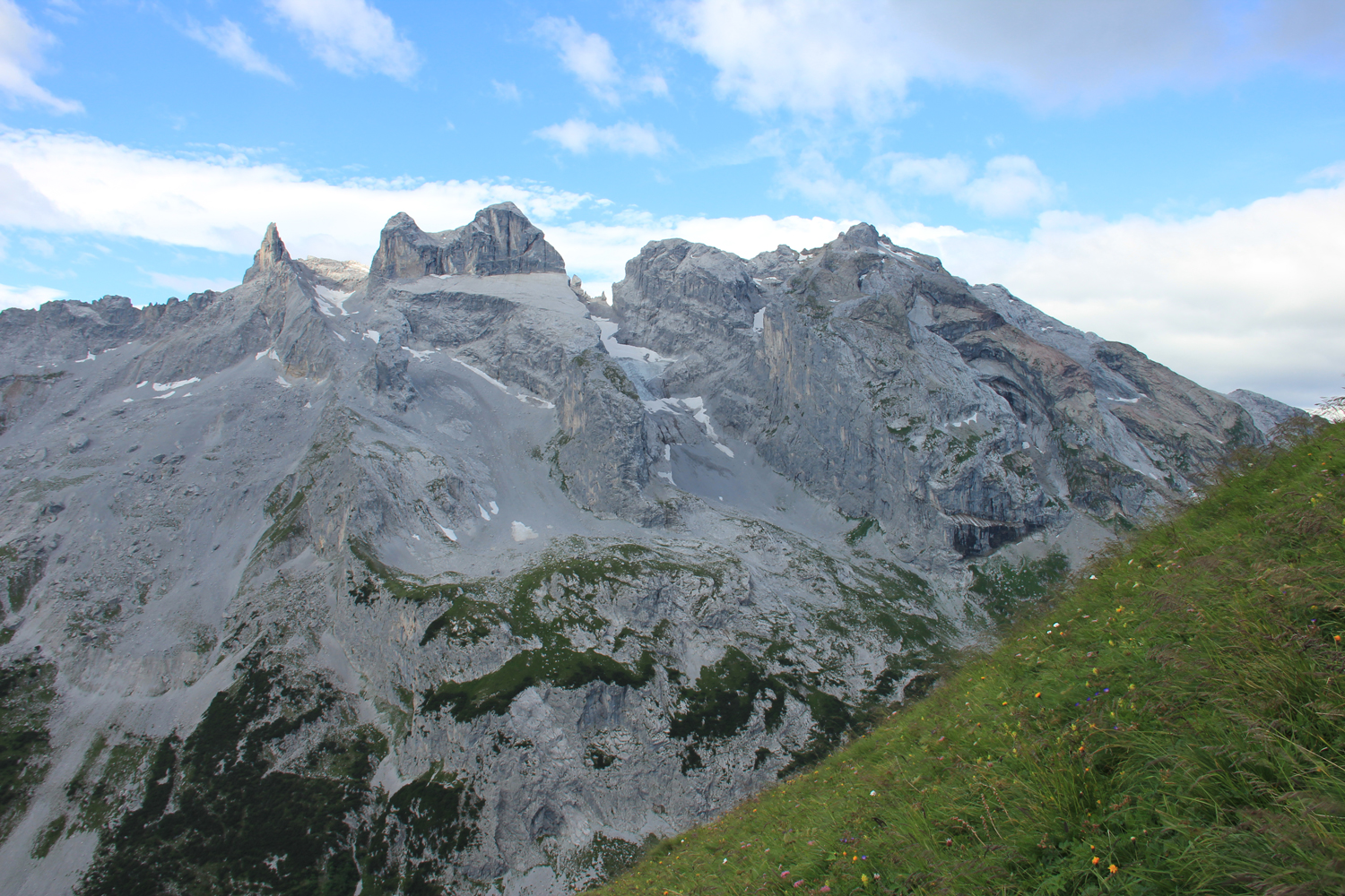 Der zweite Teil unserer Wochendtour ist eine ausgesprochene Genusswanderung. Der Golmer Höhenweg überschreitet einige Gipfel der kleinen Gebirgsgruppe, die der Drusenfluh und den Drei Türmen vorgelagert ist. Die Tour ist weniger alpin als die gestrige Besteigung des Großen Turms, muss sich aber, was die Aussicht betrifft, nicht verstecken. Wahrscheinlich wäre die Begehung in umgekehrter Richtung noch reizvoller, weil man dann die prominenten Rätikon-Gipfel immer vor Augen hätte, aber das hätte nicht in unsere Pläne gepasst.