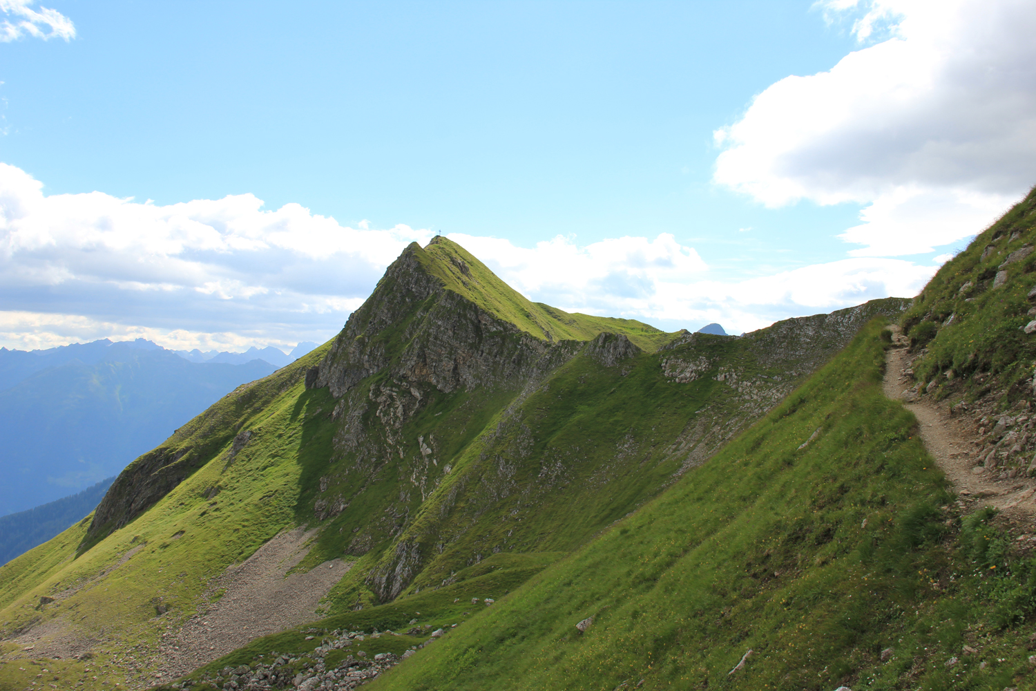 Von der Lindauer Hütte zieht ein Steig mit vielen Serpentinen hoch durch die grasige, recht steile Südostflanke der Geißspitze. Damit ist der höchste Punkt der heutigen Unternehmung bereits geschafft. Über den Westkamm geht es anschließend hinab in einen kleinen Sattel, bevor der Weg unter dem Ostgipfel der Kreuzspitze und unter dem Wilden Mann (also auf der rechten Seite des Kamms) mit leichtem Höhenverlust zum Hätaberger Joch hinüberquert. Ein kurzer Grasaufstieg bringt uns zum Kreuzjoch. Hier biegt der Weg rechts nach Nordosten ab. Über den einfachen Latschätzkopf und das Golmer Joch steigen wir ab zur Bergstation Grüneck. Das Wetter ist nicht mehr so freundlich wie vor einigen Stunden, aber wir bleiben vom Platzregen verschont. Die Gondel der Bergbahn trägt uns knieschonend ins Tal.