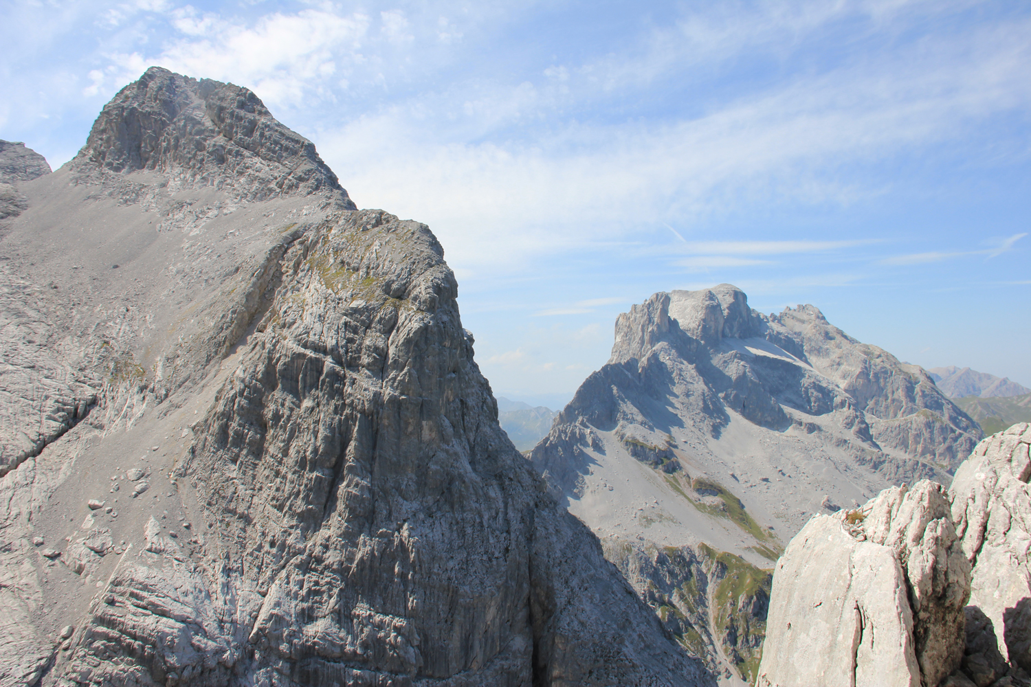 Nach ordentlicher Flüssigkeitszufuhr breche ich zur eigentlichen Tour auf. Der Weg in Richtung Tilisunahütte verliert zunächst ein wenig Höhe, bevor nach rechts ein Steig zur Sulzfluh abzweigt. Es geht in ein breites Tal ("Rachen"), wobei im ersten Teil auch kurze Kraxelstellen zu absolvieren sind. Später wendet sich der Steig scharf nach links, um einen breiten Kamm zu erreichen. Etwa 150 Höhenmeter unter dem Gipfel vereinigt sich der Steig mit dem Anstiegsweg von der Tilisunahütte. Durch einfaches Gelände steigt man in einem weiten Bogen hinauf zum Gipfel der Sulzfluh.