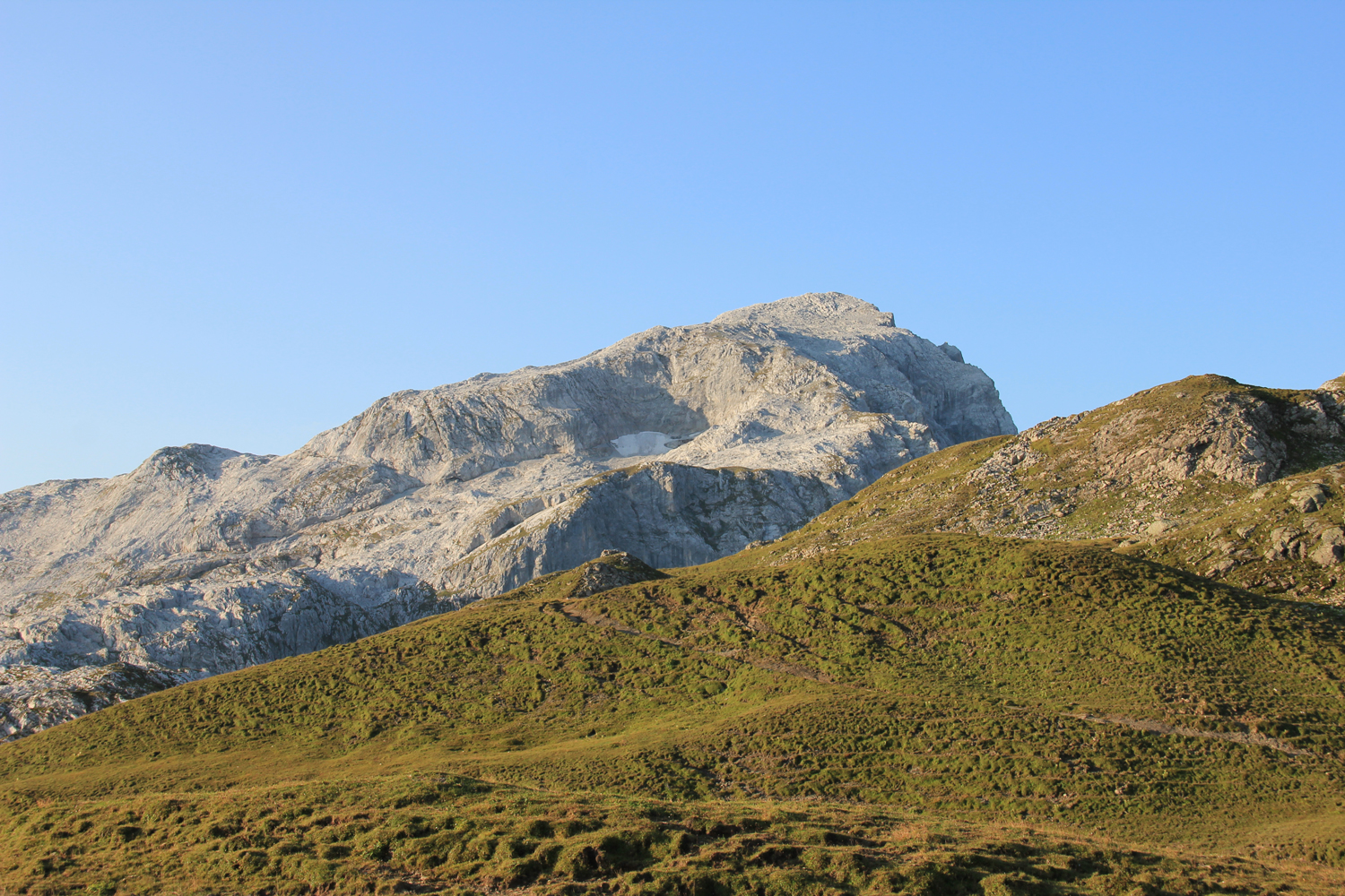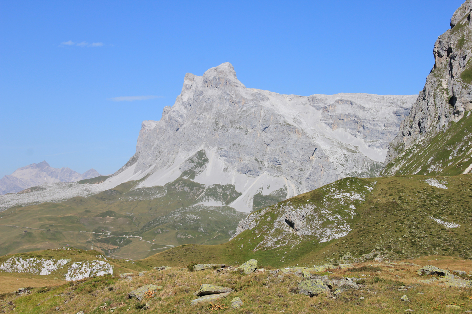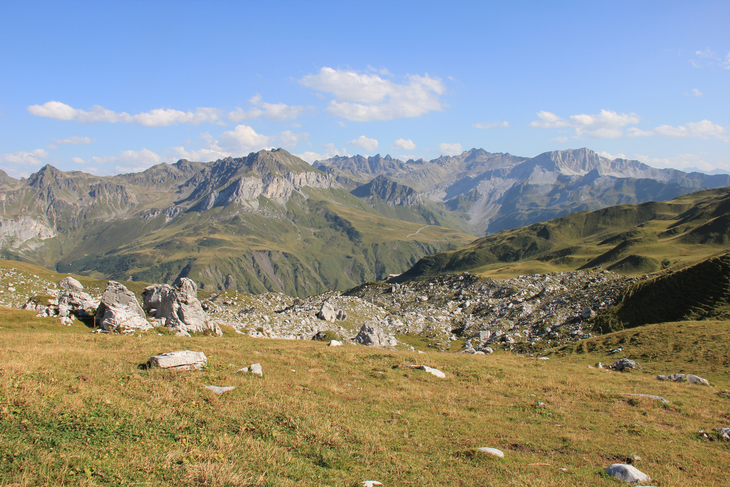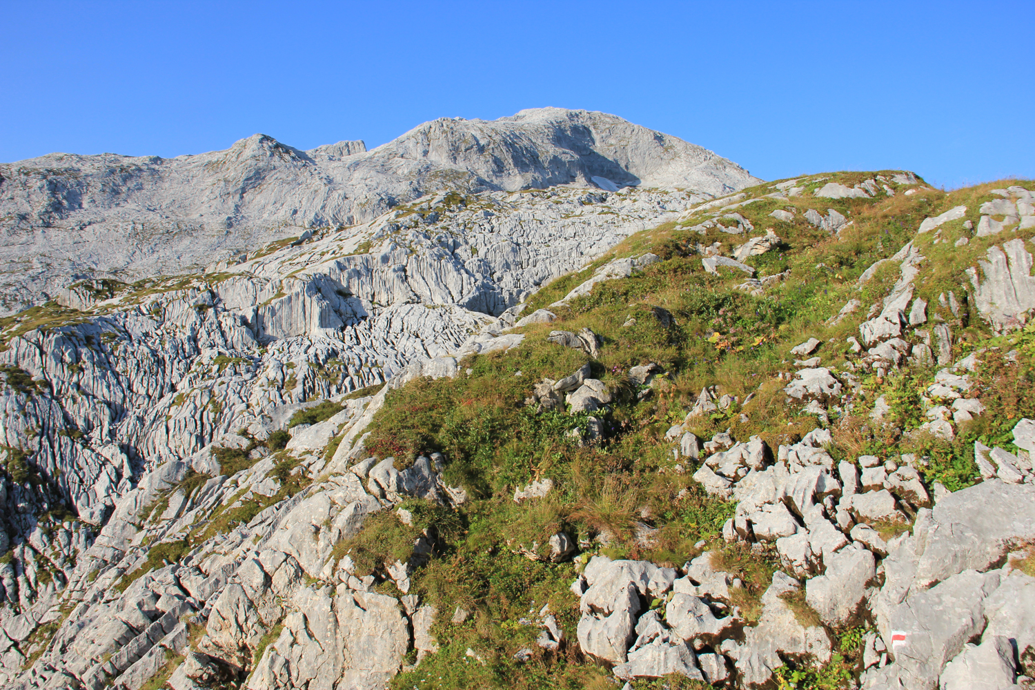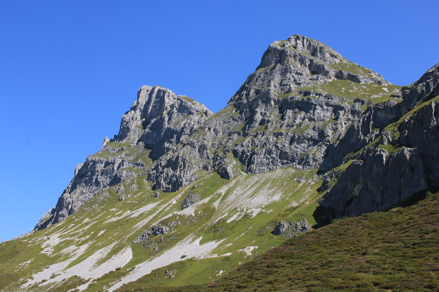 Die verlorenen Höhenmeter müssen natürlich wieder hereingeholt werden. Über schöne Wiesenhänge steige ich aufwärts, wobei die Mittagshitze einige Schweißtropfen bzw. -bäche verursacht. Zum Schluss gibt es noch eine längere flache Querung unter den Südabstürzen der Sulzfluh, dann ist die Carschinahütte erreicht.