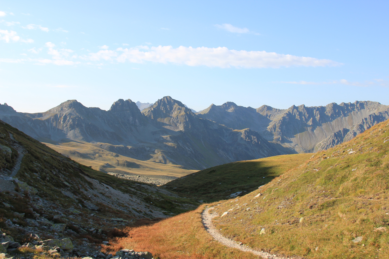 Auf meiner langen Ost-West-Wanderung werde ich heute von der Nordseite des Rätikons auf die Südseite wechseln, verbunden mit einem Grenzübertritt von Österreich in die Schweiz. Beim Aufbruch an der Tilisunahütte liegt der etwas tiefer gelegene Tilisunasee ganz ruhig da. Ausgesprochen flach geht es über idyllische Grashänge zum Gruobenpass und weiter zum Plasseggenpass, wo ein Schild auf die Landesgrenze hinweist.