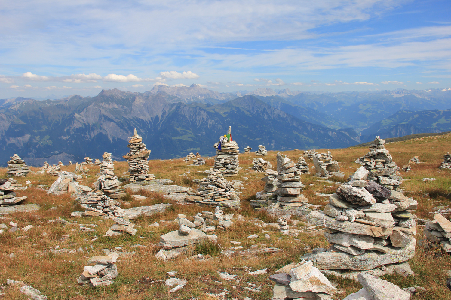 Nach einer ausgedehnten Gipfelpause steige ich auf dem gleichen Weg ab zur Wildseeluggen und zum namensgebenden Wildsee. Zum Glück ist der Betrieb nicht mehr so schlimm wie heute morgen. Ein "Stockwerk" tiefer liegt – ebenso schön wie der Wildsee – der zweite große See, der Schottensee. Nach einem Zwischenaufstieg zur Schwarzplangg geht es hinunter zum Schwarzsee, der tatsächlich eine auffallend dunkle Farbe aufweist. Vom Schwarzsee gelangt man nach einem weiteren Zwischenaufstieg zum breiten Rossstall-Rücken, der mit unzähligen Steinmännern geschmückt ist.