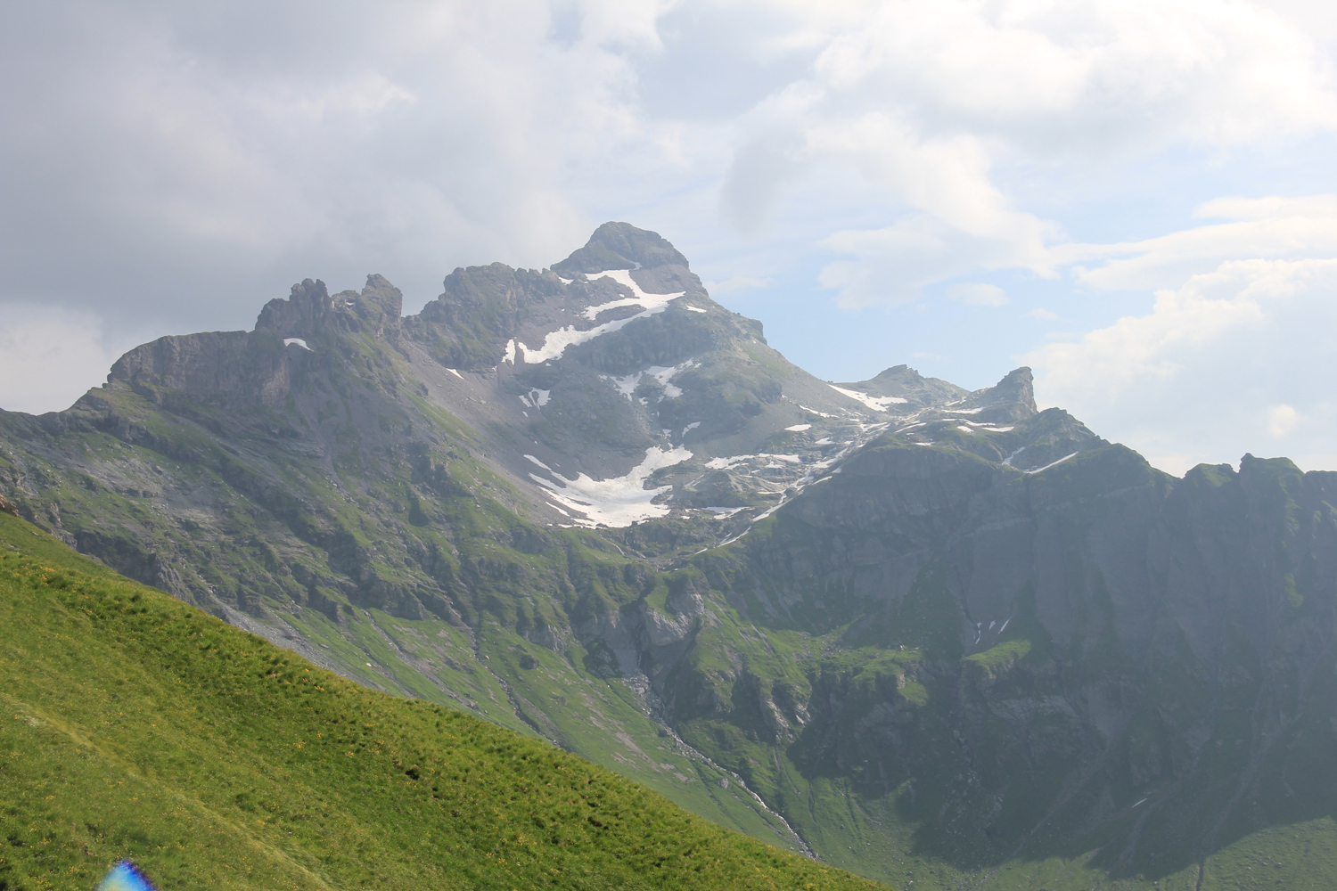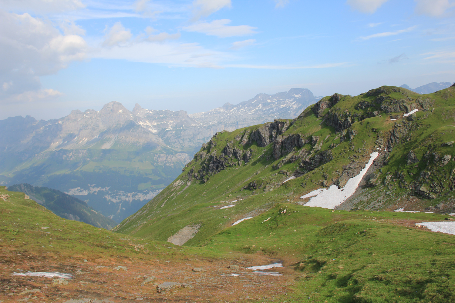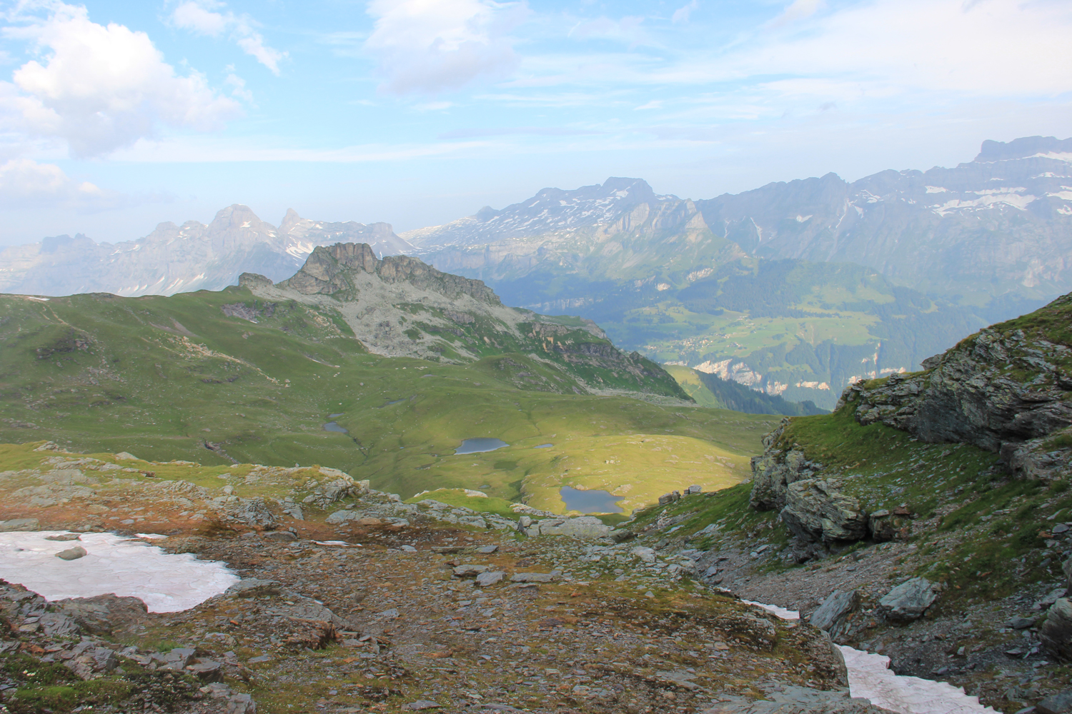 Die heutige Etappe meiner Weitwanderung besteht aus einer Querung von der Leglerhütte zum Richetlipass (unter Mitnahme des Chalchstöckli-Gipfels) und einem langen Talabstieg ins tief gelegene Linthal. Das Wetter ist nicht mehr ganz so hochsommerlich wie gestern, aber nach wie vor ganz ordentlich. Nur der starke Wind stört ein wenig.