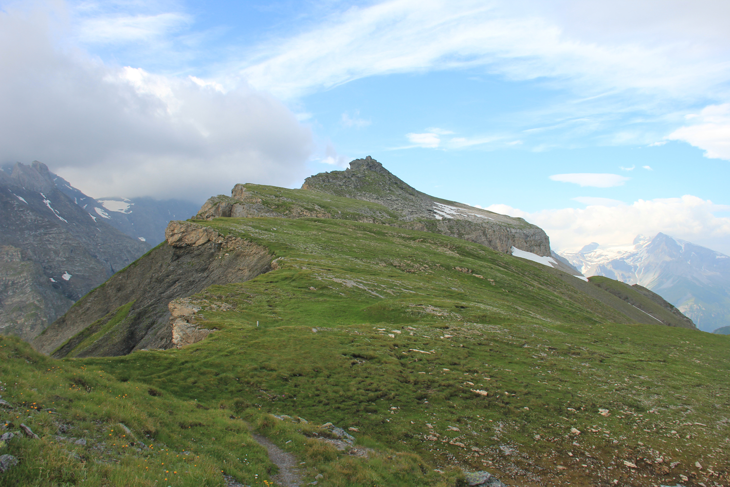 Der Weg passiert schon bald nach der Leglerhütte den schön gelegenen Milchspüelersee. Danach geht es über angenehm zu begehende Grashänge zu einem kleinen Sattel westlich unter dem Hanenstock. Im Nordwesten beherrscht das Glärnisch-Massiv die Szene, auch Ortstock und Höch Turm sind gut zu sehen. Der Blick in Richtung Tödi ist dagegen durch Wolken eingeschränkt. Ein einfacher grasiger Aufstieg bringt mich zum höchsten Punkt der heutigen Tour, dem Chalchstöckli. Wegen der starken Windböen verlasse ich den Gipfel schnell wieder, um zum Richetlipass abzusteigen. In diesem Bereich ist der Weg etwas anspruchsvoller als bisher, übersteigt aber kaum die Schwierigkeitsstufe T3.