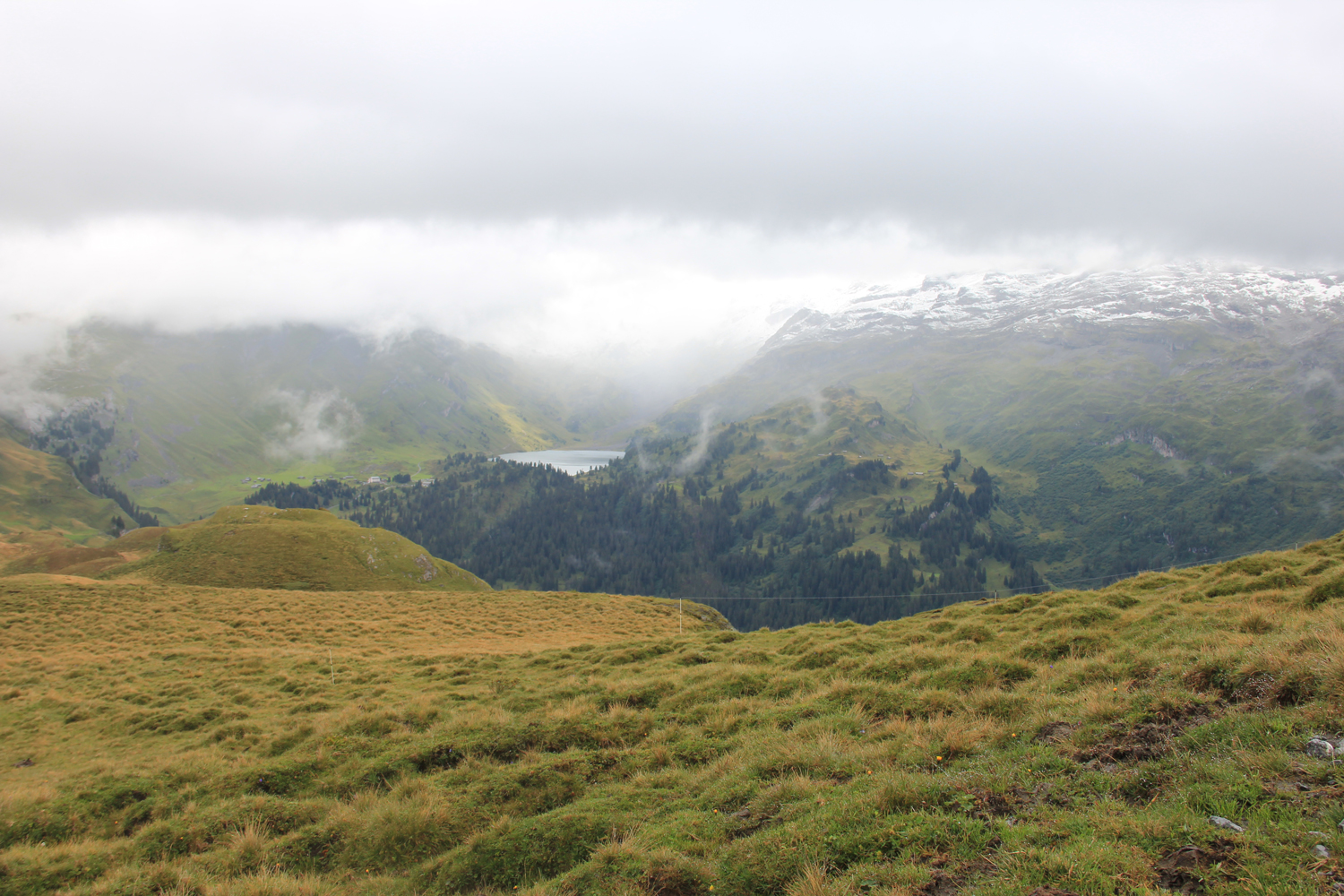 Auf einem bequemen, sanft ansteigenden Weg geht es zur Tannalp und zum Tannensee, der bei schönerem Wetter sicher mehr Besuch erhält als heute. Weiter oben ist das Gras ein wenig mit Schnee überzuckert. Vom Kamm zum Balmeregghorn ist nur der untere Teil zu sehen, da die Wolkenuntergrenze etwa bei 2200 m liegt. Die Orientierung macht allerdings auch bei den heutigen Sichtverhältnissen keine Probleme.