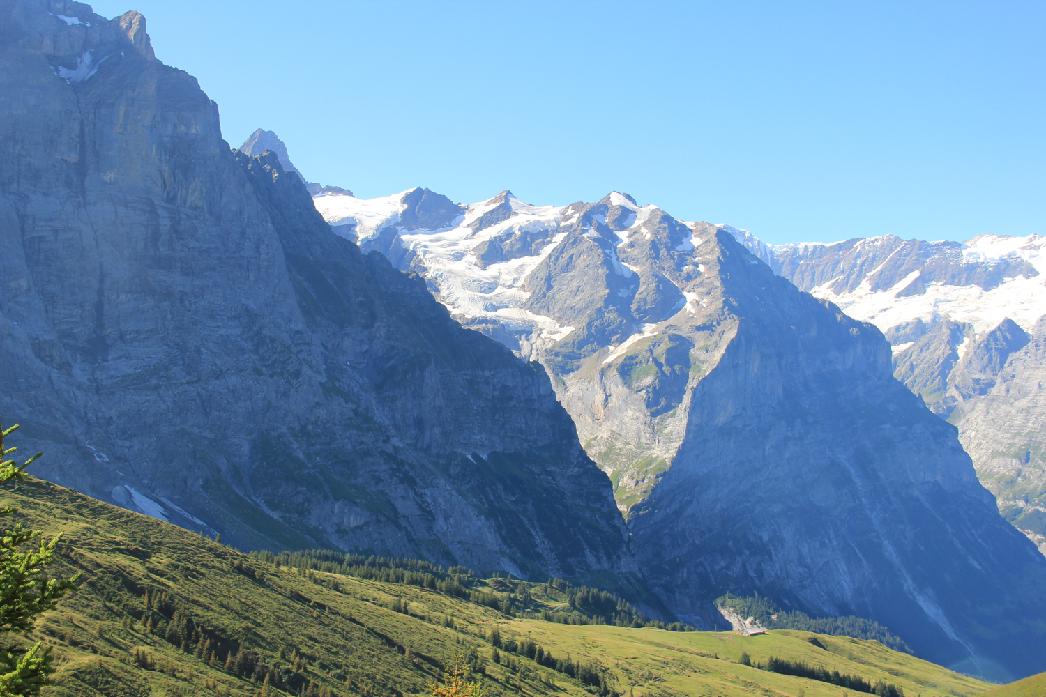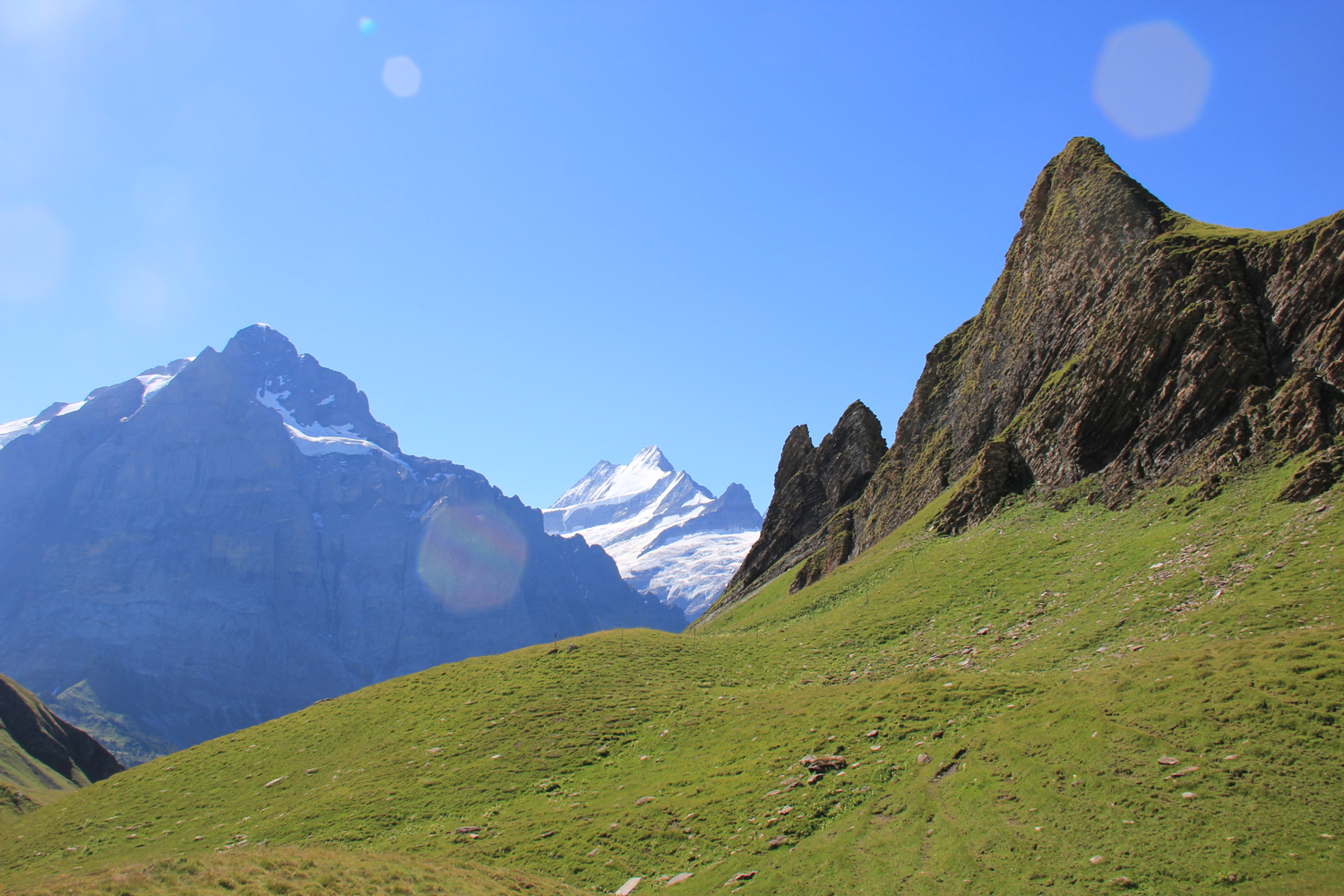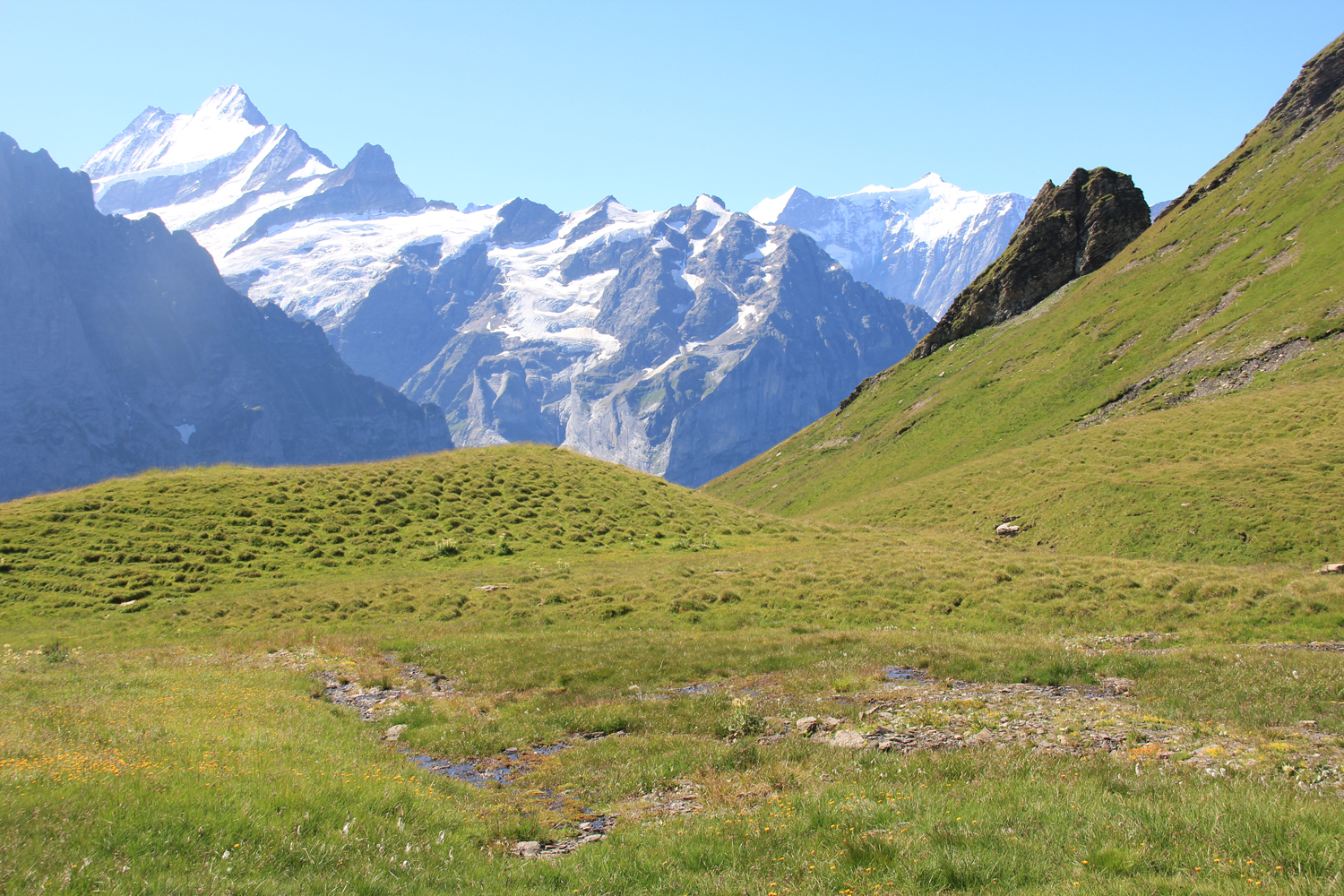Die Aussicht am Gipfel ist überwältigend. Die großen Gipfel der Berner Alpen, Wetterhorn, Eiger, Finsteraarhorn, Lauteraarhorn, Schreckhorn und viele andere, sind beeindruckend. Klar, dass meine Gipfelpause ziemlich umfangreich ausfällt! Der Abstieg zur Grossen Scheidegg erfolgt auf dem gleichen Weg. Dadurch, dass die großen Berge jetzt vor mir liegen, ist der Genuss noch größer als im Aufstieg. Ähnlich wie im letzten Jahr sind gegenüber in der Wetterhorn-Nordwand wieder kleine Schneelawinen zu beobachten, aus sicherer Entfernung, versteht sich.