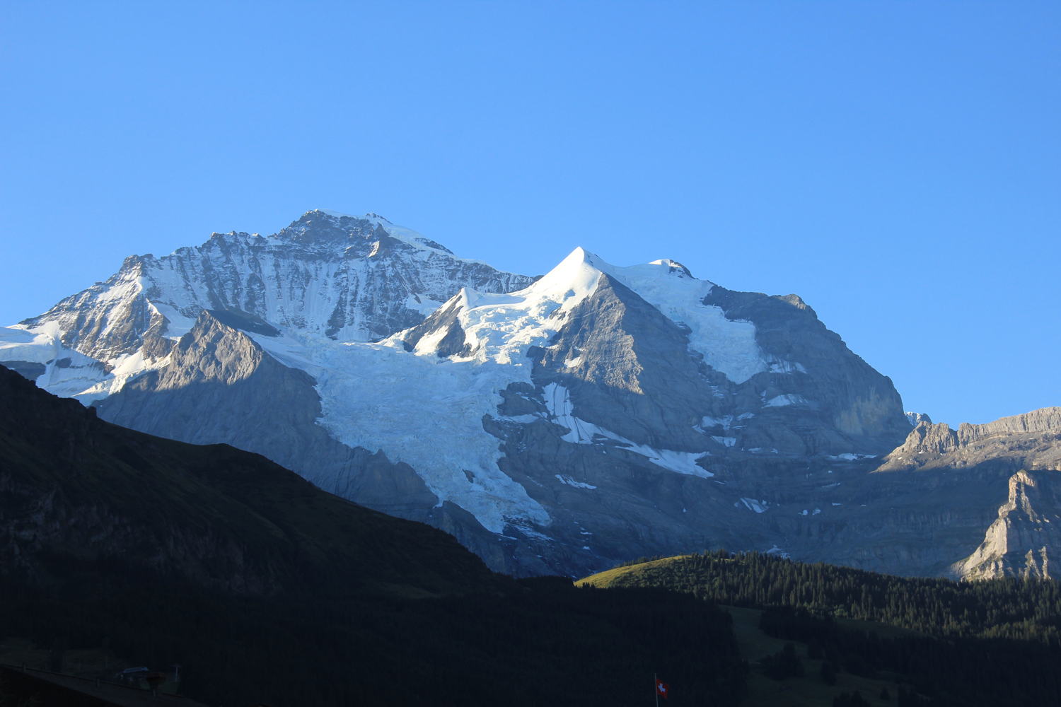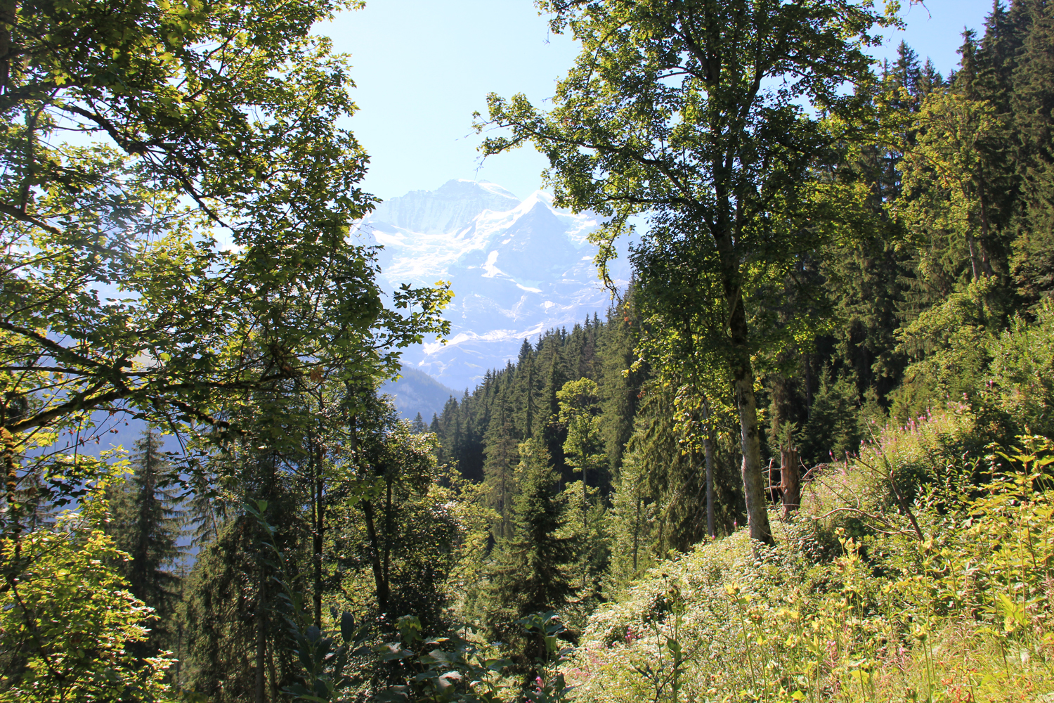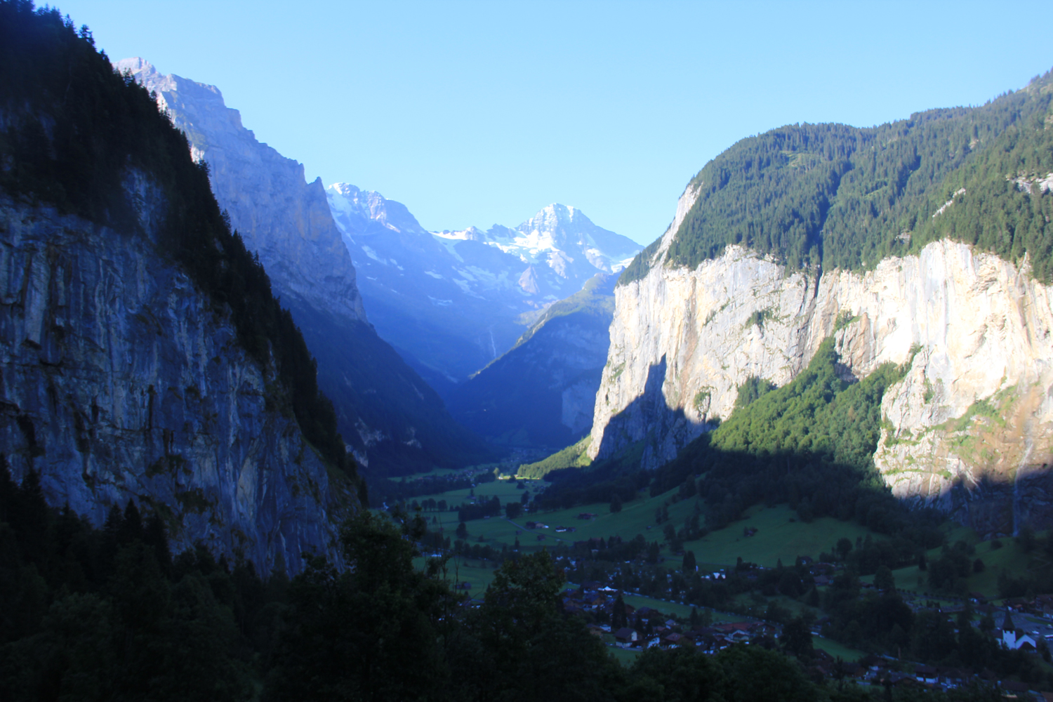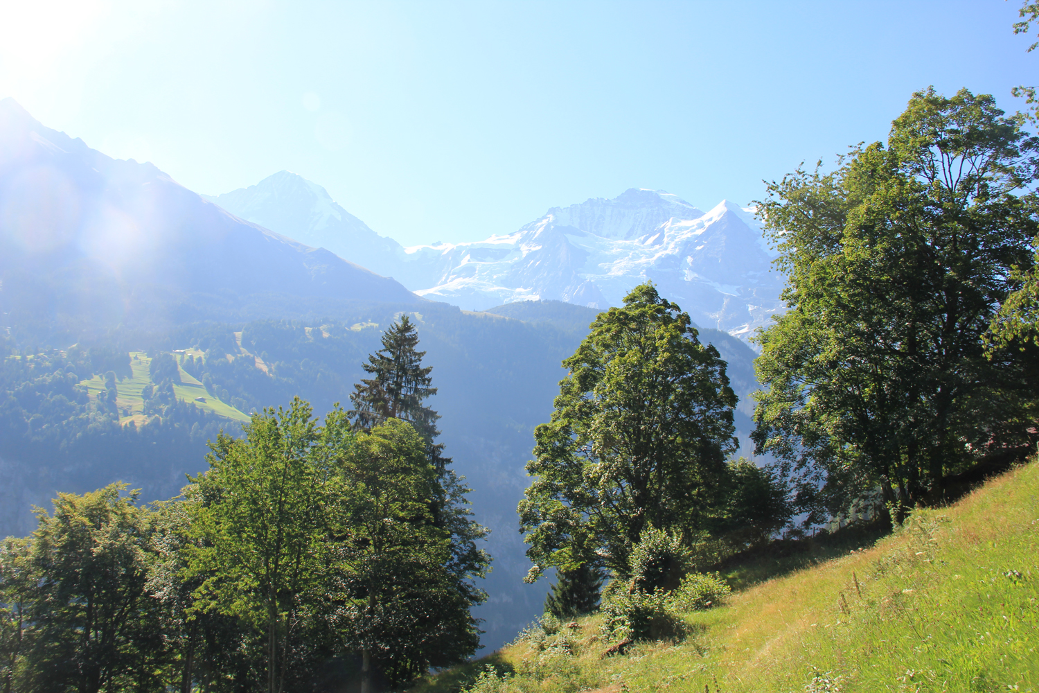 Das gestrige Gewitter hat sich längst verzogen, kein Wölkchen ist am Himmel zu sehen, als ich in Wengen zur nächsten Etappe meiner Ost-West-Wanderung aufbreche. Die Tour beginnt mit einem gemütlichen Abstieg (knapp 500 Höhenmeter) nach Lauterbrunnen. Der Name des Ortes war mir bisher vor allem durch Fernsehberichte über tollkühne Wingsuit-Flüge geläufig.