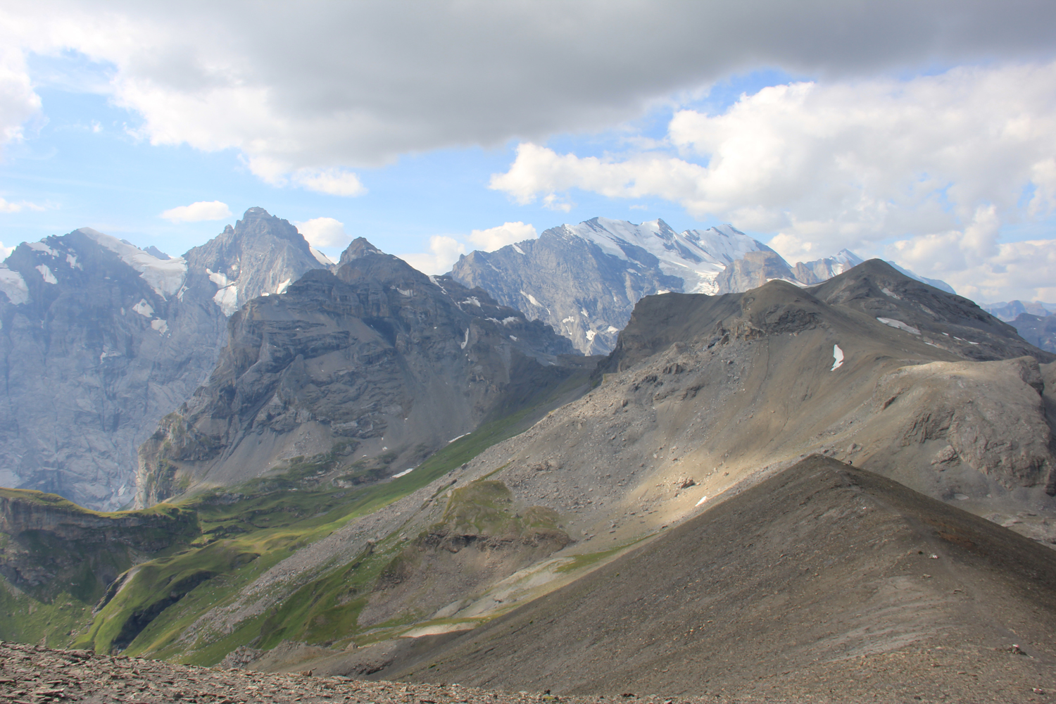 Für die heutige Etappe meiner Weitwanderung habe ich mir einen Gipfel vorgenommen, der James-Bond-Fans wohlvertraut sein dürfte: Piz Gloria alias Schilthorn. Das Wetter ist nicht mehr ganz so prächtig wie gestern; dennoch ist ein schöner Bergtag zu erwarten. Von der Rotstockhütte gehe ich ein kurzes Stück auf dem Weg Richtung Sefinafurgga, dann biege ich nach rechts ab, wo ein relativ steiler Weg zum Sattel "Rote Härd" hinaufführt. Da mein Tagesprogramm recht umfangreich ist, deponiere ich meinen Rucksack und steige fast ohne Gepäck weiter. Der Schlussaufstieg zum Gipfel hat oft den Charakter einer einfachen Kammwanderung, enthält aber auch klettersteigähnliche Passagen. Für einigermaßen trittsichere und schwindelfreie Bergwanderer sind diese Stellen aber problemlos machbar. Im Gipfelbereich gibt es Informationstafeln zu den Dreharbeiten sowie zu den Schauspielerinnen und Schauspielern des Films "Im Geheimdienst Ihrer Majestät", der 1969 in die Kinos kam. Nach kurzer Gipfelpause (mit leider nicht besonders guter Fernsicht) mache ich mich wieder auf den Weg, um zu meinem Rucksack zurückzukehren.