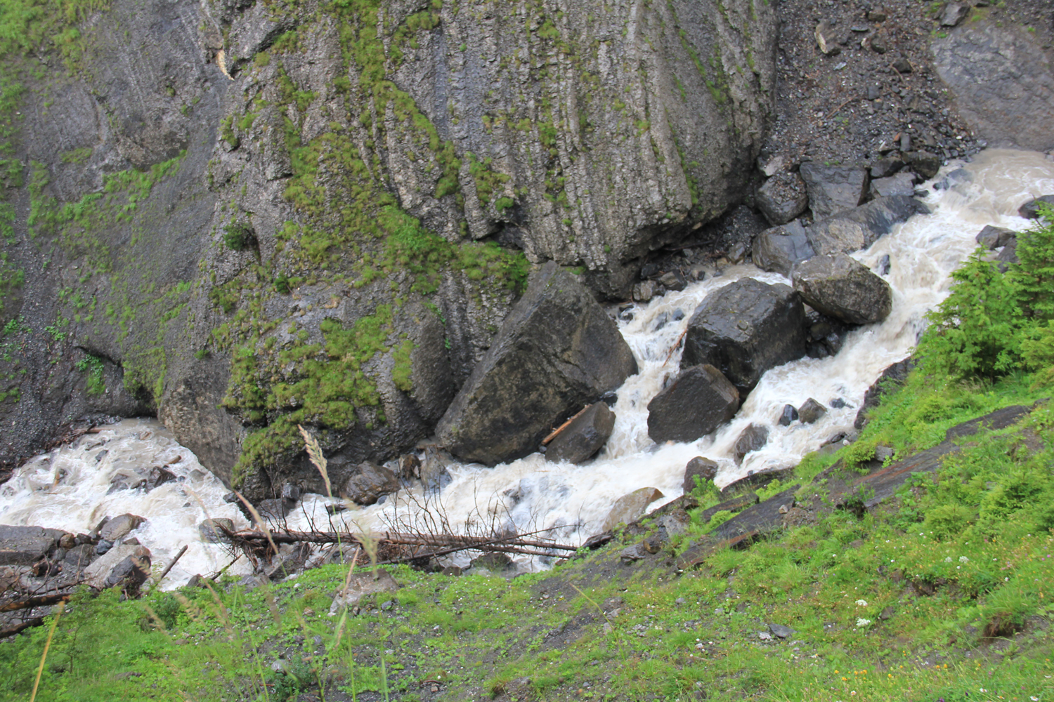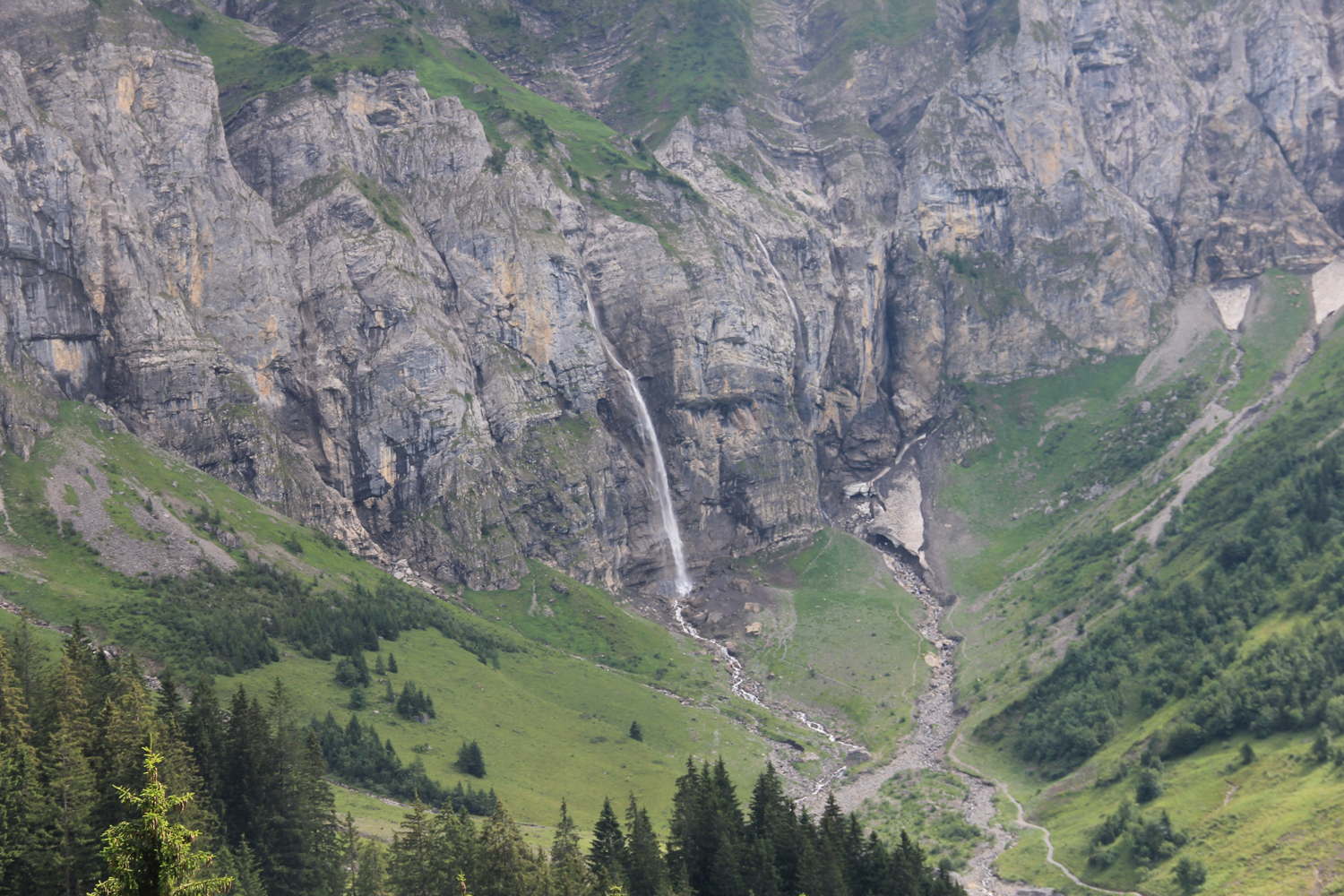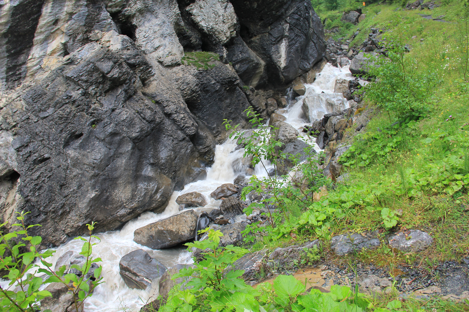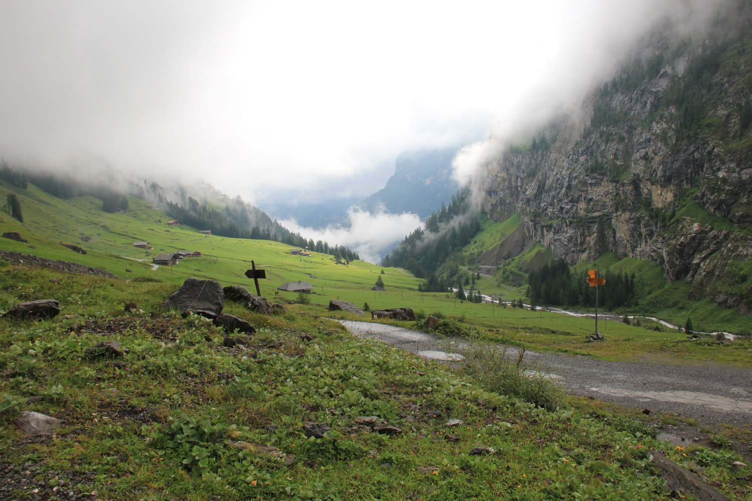 Während des langen Abstiegs über die Bonderalp bessert sich das Wetter allmählich. Nach etwa 1300 Abwärts-Höhenmetern habe ich die Brücke über den Fluss erreicht. Als kleine Schikane zum Abschluss gilt es jetzt noch, rund 100 Meter aufzusteigen, bis das Zentrum von Adelboden erreicht ist.