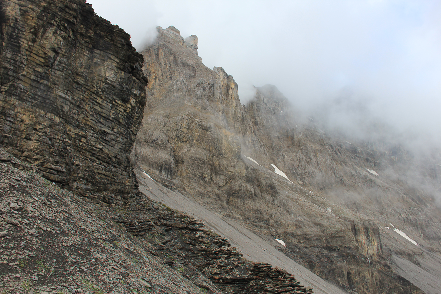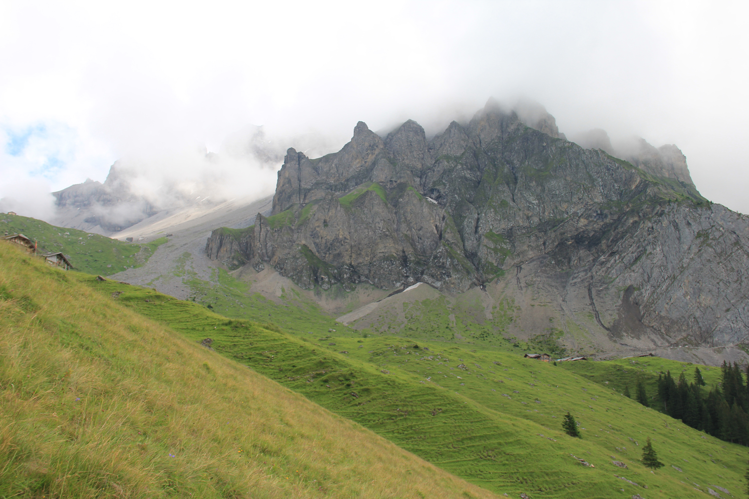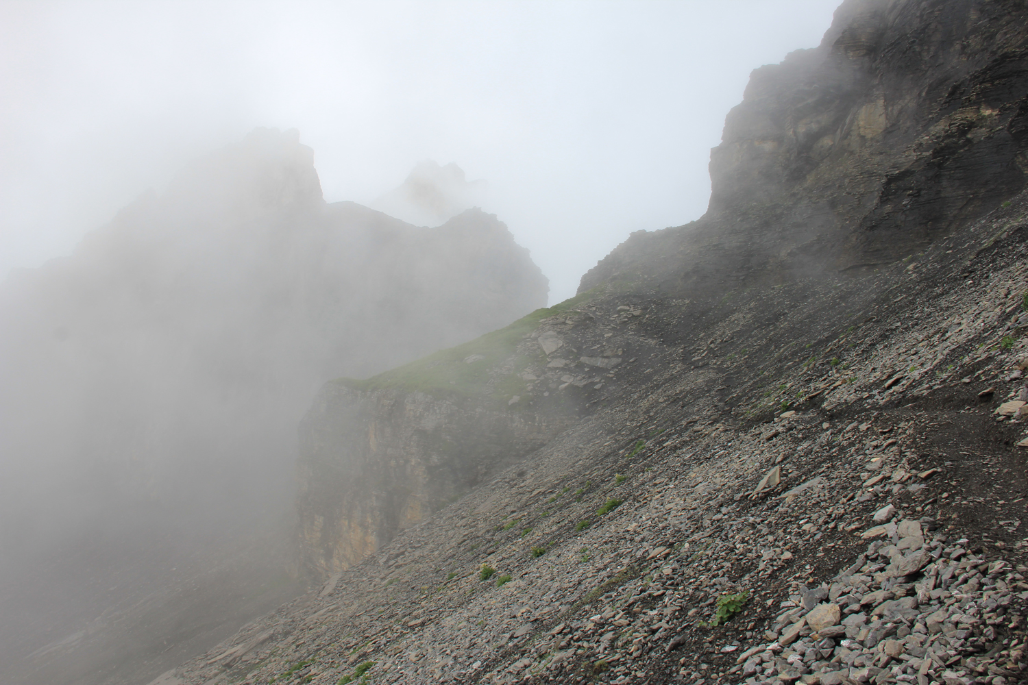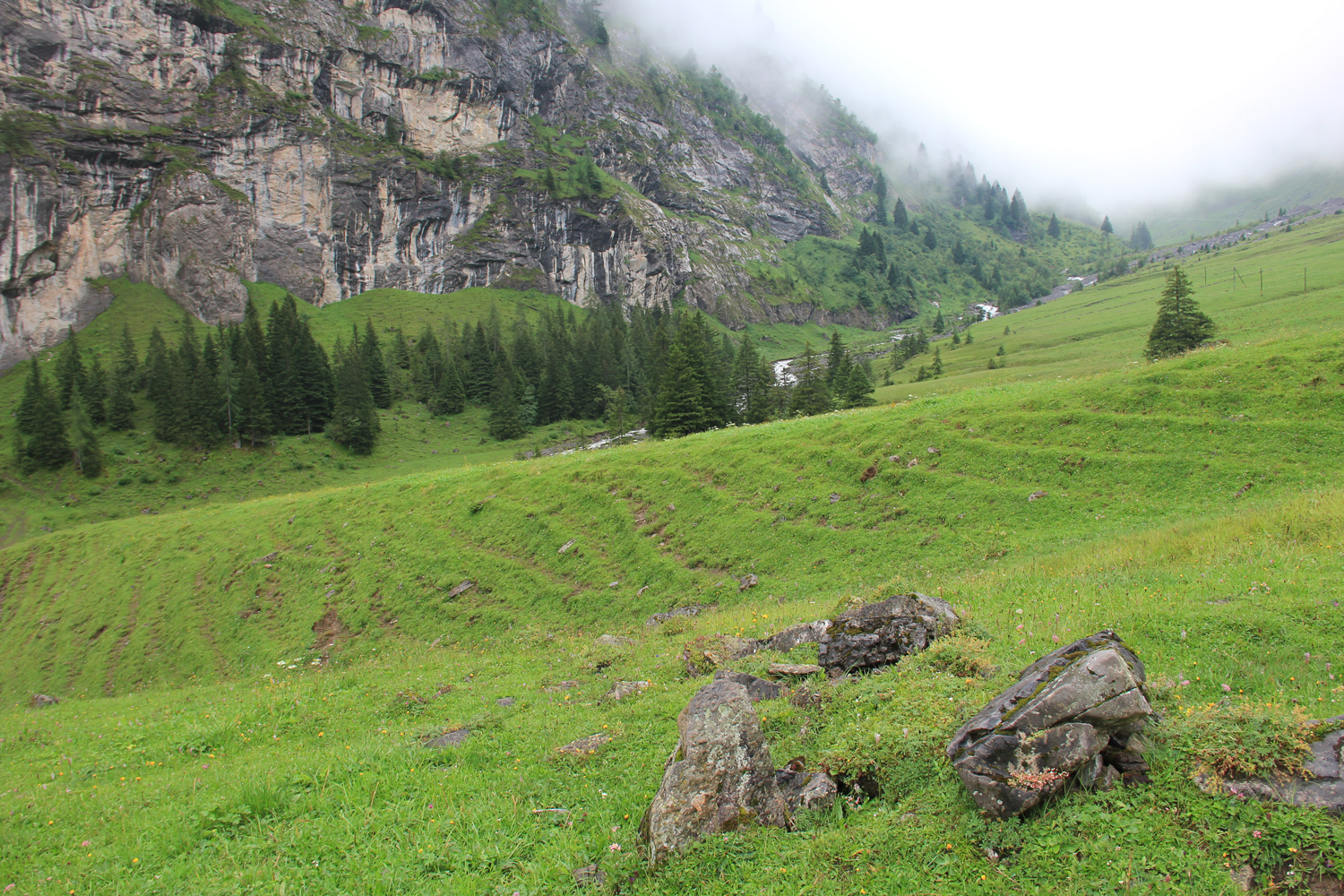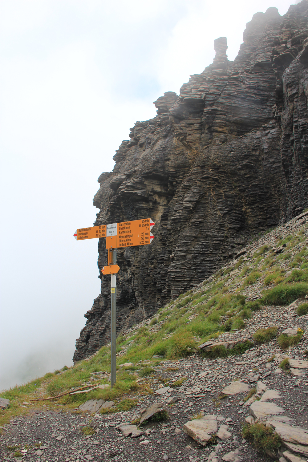 Vom Bahnhof Kandersteg geht es zuerst fast waagrecht auf der Westseite der Kander nach Eggenschwand. Hier beginnt ein netter Weg entlang des stellenweise recht wilden Alpbachs. Nach der Alpe Usser Üschene wird es steiler. Über Grashänge und einen kleinen Felsriegel erreiche ich schließlich den Sattel der Bunderchrinde. Es ist ziemlich neblig, aber inzwischen zumindest trocken.