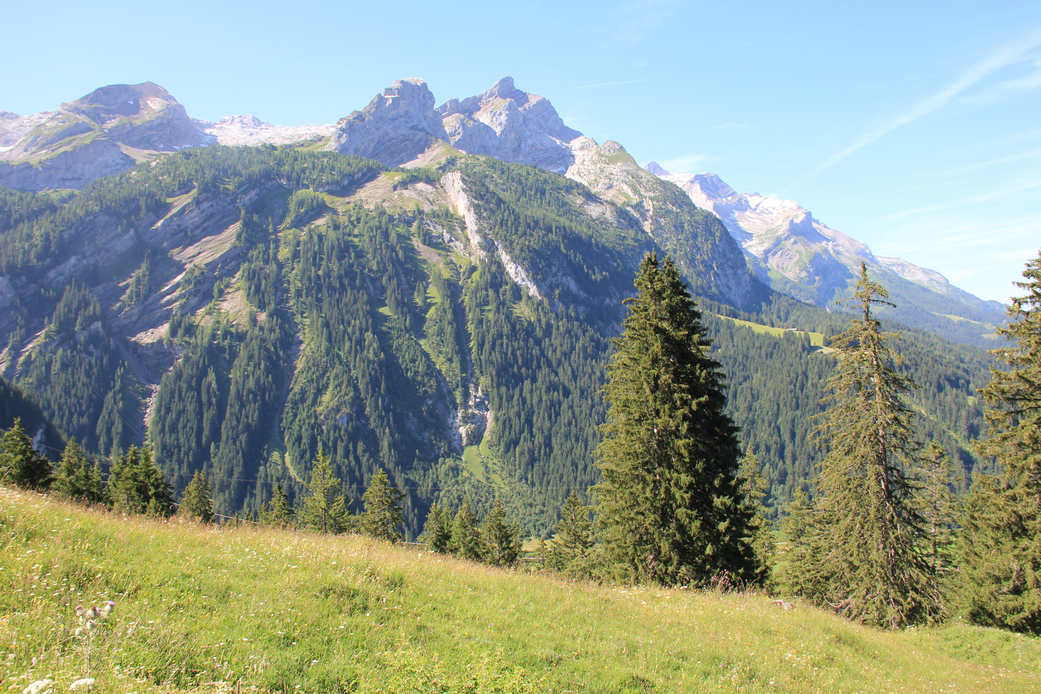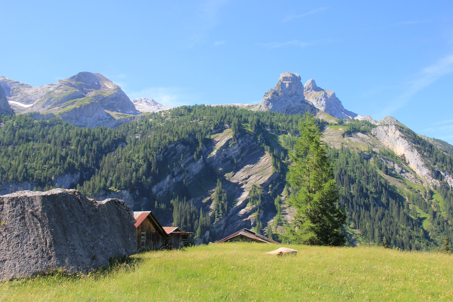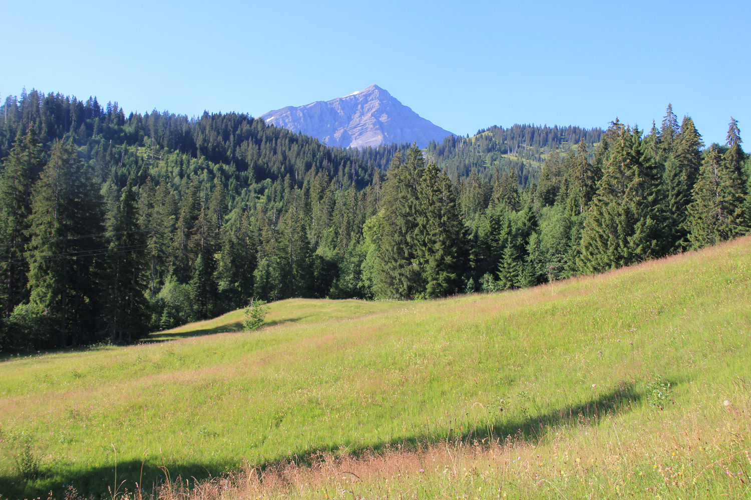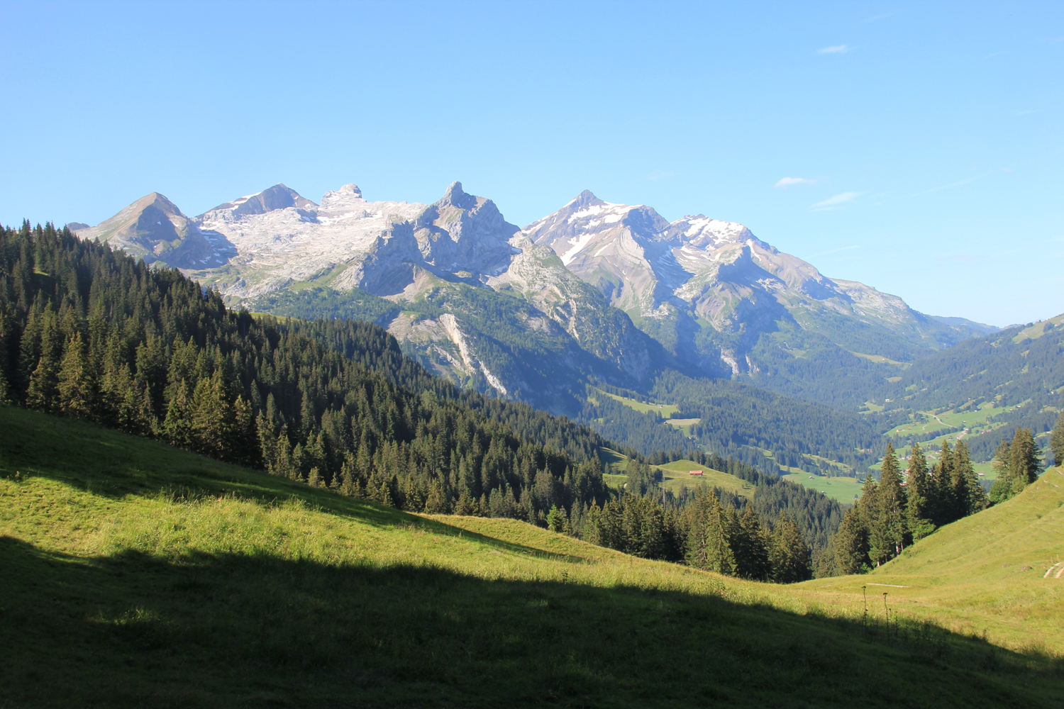 Beim Aufbruch ist es noch einigermaßen kühl. Auf einem schattigen Waldweg steige ich hinauf zum Chrine-Sattel. Weiter geht es auf dem Weg in Richtung Gsteig bis zu einer Abzweigung (1374 m). Von hier kann man ohne großen Höhenverlust, vorbei an den Häusern von Längmatte, hinüberqueren zu dem Weg, der von Gsteig zum Sanetsch-Stausee hinauf führt. (Soweit mir bekannt, ist dieser Weg inzwischen wegen Bergsturz gesperrt.) Nach einer kurzen Erholungspause wandere ich der Ostseite des Sees entlang, um zum Sanetschpass aufzusteigen. Zum Glück kann man der Straße, die von Süden über den Pass zum Stausee führt, gut ausweichen. Leider sind in der Zwischenzeit Wolken aufgezogen, sodass der Blick auf die Walliser Alpen etwas eingeschränkt ist.