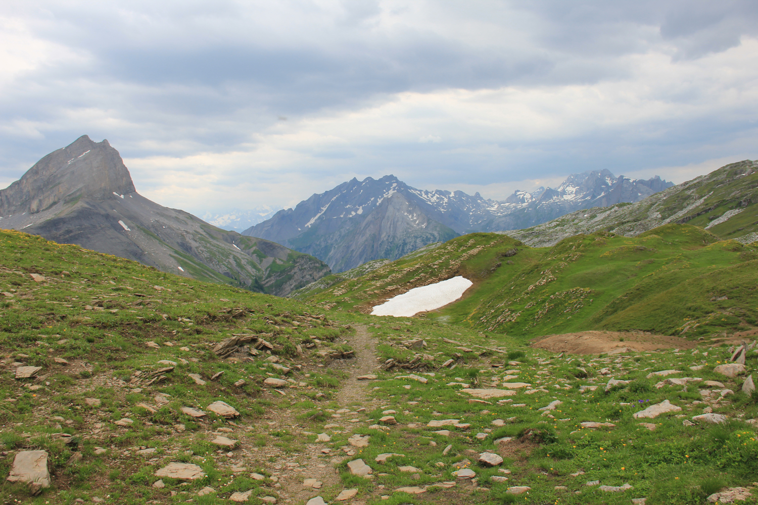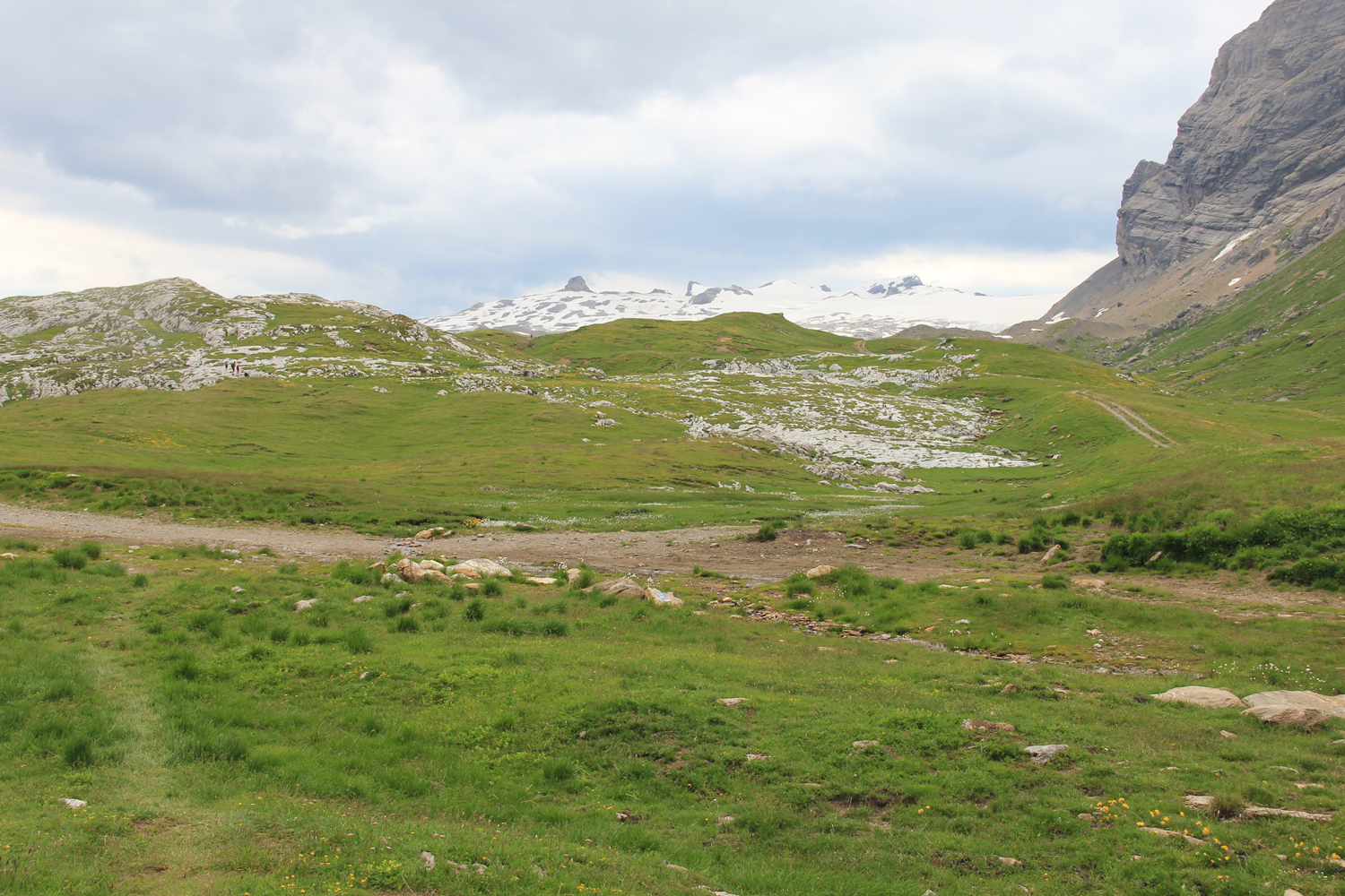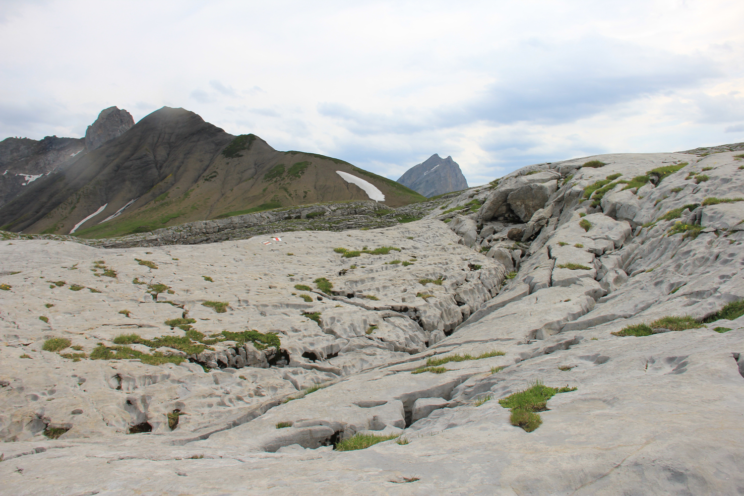 Nach der Passhöhe, die zugleich Sprachgrenze ist, geht es etwa 150 Höhenmeter parallel zur Straße abwärts, bis bei Tsanfleuron ein Weg nach Westen abzweigt. Beschilderung und Markierungen sind hier etwas spärlich, sodass ich ein wenig Probleme mit der Orientierung bekomme. Der Gesamtverlauf entlang des ausgetrockneten Bachs ist allerdings klar; allmählich gewinnt der Weg wieder an Höhe. In der Nähe des Sex Rouge folge ich der Abzweigung nach Süden. Ein wenig einfache Kletterei, ein paar Karrenfelder, dann bin ich am höchsten Punkt der Tagesetappe (etwa 2300 m) angekommen, wo die Abstiegsroute gut zu überblicken ist.