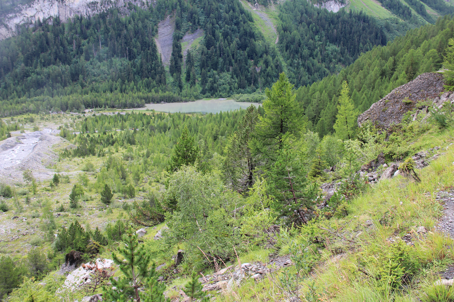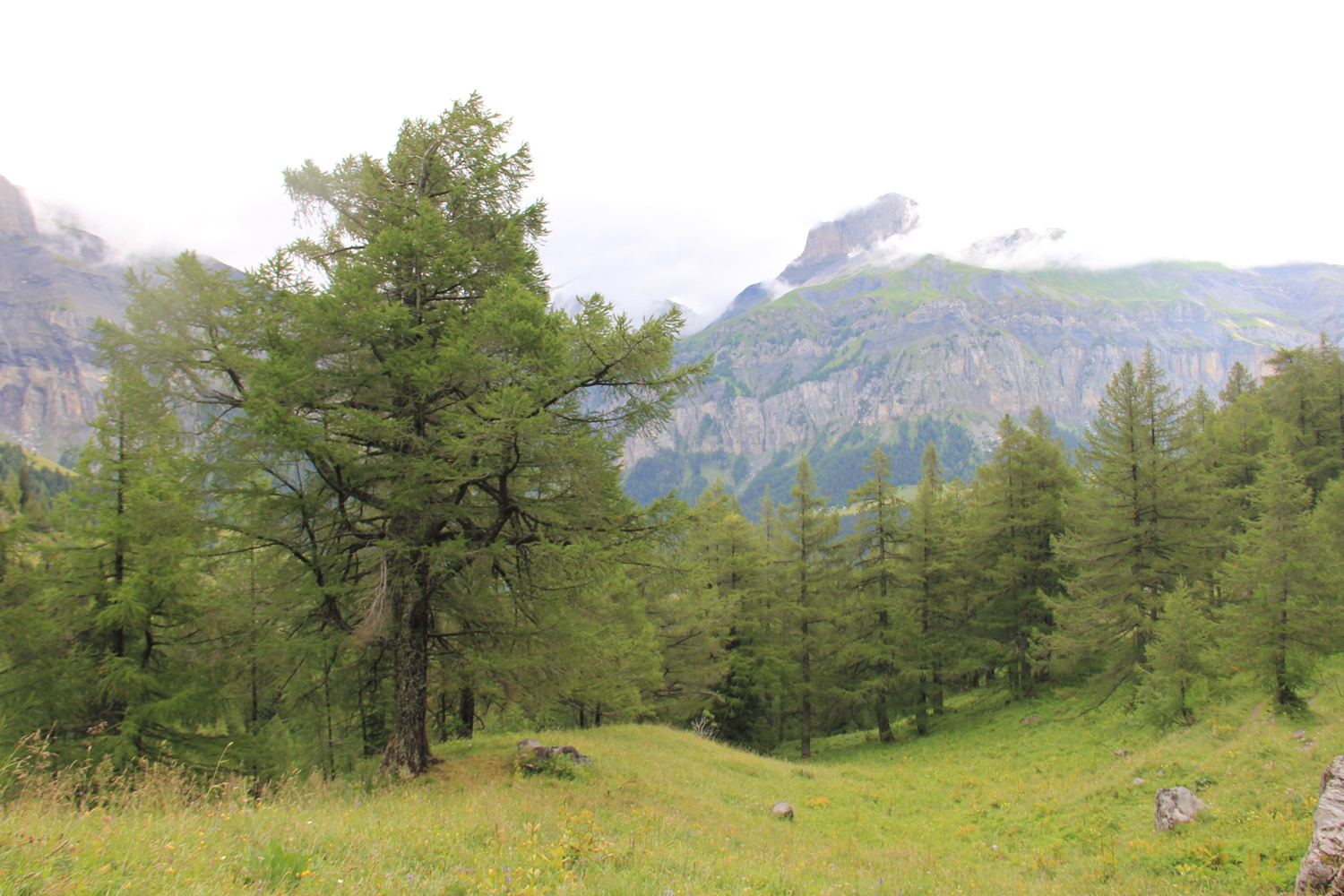 Von Le Godé, wo ich übernachtet habe, wandere ich auf dem Fahrweg hinüber zum Lac de Derborence. Dieser See entstand im Jahre 1749 durch einen riesigen Felssturz. Hier zweigt rechts ein Steig ab, der den Aufstieg ins Tal des Chevillence-Bachs ermöglicht. Nach der Brücke über den Bach folgt ein steilerer Wegabschnitt, bevor der Pas de Cheville erreicht ist. Es schließt sich eine weite, flache Hochebene an. In westlicher Richtung marschiere ich zu den Häusern von Anzeindaz. Nur zu gerne nutze ich die Einkehrmöglichkeit im Refuge und die damit verbundene Unterbrechung der Regenwanderung.