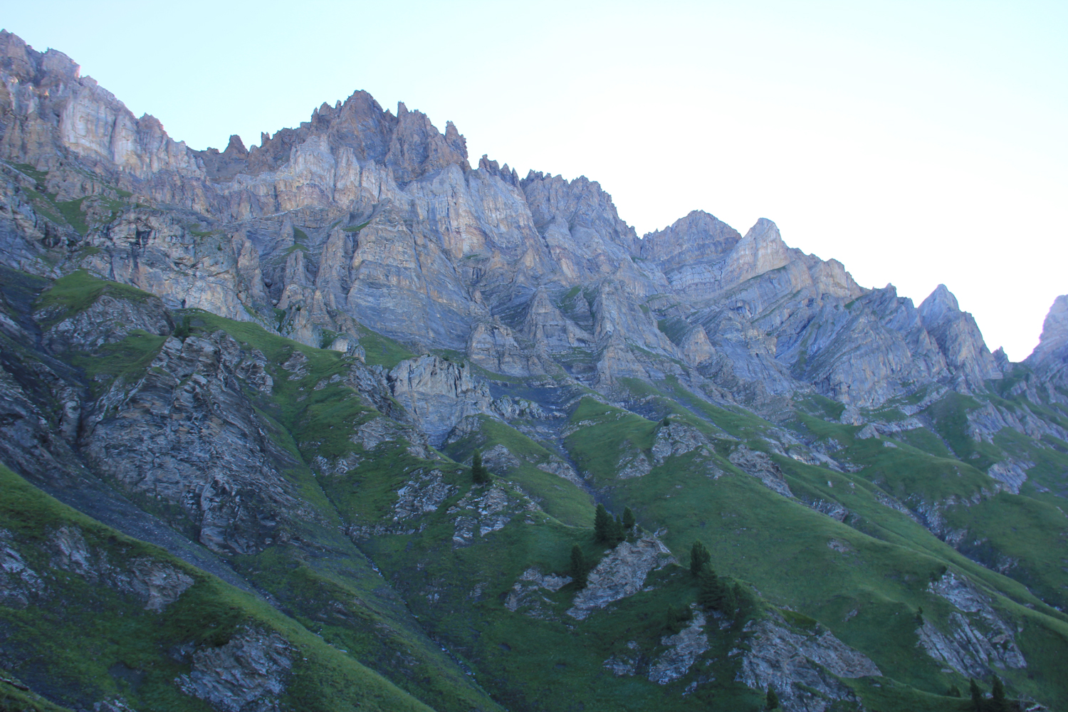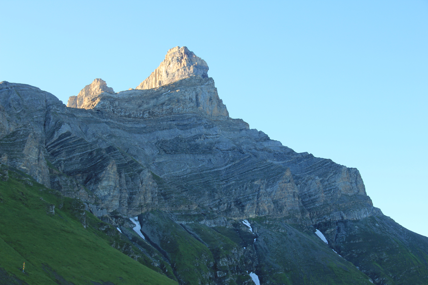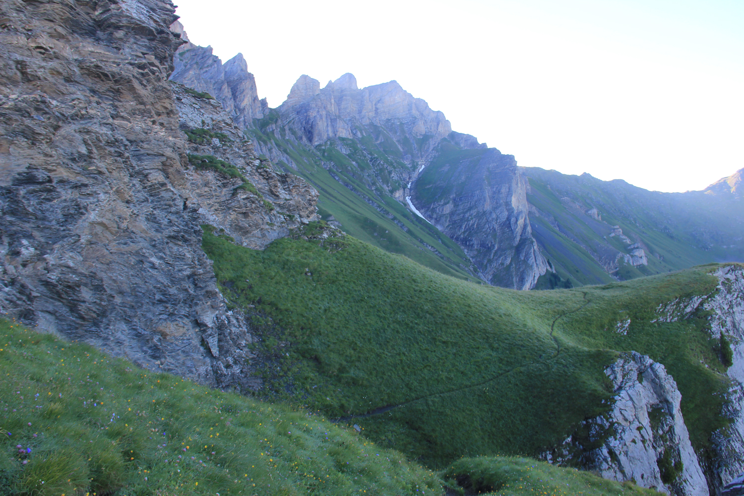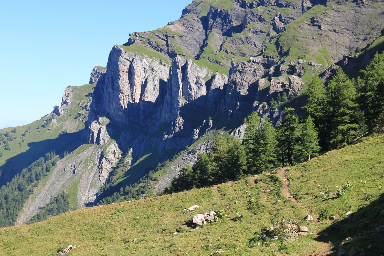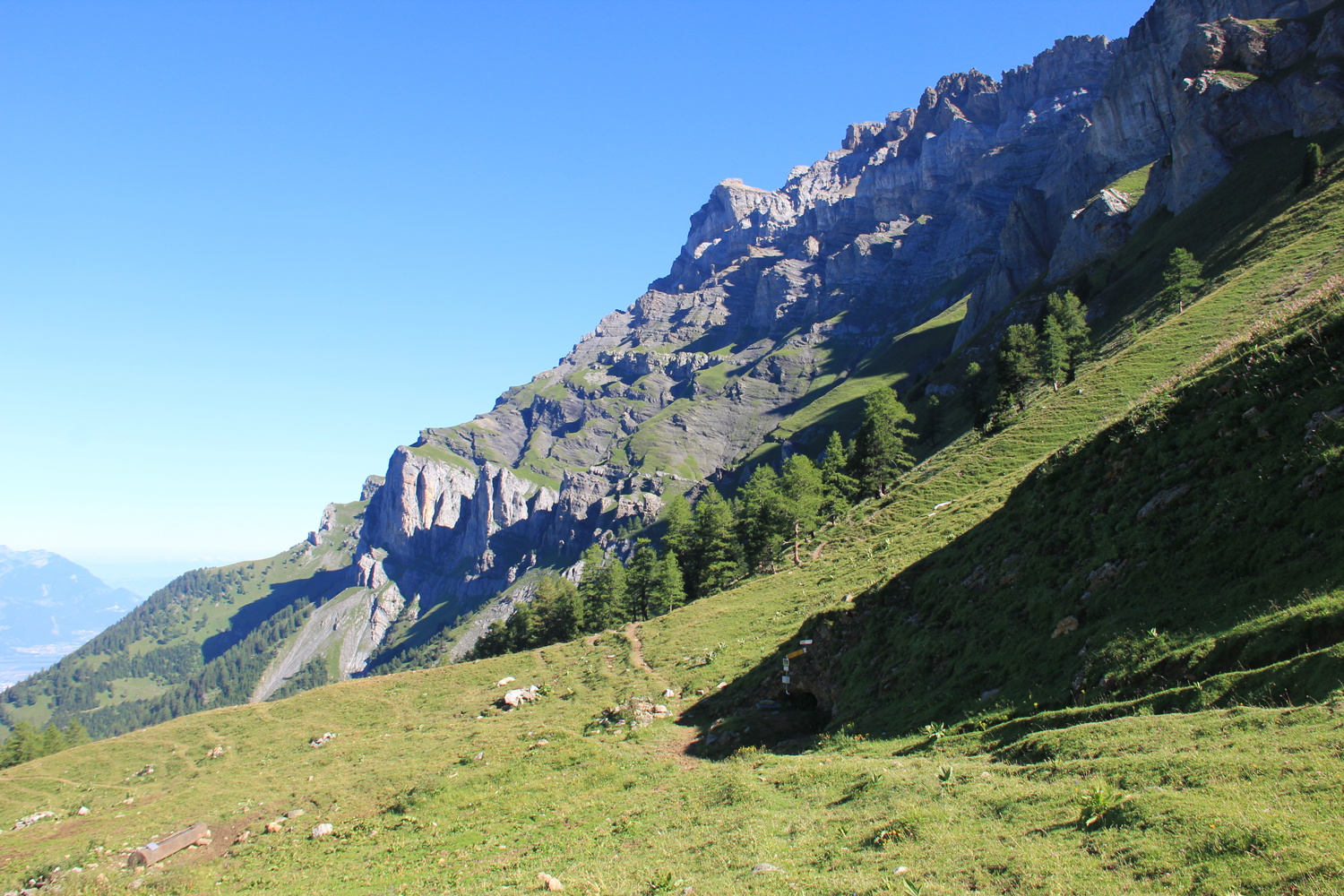 Ein wunderbarer Tag, gerade recht für so eine aussichtsreiche Tour! Gestern, bei meiner Ankunft an der Cabane de la Tourche, waren die Berge zum größten Teil in Wolken versteckt; erst kurz vor Sonnenuntergang ließ sich für einige Momente der Mont Blanc blicken. Jetzt, am Morgen, ist die Aussicht fantastisch. Von der Hütte quere ich hinüber zum Absatz Rionda, wo man die Wahl hat zwischen zwei Wegen zum Col du Demècre. Beim einen Weg (rechts) verliert man rund 500 Höhenmeter, bevor man über das Chalet Neuf zum Pass aufsteigt; nach den Informationen, die mir vorliegen, empfiehlt sich diese Variante bei schlechtem Wetter. Da die Verhältnisse heute wirklich gut sind, wähle ich den linken Weg, eine genussreiche Querung unter der Dent de Morcles, bei der man fast immer die Berge der Mont-Blanc-Gruppe vor Augen hat. Ein wenig Trittsicherheit ist hier angebracht, aber wirklich schwierig wird es nie. Der Col du Demècre mit der gleichnamigen Hütte (zum Zeitpunkt meiner Tour im Umbau) ist der höchste Punkt für heute.