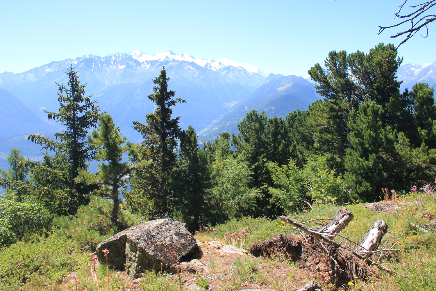 Die Fortsetzung der Wanderung erfolgt auf sehr bequemen, einfachen Wegen, zunächst auf der Westseite des grasigen Kamms, später am Kamm selbst. Vom Aussichtspunkt Sex Carro, der schöne Ausblicke auf Mont Blanc und Walliser Alpen bietet, sehe ich hinunter auf die Stadt Martigny. Es wird noch ein langer Abstieg ins Rhonetal!