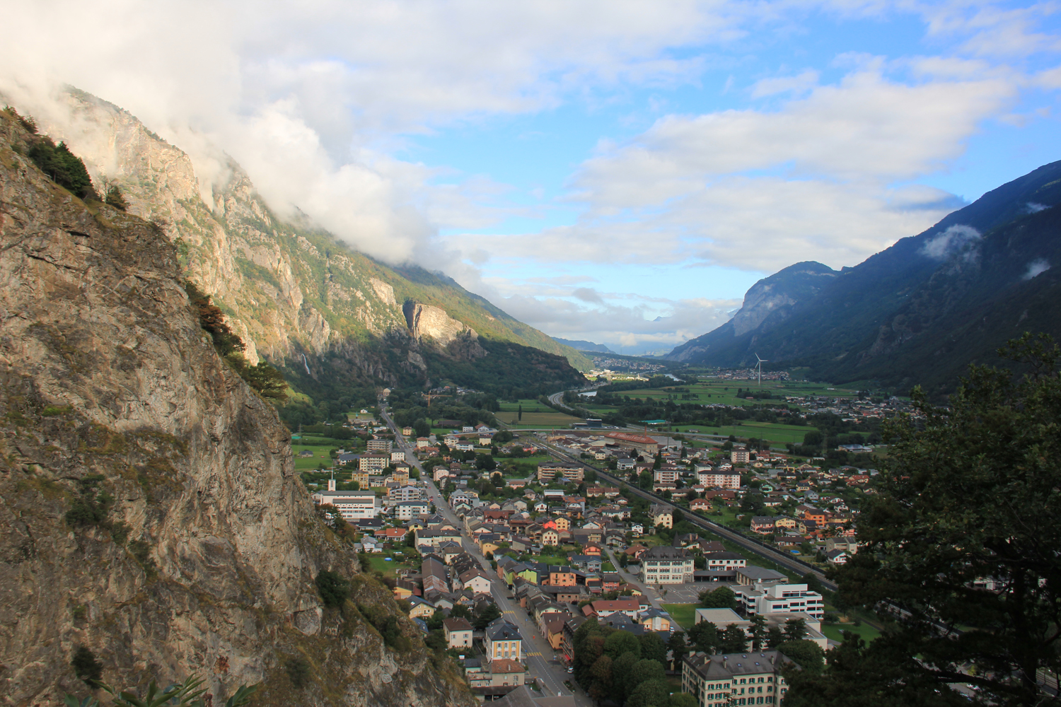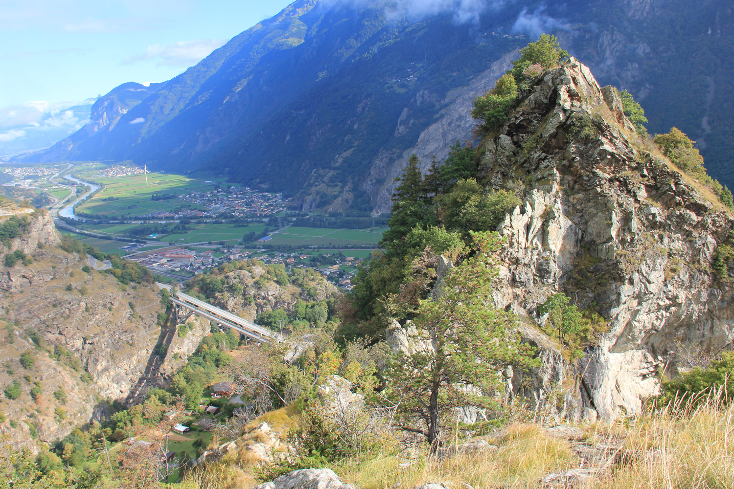Schon gestern habe ich den Talspaziergang vom Hotel in Martigny nach Vernayaz absolviert. Heute nehme ich am Morgen den Zug nach Vernayaz, wo der Weg in einer gut begehbaren Schlucht beginnt. Bald wird das Gelände freier und bietet schöne Ausblicke auf das Rhonetal und auf die spektakuläre Brücke von Gueuroz. Am Ende dieses kleinen Dorfes zweigt links ein schmaler Weg ab, der zuerst am Kamm (gelegentlich sogar ein wenig ausgesetzt), dann rechts unterhalb des Kamms zu den Häusern von Charavex führt. Hier biege ich erneut nach links ab, um über einen Waldpfad und einen kleinen Sattel (Le Coeur) auf die Südostseite des Bergkamms zu gelangen. Auf einem bequemen Wirtschaftsweg geht es weiter zur Alpe L'Arpille. Von hier führt ein einfacher Wanderpfad durch Wiesen und lichten Wald von Norden zum Gipfel des Mont de l'Arpille.