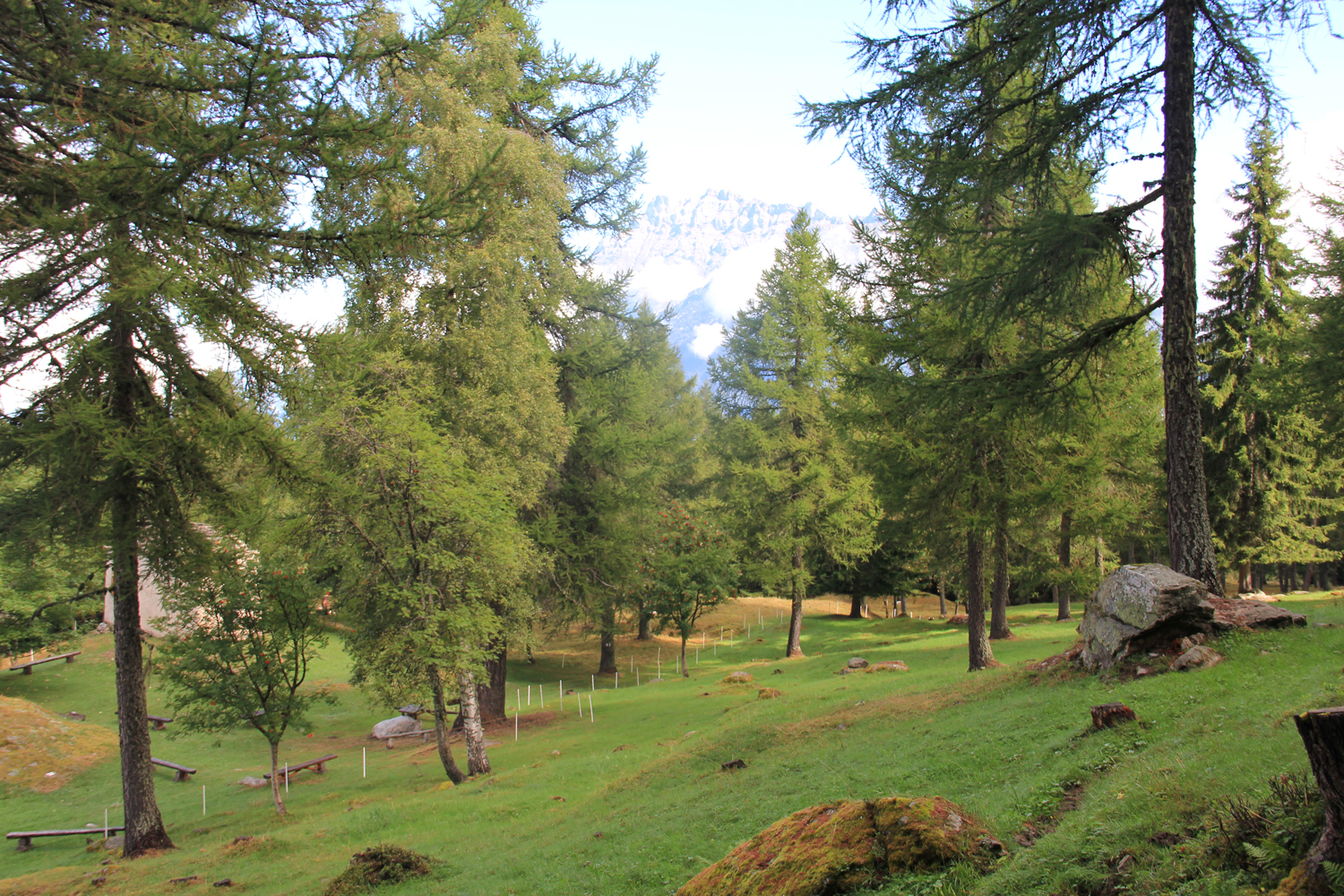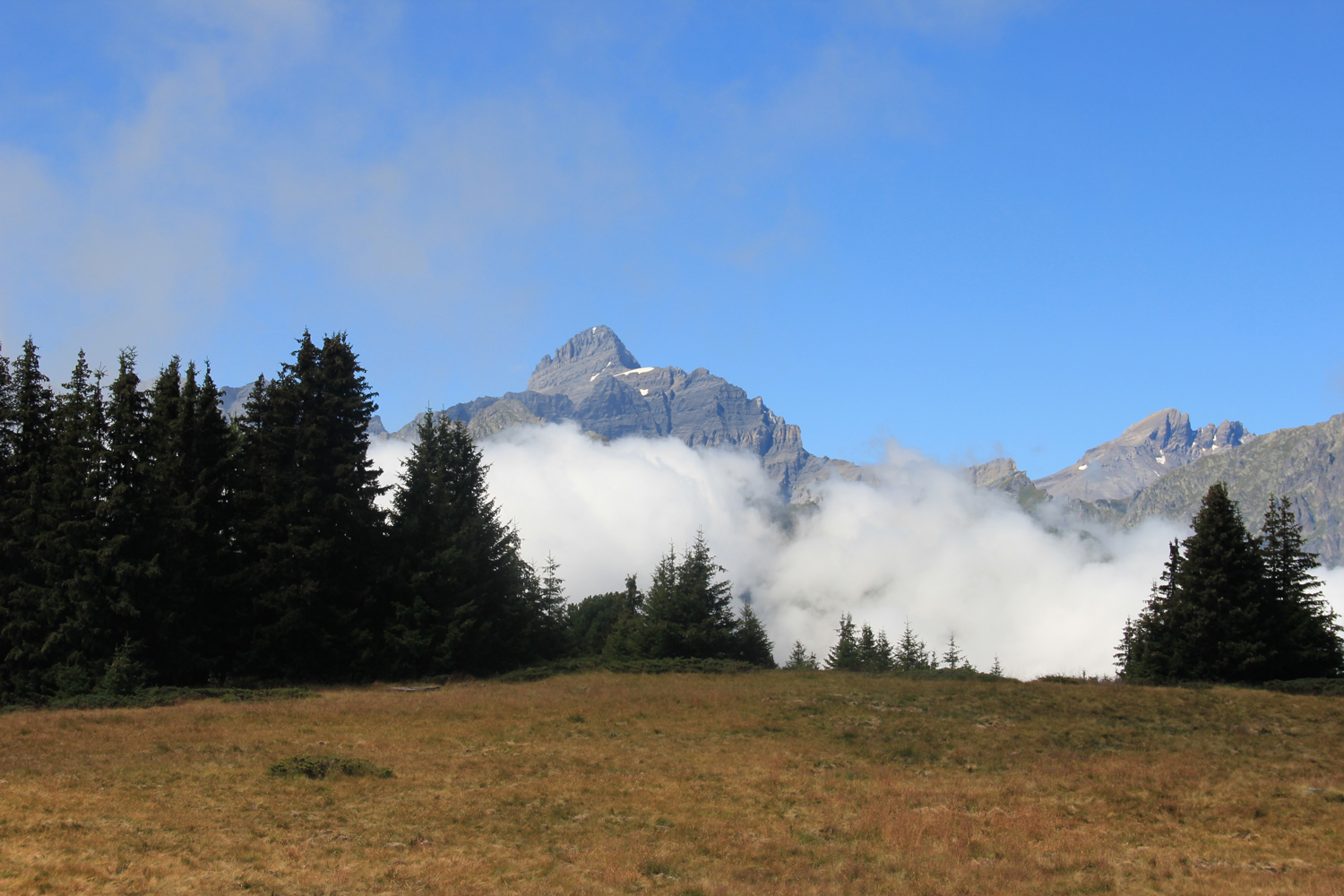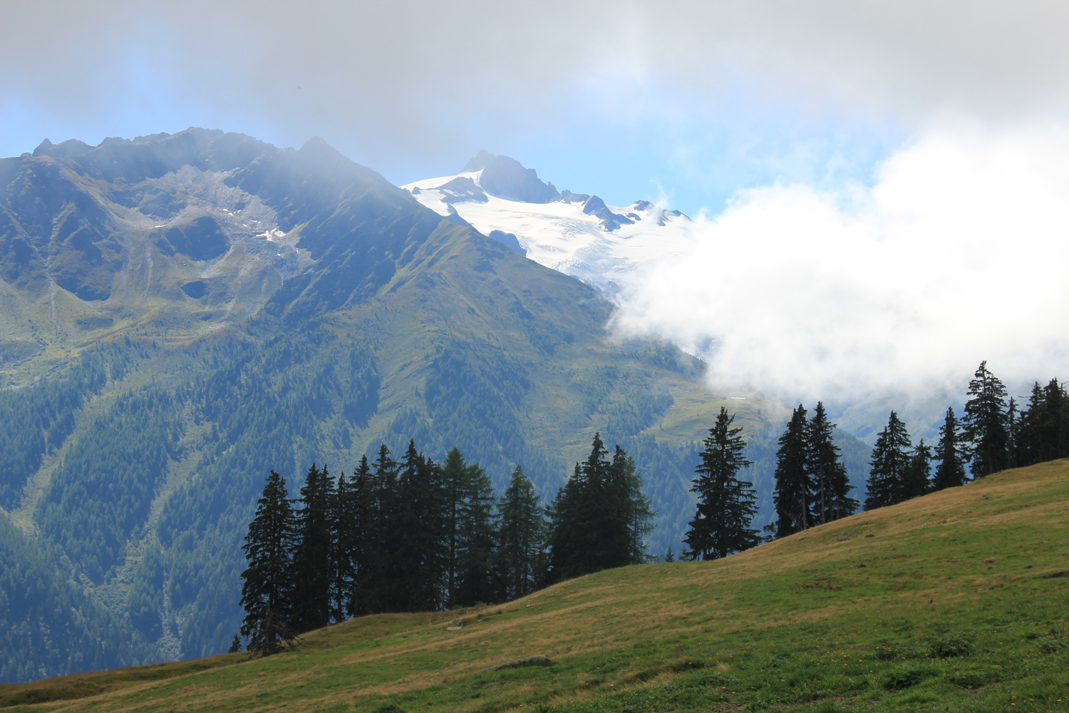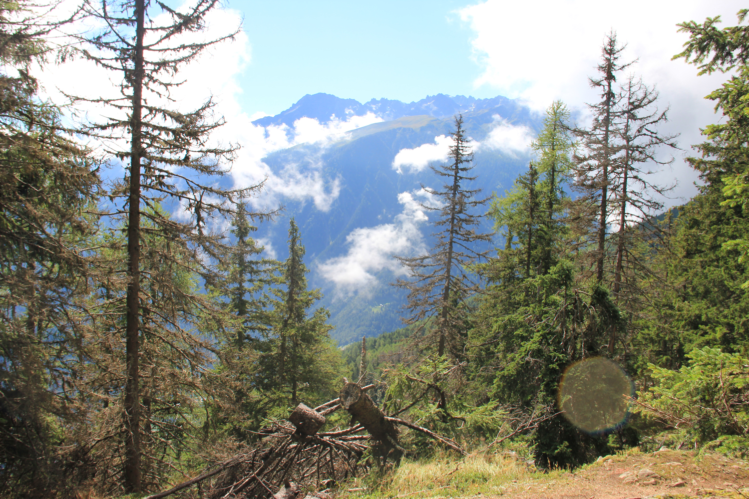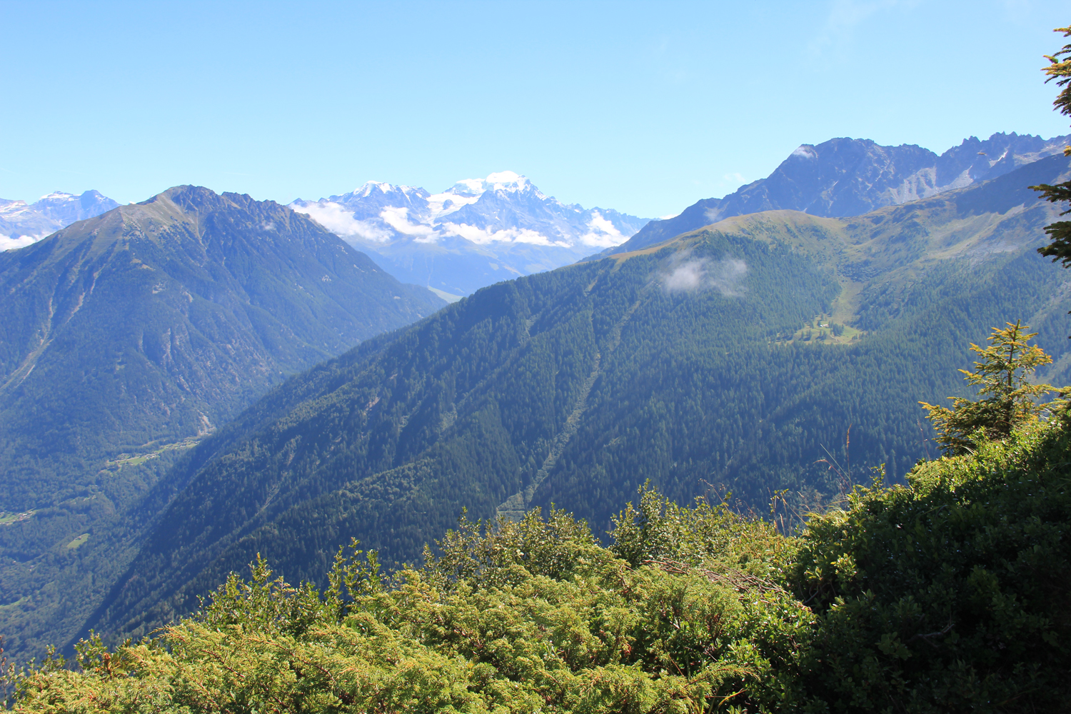 Nachdem ich während des gesamten Aufstiegs nur zwei weitere Bergwanderer getroffen habe, bin ich nicht mehr überrascht, auch auf dem Gipfel allein zu sein. Das Wetter ist ganz ordentlich, nur die Fernsicht ist durch Dunst etwas eingeschränkt, insbesondere in Richtung Mont Blanc. Nach längerer Gipfelpause steige ich auf einem relativ steilen Waldweg ab zum Col de la Forclaz, wo es eine Busverbindung nach Martigny gibt.