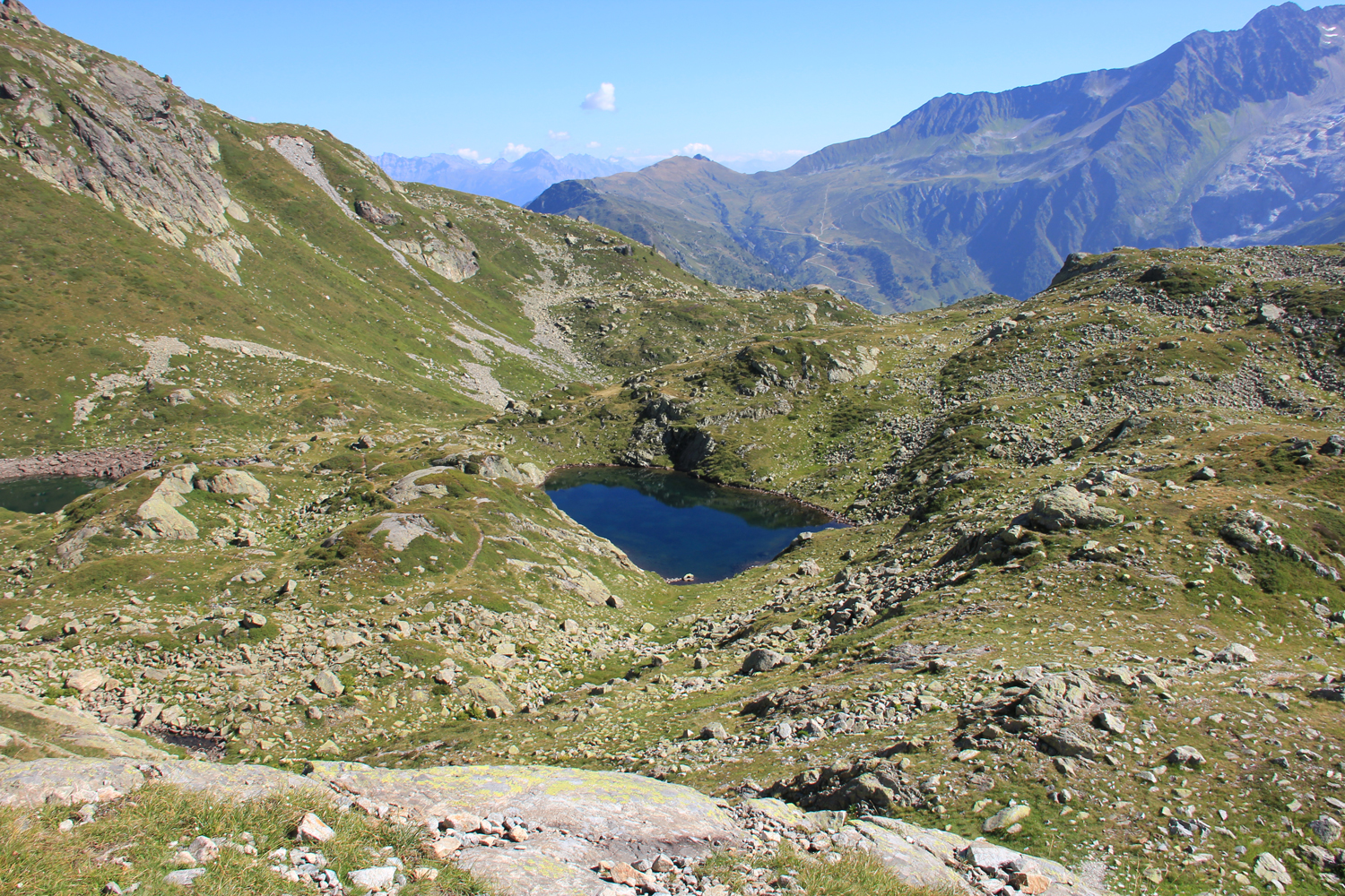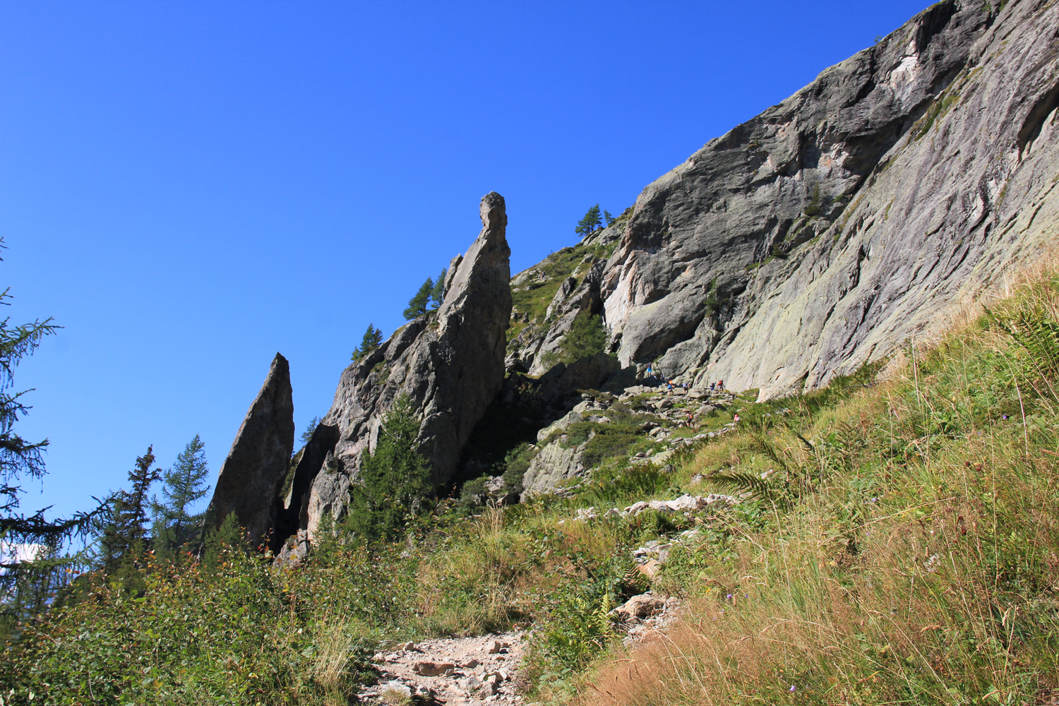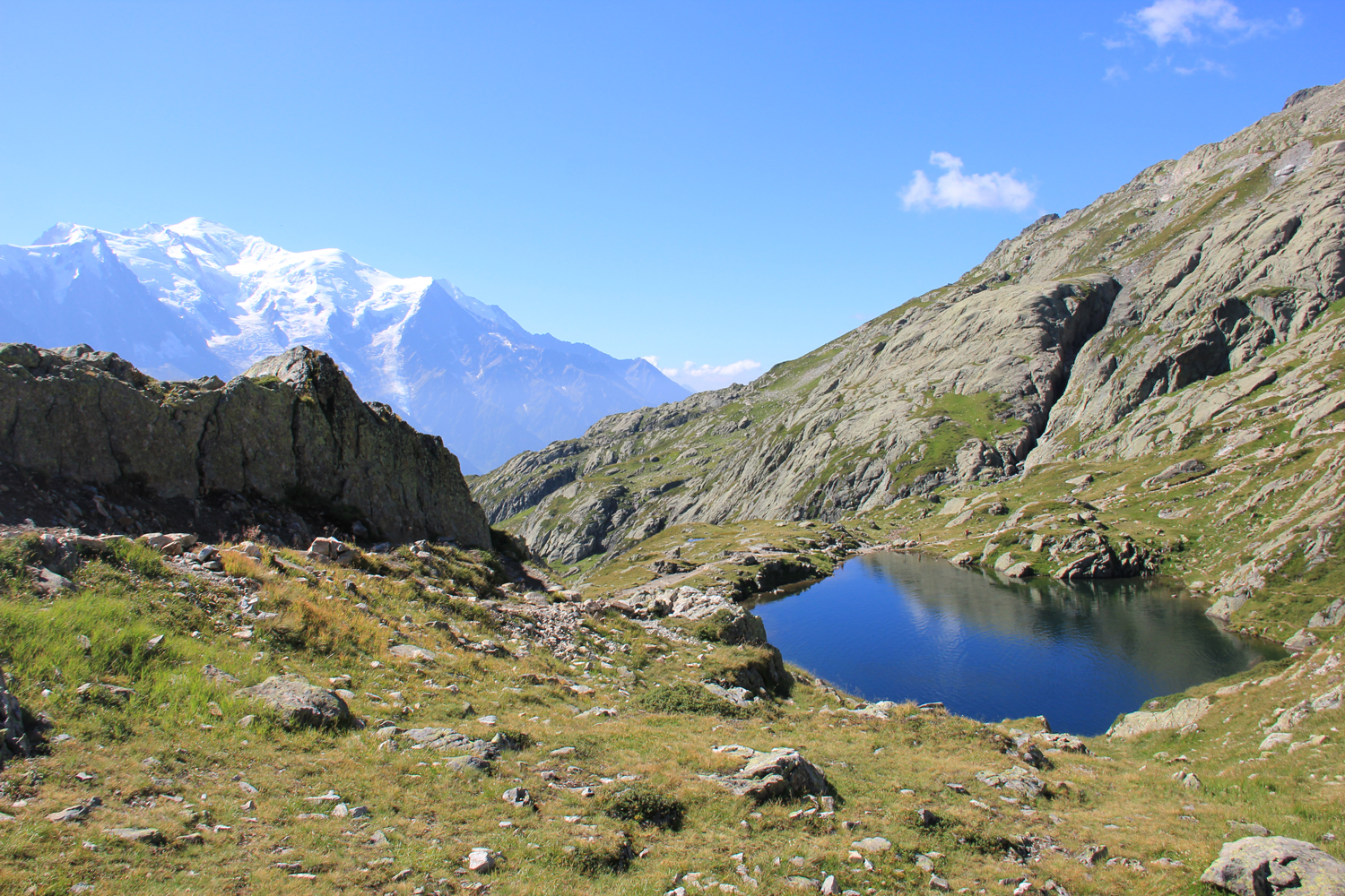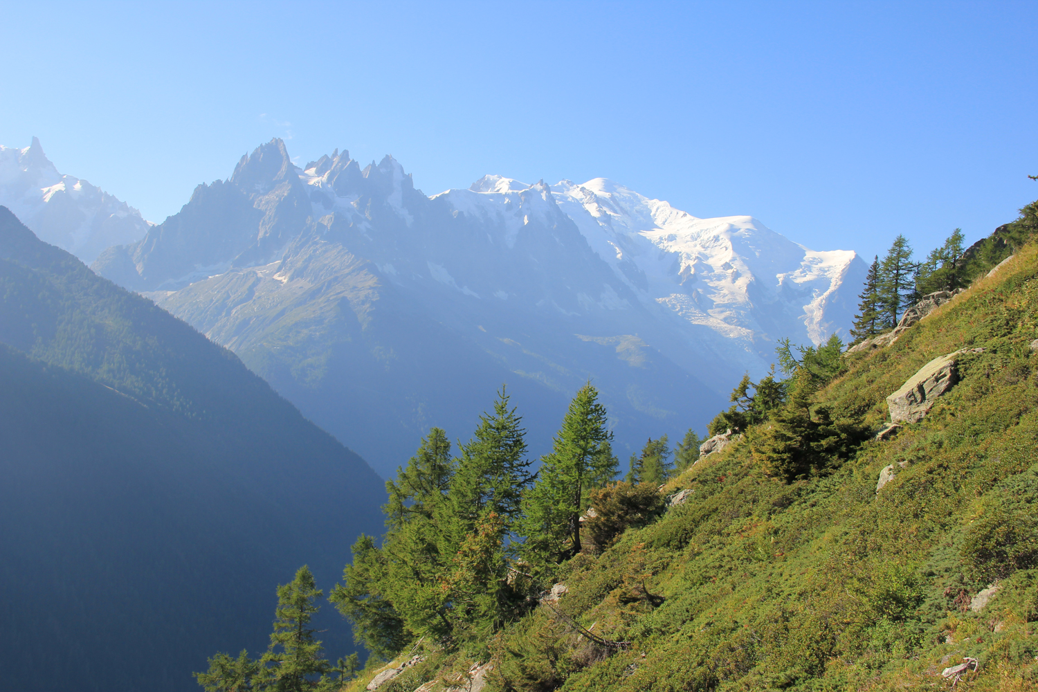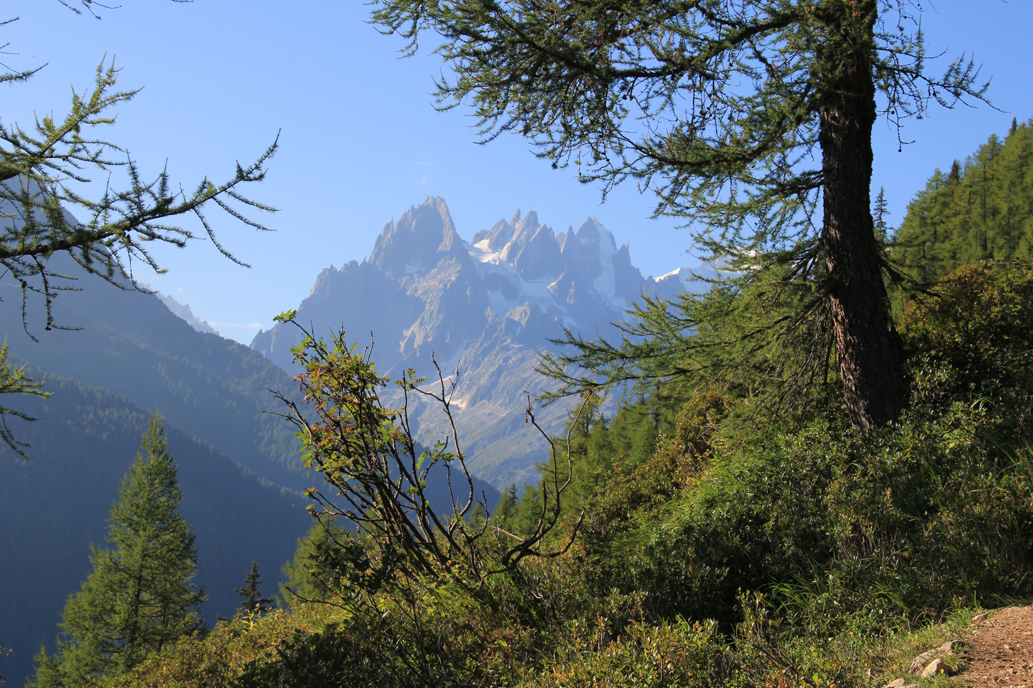Da ich in Chamonix übernachtet habe, nehme ich den Bus nach Montroc, um an meine gestrige Tour anzuschließen. Der Aufstieg geht durch lichten Lärchenwald, schon jetzt bieten sich schöne Ausblicke auf den Argentière-Gletscher und die benachbarten Berge, insbesondere auf die Aiguille Verte. Die schon erwähnte kurze Kletterstelle bietet zusätzliche Abwechslung. Das Gelände wird immer freier, es geht hoch zur Hütte am reizvoll gelegenen Lac Blanc.