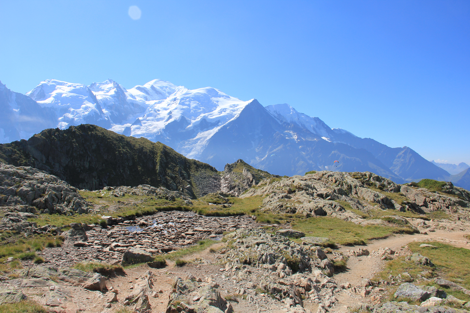 Da ich in Chamonix übernachtet habe, nehme ich die Seilbahn, um wieder zur Station Planpraz zu gelangen. Erinnerungen an einen wunderbaren Tandem-Gleitschirmflug (Planpraz - Chamonix) vor vielen Jahren werden wieder wach. Da der direkte Weg zum Brévent-Gipfel nicht besonders reizvoll ist, wähle ich den Umweg über den Col du Brévent. Von hier kann man, gelegentlich in einfacher Kletterei, die aber kaum über T3 hinausgeht, den Gipfel erreichen.