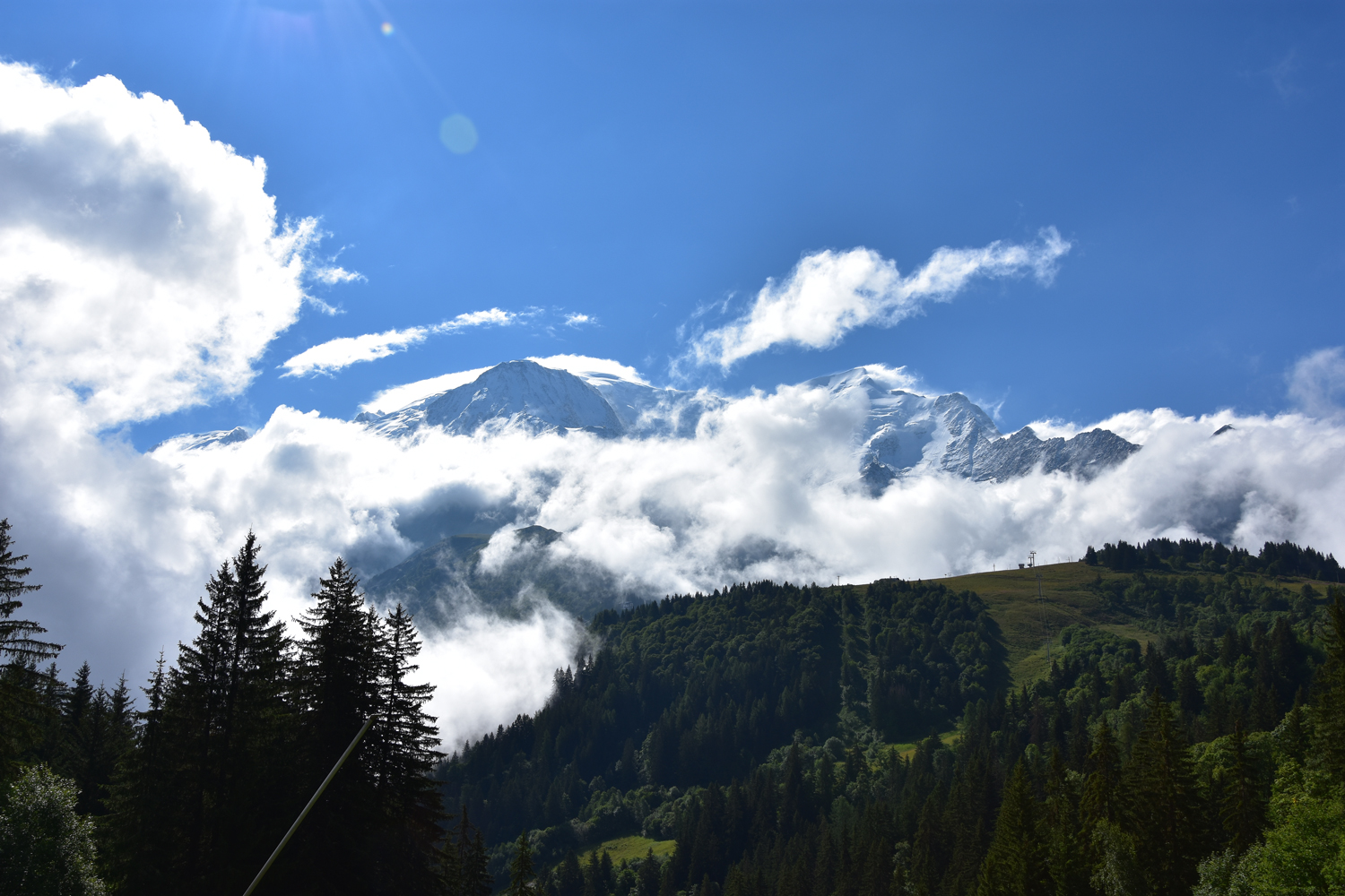 Der erste Teil der Etappe, der Aufstieg zum Col de Voza, ist nicht gerade spektakulär. Da macht es nichts aus, dass der Himmel noch wolkenverhangen ist. Als ich am Col de Voza, einem Haltepunkt des Tramway du Mont Blanc, ankomme, haben die Wolken erfreulicherweise den Blick auf die Aiguille de Bionnassay freigegeben.