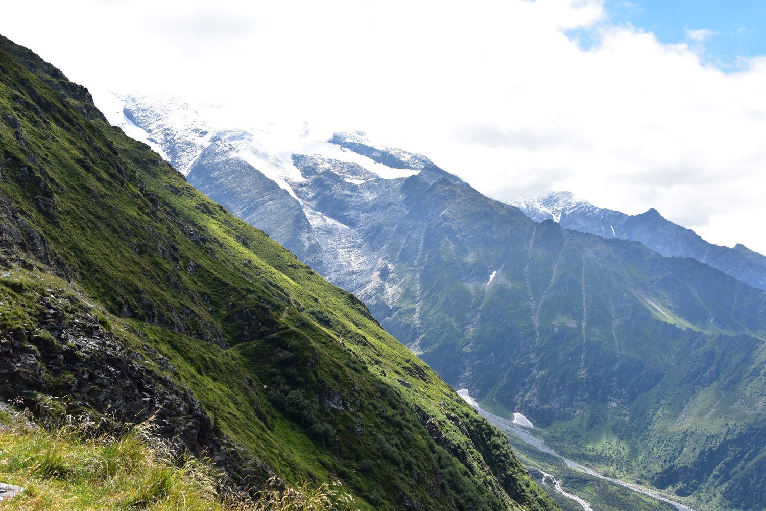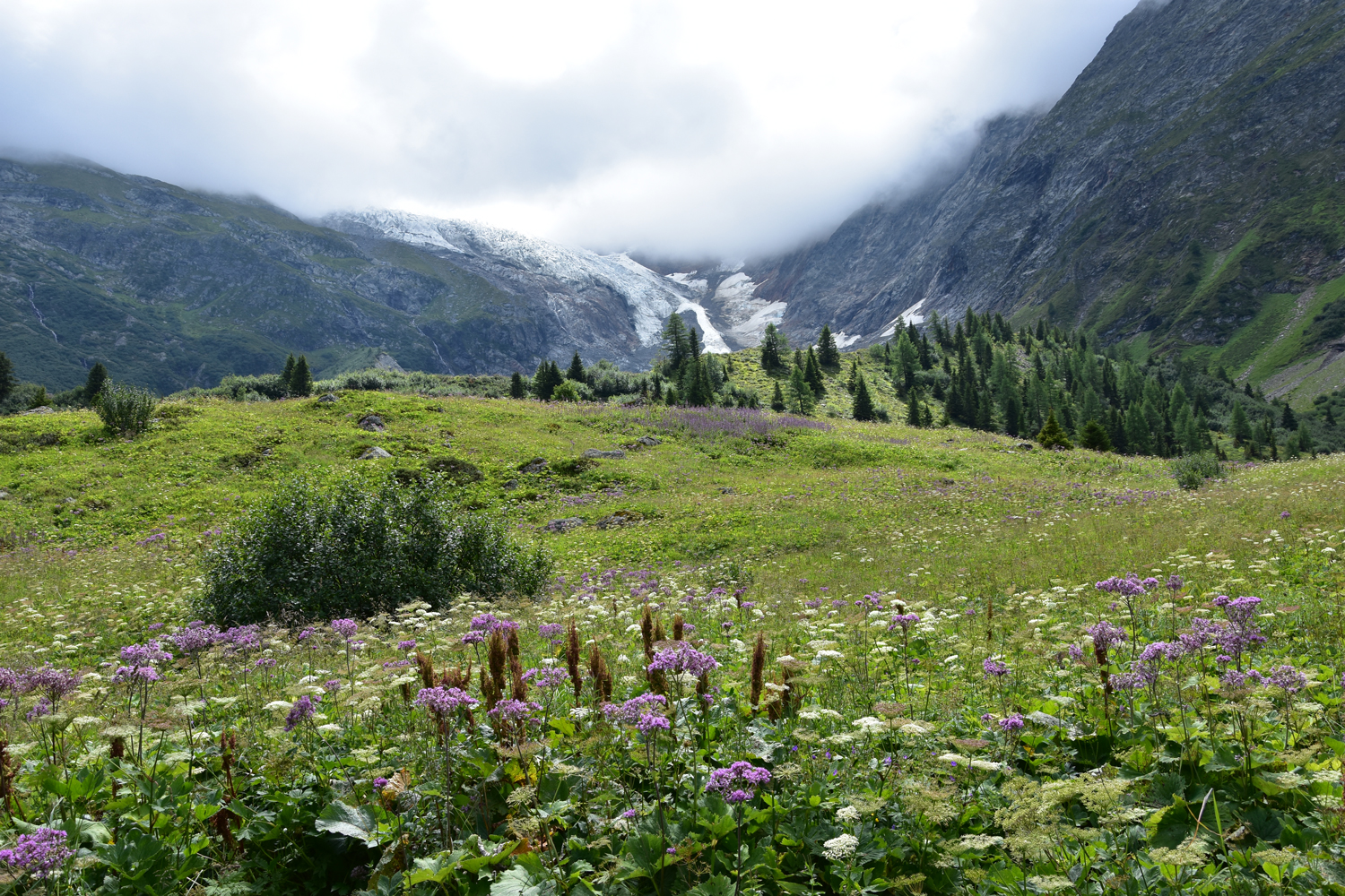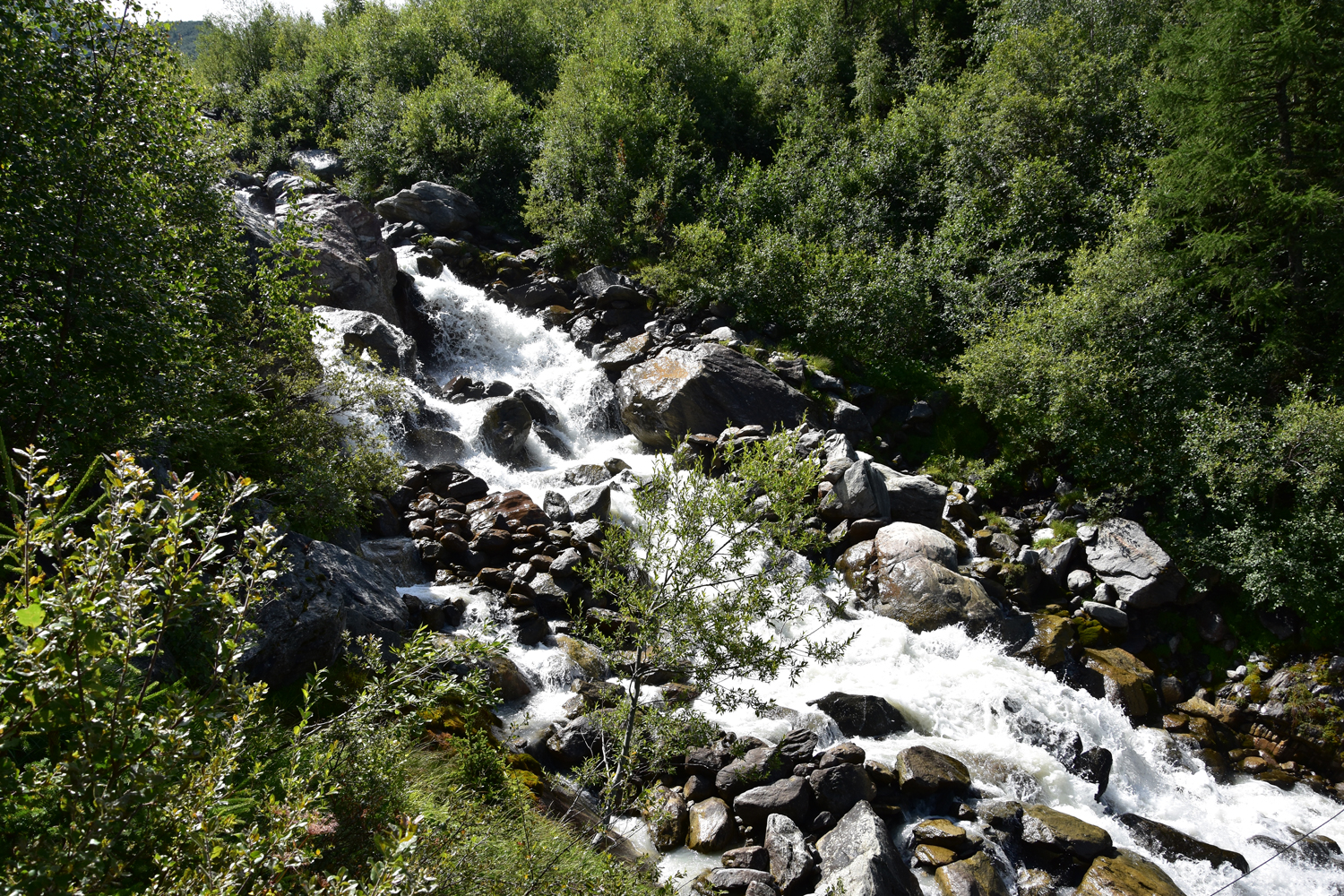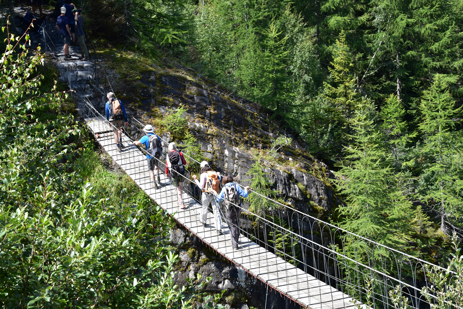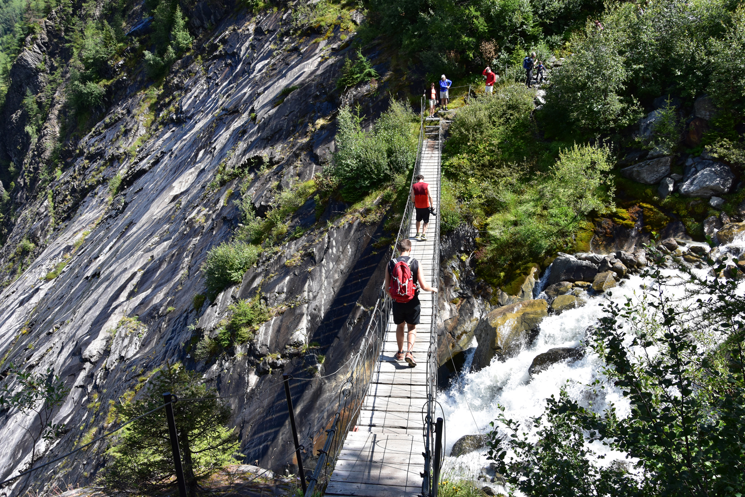 Ab hier nehme ich eine Variante des GR 5, die zunächst parallel zu den Bahngleisen verläuft, dann aber nach Süden abbiegt. An einigen Stellen des Weges muss man sogar die Hände zu Hilfe nehmen. Auf einer Hängebrücke wird der reißende Torrent de Bionnassay überquert. Hier gibt es einen richtigen Stau, da praktisch jeder Begeher der Brücke Fotos macht. Über Wiesengelände steige ich an zum höchsten Punkt der heutigen Tour, dem Col de Tricot.