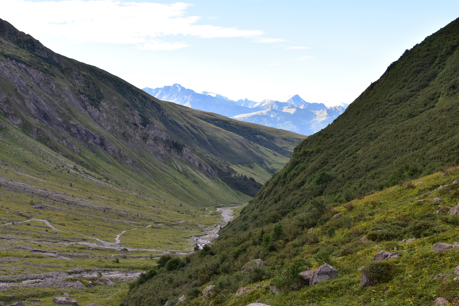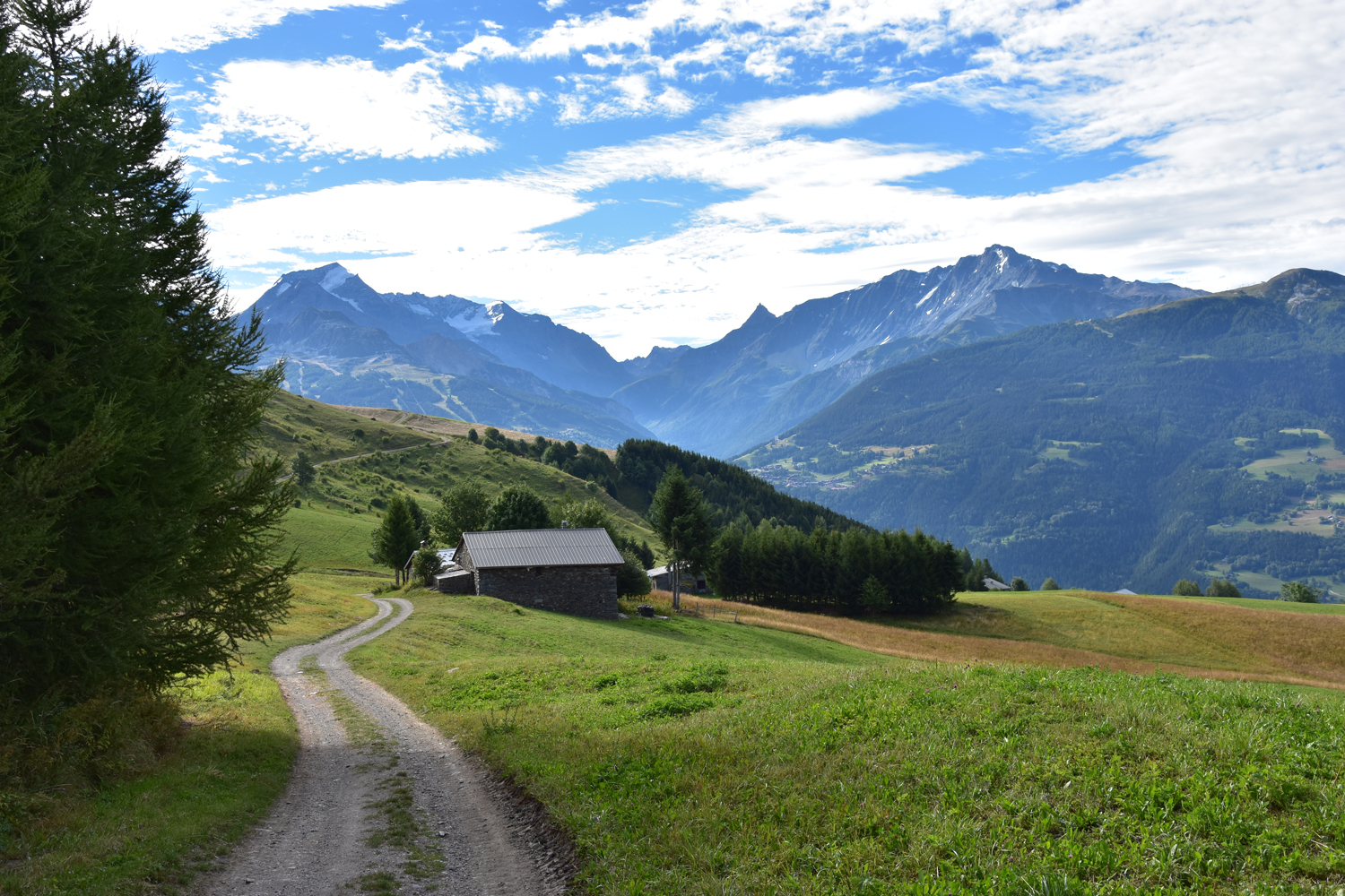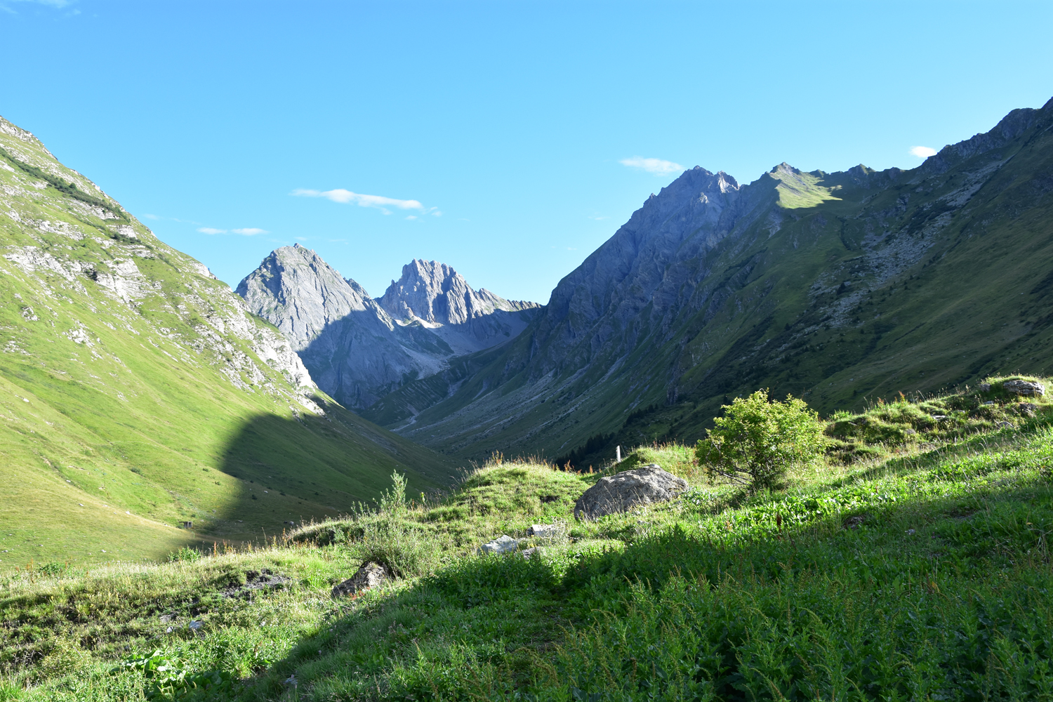 Auf meiner Weitwanderung in Richtung Mittelmeer steht heute im Wesentlichen nur Abstieg auf dem Programm. Auf einem ganz einfachen Weg steige ich vom Refuge de la Balme nach Süden ab. Im Rückblick ist noch einmal der Felsgipfel Pierra Menta zu bestaunen. Nach etwa zwei Stunden erreiche ich das Dorf Valezan, das sehr schön auf der Sonnenseite des Isère-Tales gelegen ist. Für den restlichen Abstieg ins Tal bietet sich ein schmaler Pfad in Richtung Bellentre an.
