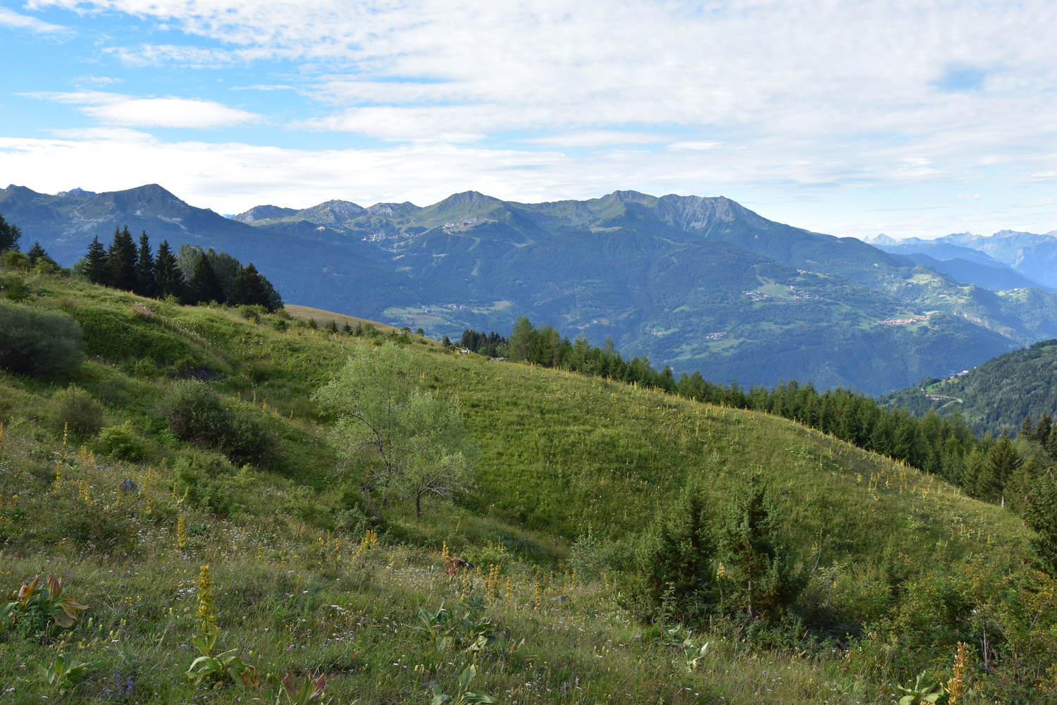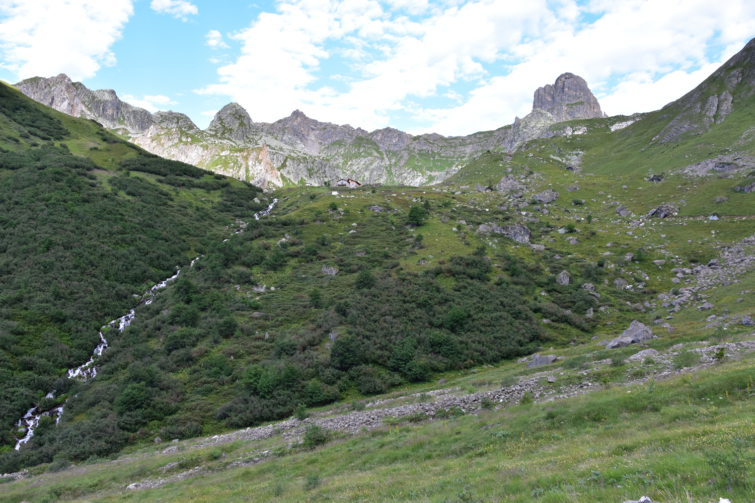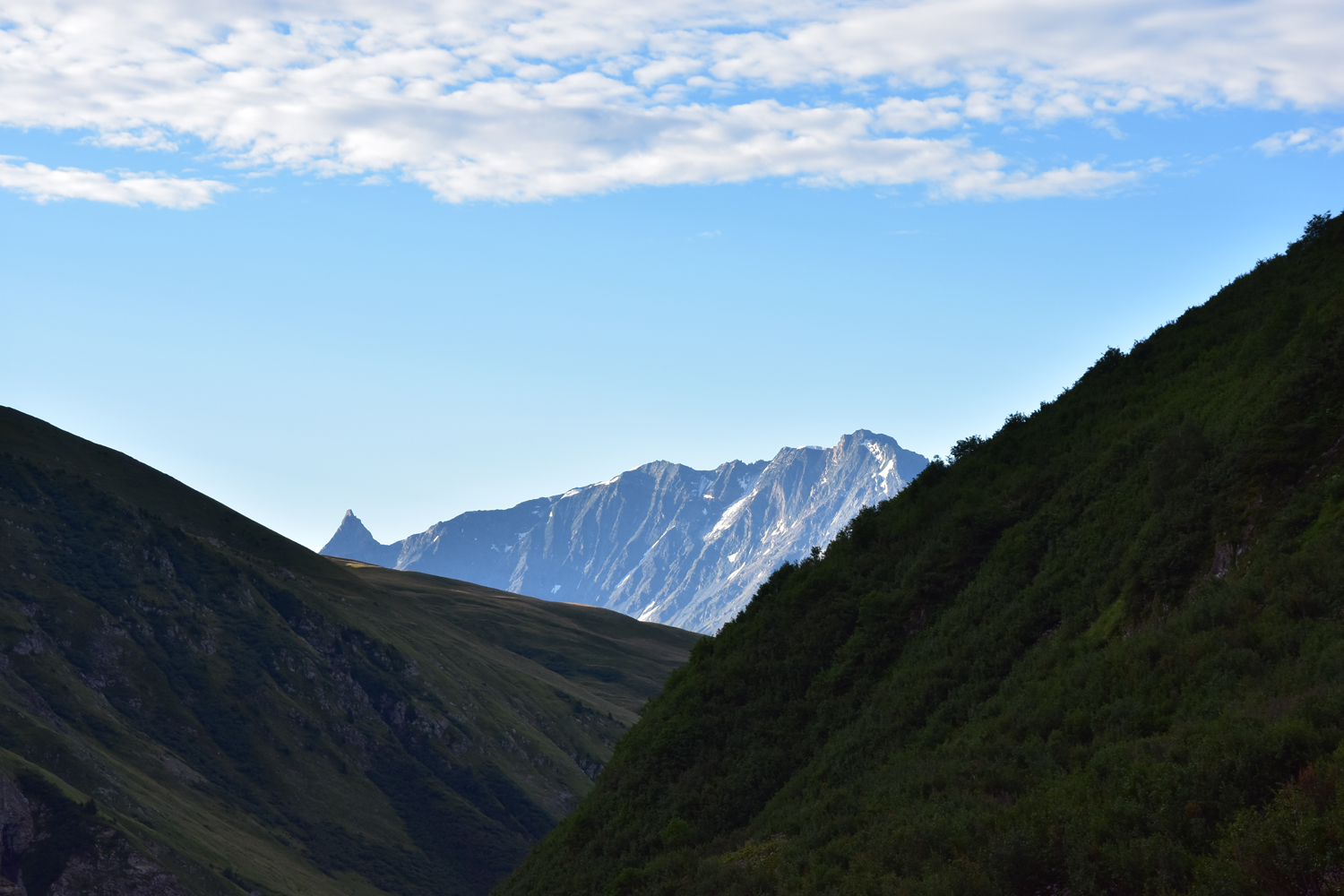 Auf meiner Weitwanderung in Richtung Mittelmeer steht heute im Wesentlichen nur Abstieg auf dem Programm. Auf einem ganz einfachen Weg steige ich vom Refuge de la Balme nach Süden ab. Im Rückblick ist noch einmal der Felsgipfel Pierra Menta zu bestaunen. Nach etwa zwei Stunden erreiche ich das Dorf Valezan, das sehr schön auf der Sonnenseite des Isère-Tales gelegen ist. Für den restlichen Abstieg ins Tal bietet sich ein schmaler Pfad in Richtung Bellentre an.