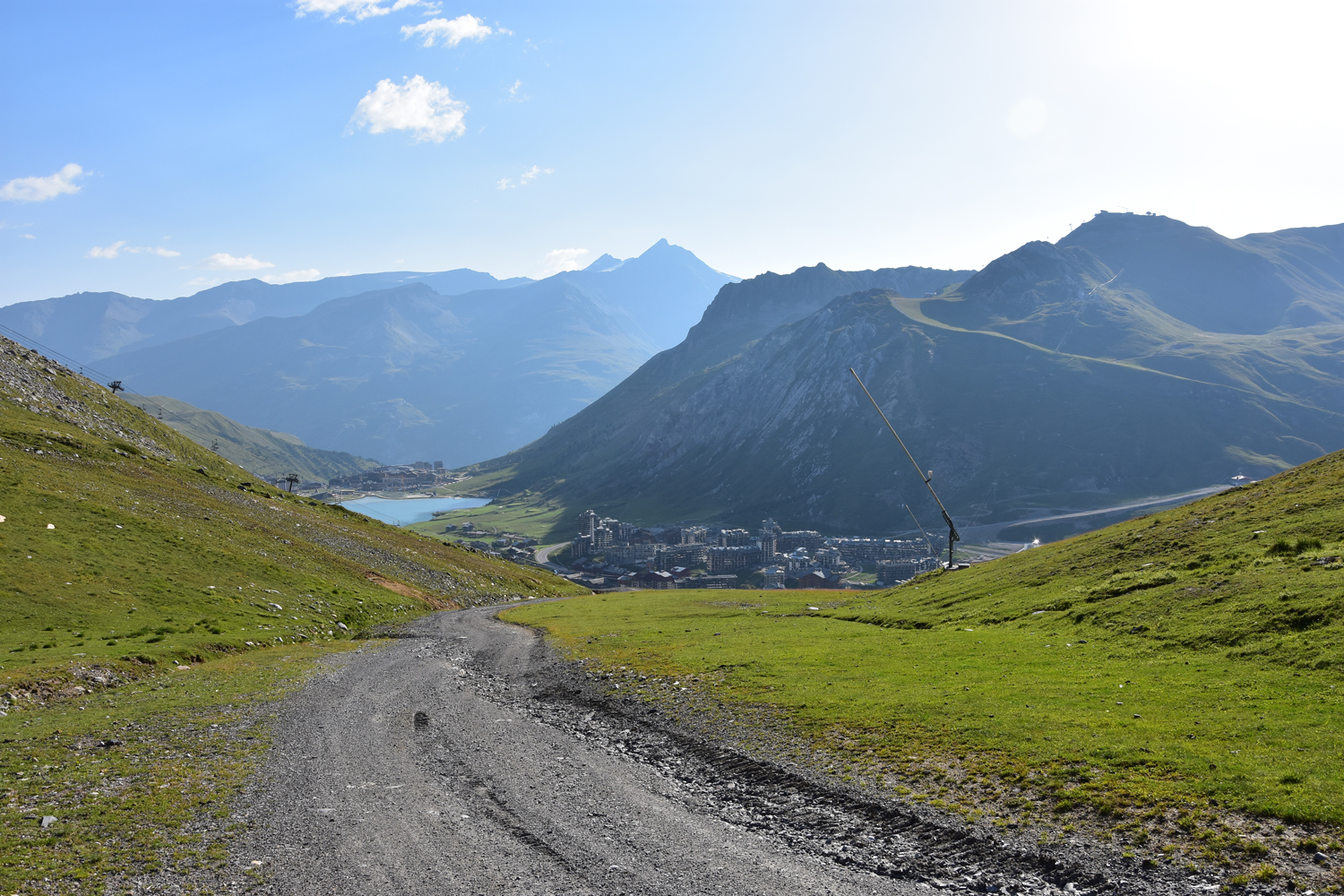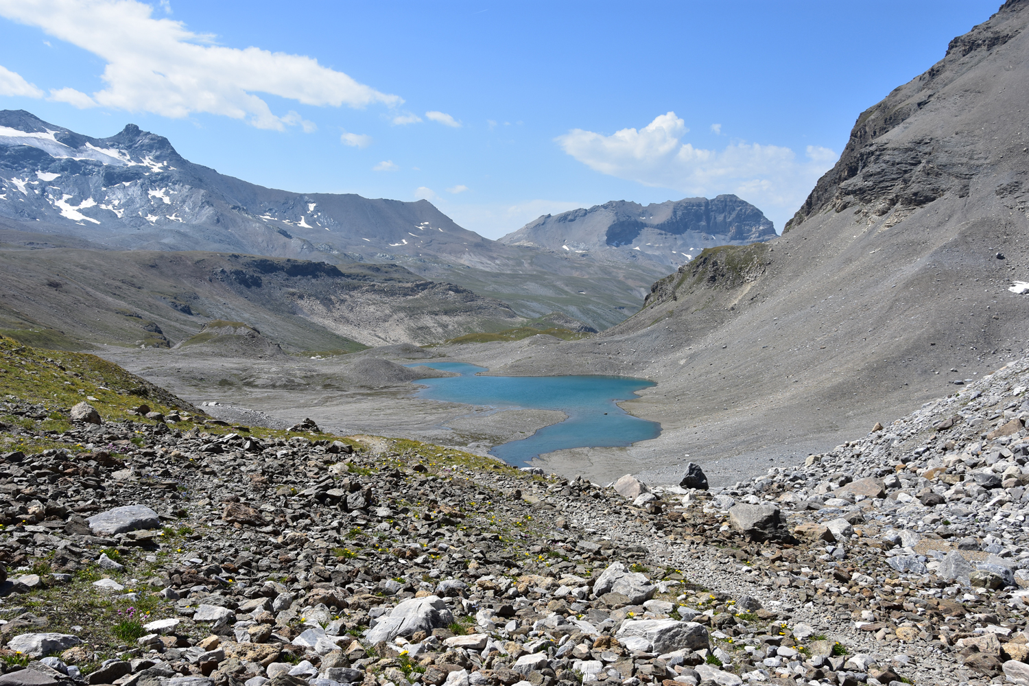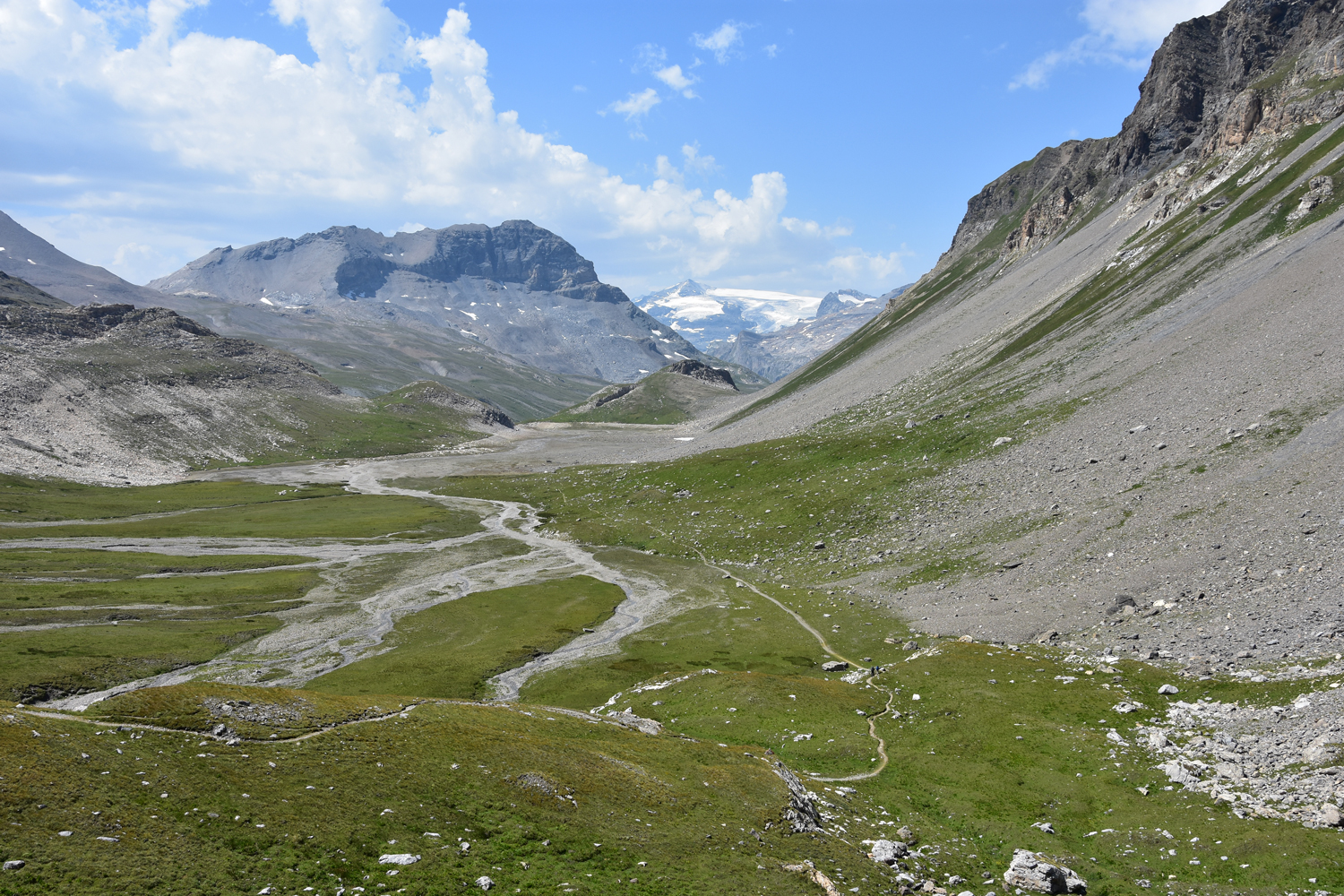 Ein Abstieg von rund 500 Höhenmetern über sommerliche Skipisten bringt mich nach Val Claret. Hier verlasse ich den GR 5; die nächsten drei Tage werde ich auf dem GR 55 unterwegs sein. Der anschließende Wiederaufstieg verläuft zunächst parallel zu einem Sessellift; erst ab etwa 2500 m Höhe kann man wieder richtig die Natur genießen. Ein bequemer, flacher Wanderweg führt zum höchsten Punkt des heutigen Tages, dem Col de la Leisse. Eigentlich wäre hier eine längere Pause geplant gewesen, aber es bläst ein recht starker Wind, und geschützte Plätze gibt es in Passnähe wohl keine. Daher wandere ich noch ein gutes Stück in südwestlicher Richtung, bis ich die Mittagspause nachholen kann.