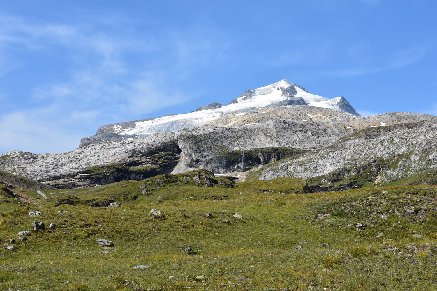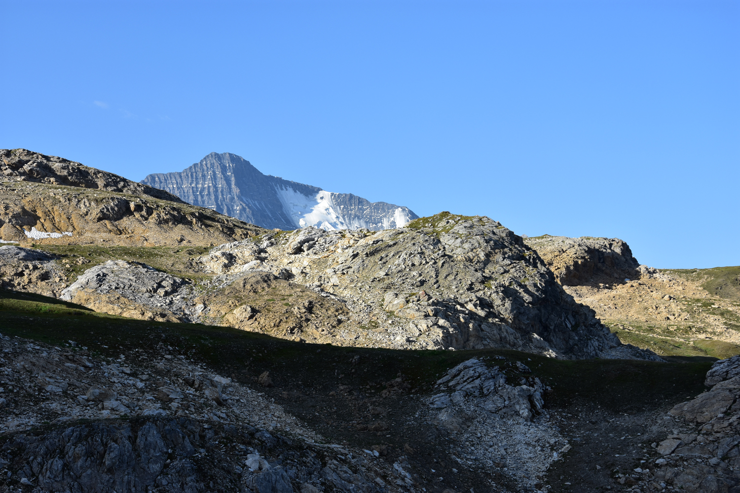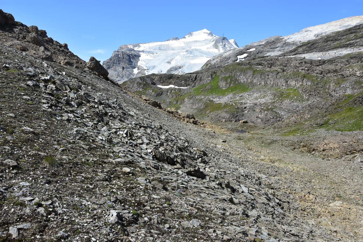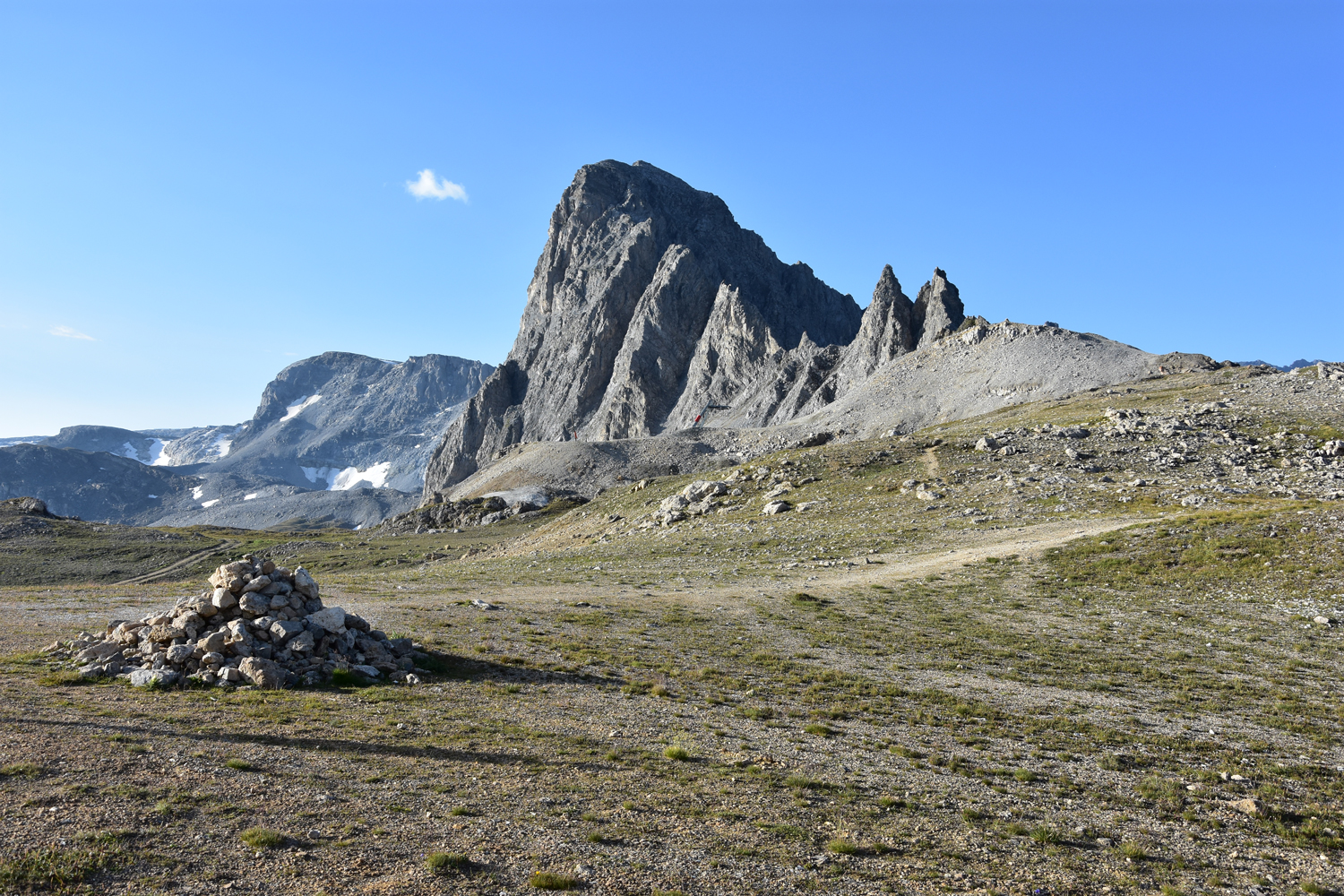 Ein Abstieg von rund 500 Höhenmetern über sommerliche Skipisten bringt mich nach Val Claret. Hier verlasse ich den GR 5; die nächsten drei Tage werde ich auf dem GR 55 unterwegs sein. Der anschließende Wiederaufstieg verläuft zunächst parallel zu einem Sessellift; erst ab etwa 2500 m Höhe kann man wieder richtig die Natur genießen. Ein bequemer, flacher Wanderweg führt zum höchsten Punkt des heutigen Tages, dem Col de la Leisse. Eigentlich wäre hier eine längere Pause geplant gewesen, aber es bläst ein recht starker Wind, und geschützte Plätze gibt es in Passnähe wohl keine. Daher wandere ich noch ein gutes Stück in südwestlicher Richtung, bis ich die Mittagspause nachholen kann.