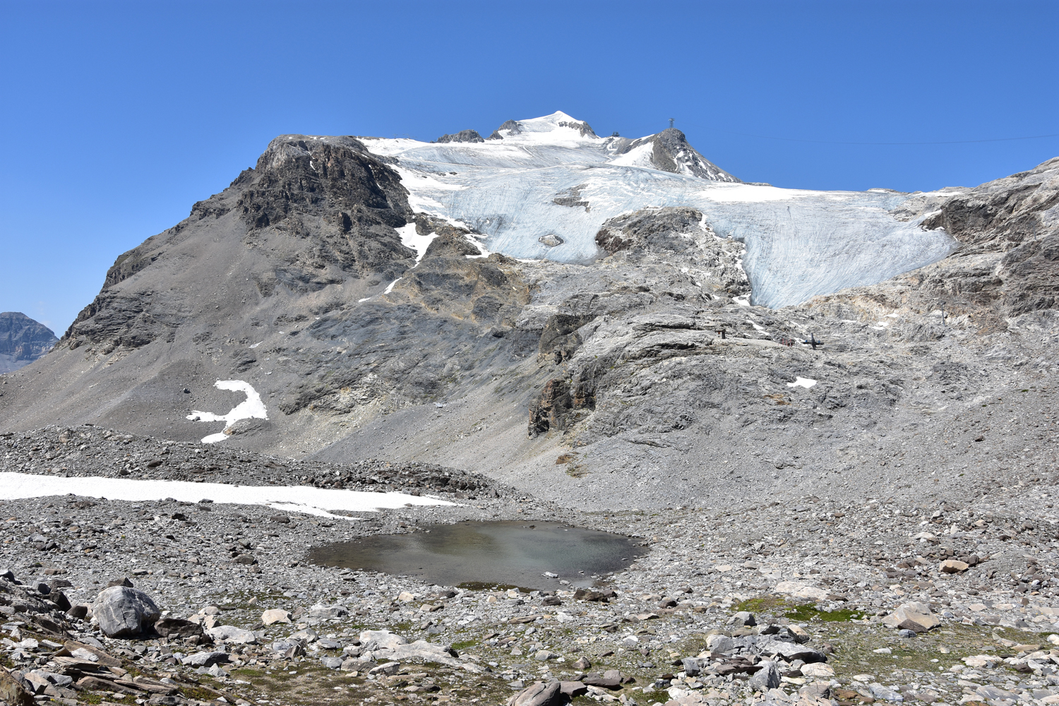 Auf den nächsten zwei Etappen meiner Weitwanderung werde ich im Wesentlichen die Grande Casse, einen gewaltigen Berg von 3855 m Höhe, umrunden (jedenfalls beinahe). Den Aufstieg vom Refuge Col du Palet zum namengebenden Pass (Col du Palet) kenne ich schon von meinem gestrigen Ausflug. Nach gut 10 Minuten ist der Pass erreicht. Nicht alles, was auf der anderen Seite zu sehen ist, weckt Begeisterung. Die Hotels und Lifte der Skiorte Tignes Le Lac und Val Claret sind kein besonders schöner Anblick.