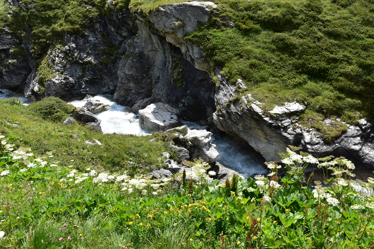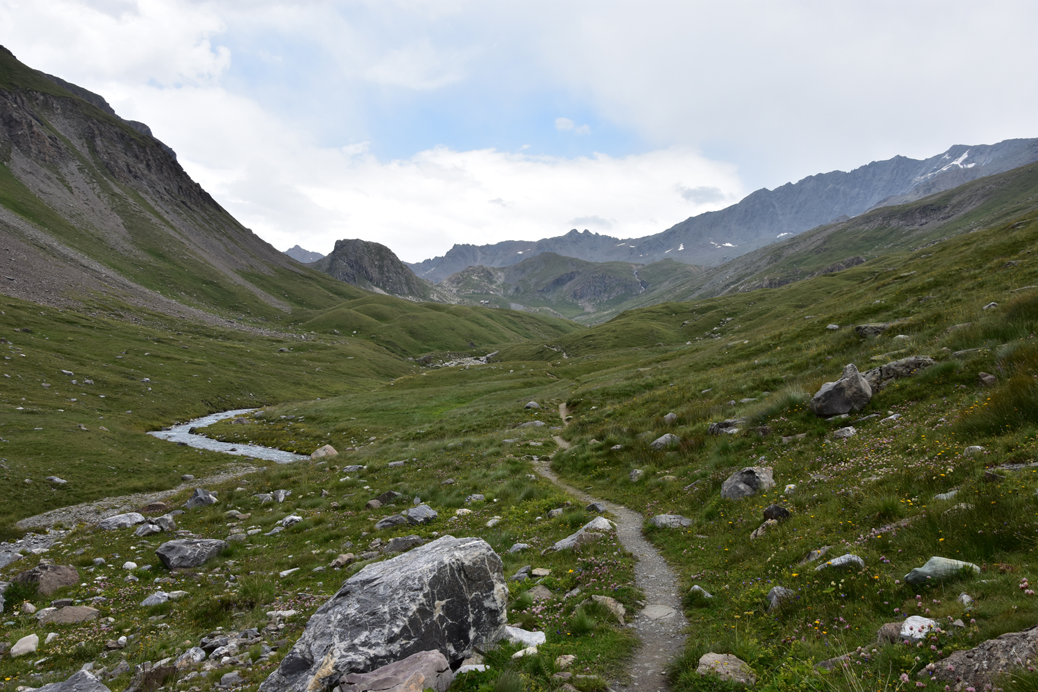 Der Abstiegsweg, nach wie vor ausgesprochen flach, führt an einem schönen Bergsee vorbei, dem Lac des Nettes. Bald ist das Refuge de la Leisse erreicht, wo ich kurz einkehre. Allerdings sind inzwischen dunkle Wolken am Himmel aufgetaucht; ein Gewitter erscheint nicht ausgeschlossen. Trotzdem nehme ich den Weiterweg durch das reizvolle Tal des Torrent de la Leisse in Angriff. Es donnert einige Male, aber bald danach scheint wieder die Sonne. Der tiefste Punkt dieses Wegabschnitts ist die Brücke "Pont de Croé Vie". Hier biege ich nach links ab, um mein Tagesziel zu erreichen, das Refuge d'Entre Deux Eaux.